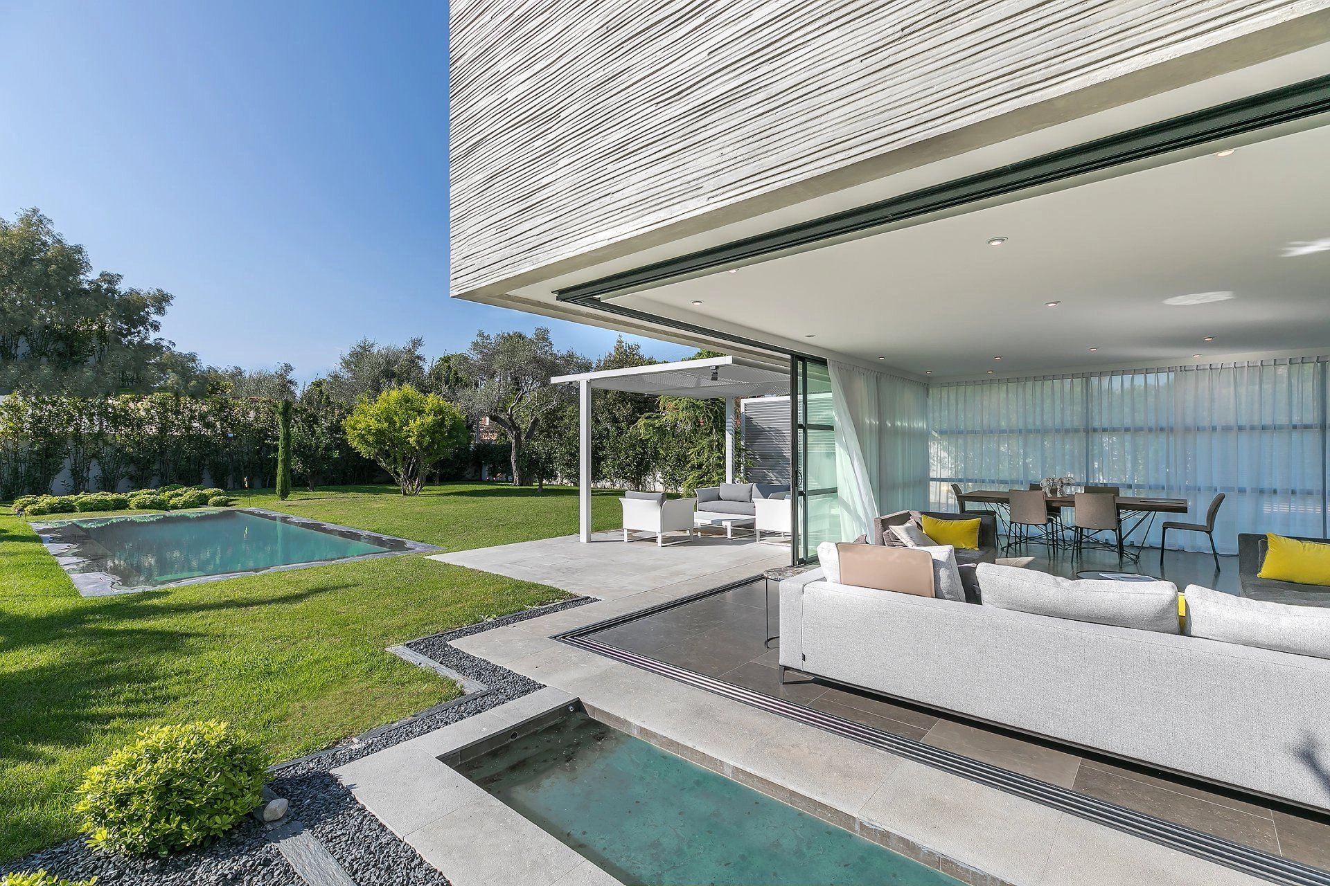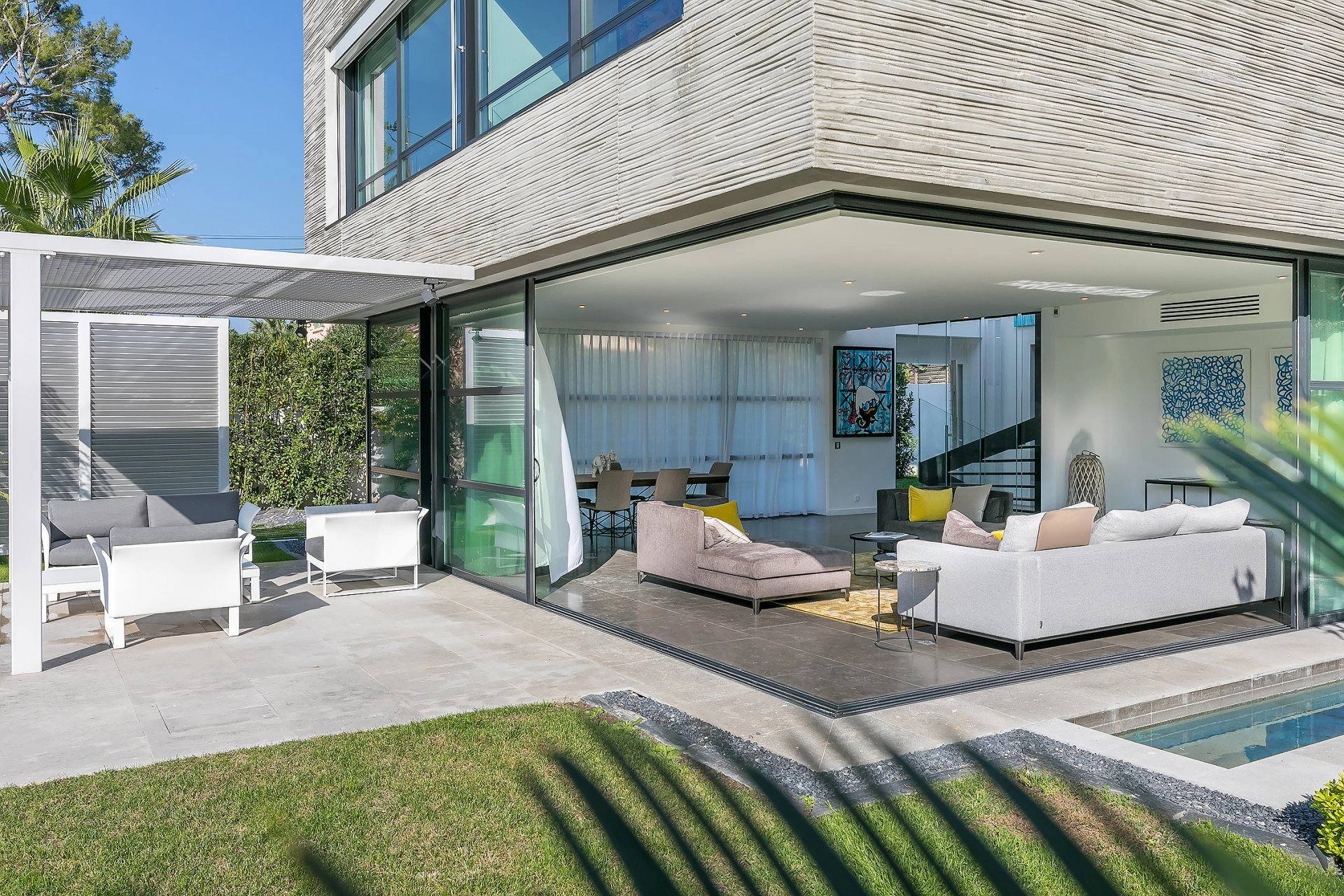 Amazing contemporary villa within a few minutes distance from the beach, with high level equipment and flawless design. The living areas are beautifully luminous and spacious. The villa features 5 bedrooms, wonderful solarium with sea view, great swimming pool, cellar. It would be possible to create a cinema or fitness room. 3 parking spaces outside.