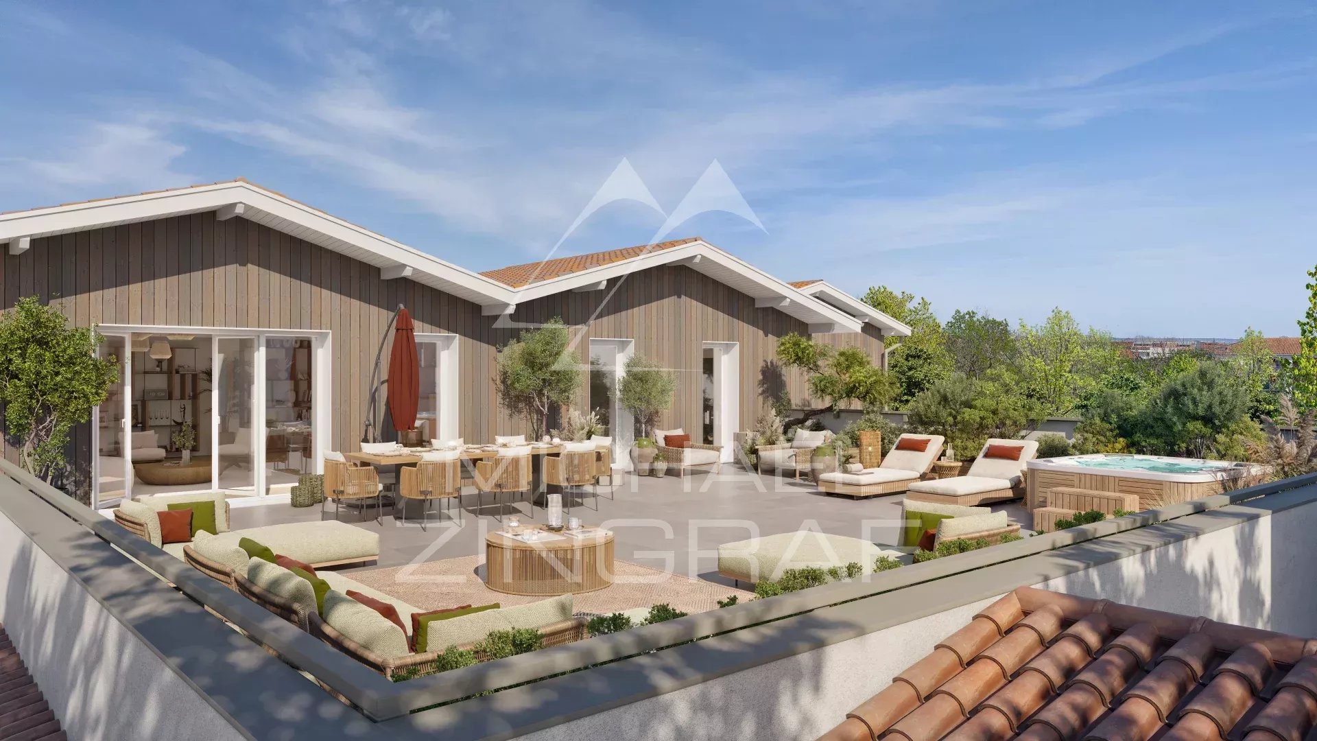 The Assalida residence is an exceptional property offering its future residents a T5 penthouse villa with unobstructed views and triple exposure. This unique property has a total area of 126.4 sqm, as well as a huge terrace of 90 sqm and two underground parking spaces. The modern residence is inspired by the "cabanes tchanquées" of the Arcachon basin and comprises 28 units. It is ideally located close to shops, the municipal market, and the harbor, providing a convenient and pleasant daily life. By car, the center of Arcachon is only 8 minutes away and the Dune du Pyla is 12 minutes away. The La Teste train station is also nearby, allowing for easy connection to Bordeaux Saint-Jean in just 45 minutes. The Assalida residence is scheduled to be delivered in the first quarter of 2027, offering a preserved and exceptional environment for future residents seeking peace and serenity.
