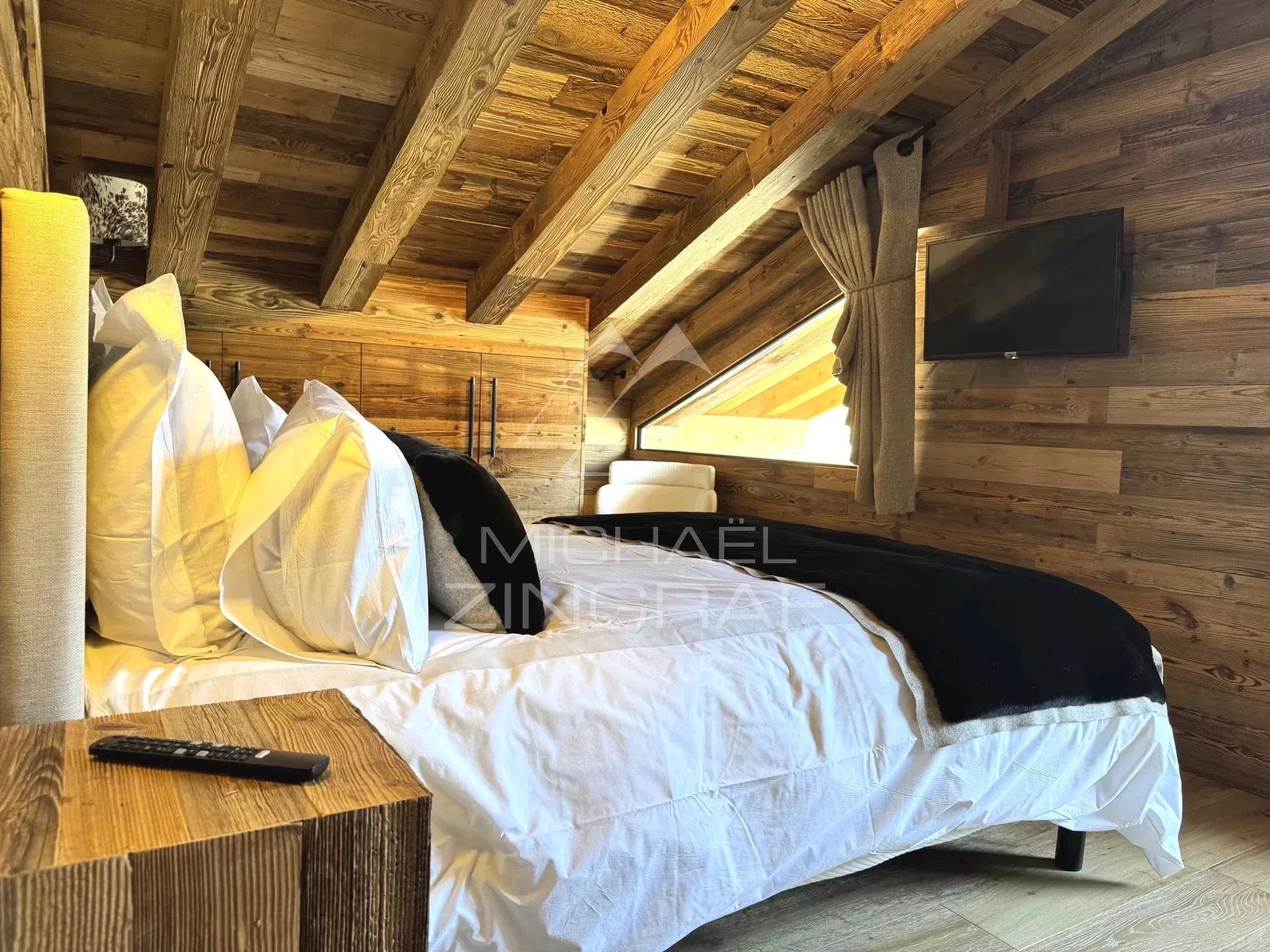 Michaël Zingraf Real Estate Megève offers you this sumptuous 290 m2 chalet, renovated with quality materials in a spirit of authenticity and comfort. Situated in a quiet area, with uninterrupted views, but within easy reach of Megève, this property combines the codes of the wooden chalet with design, offering a spacious living room, comprising a lounge-dining room with fireplace, and an open-plan fitted kitchen, opening onto a beautiful terrace and an outdoor jacuzzi. On three levels, it offers five bedrooms, including a children's dormitory, each with a private bathroom or shower room to welcome family and friends.