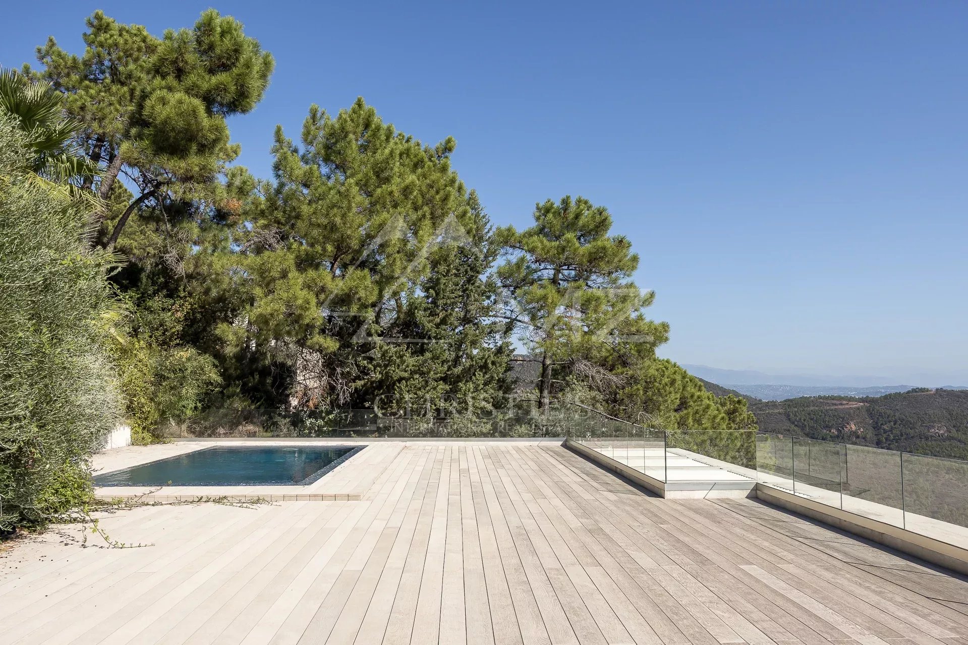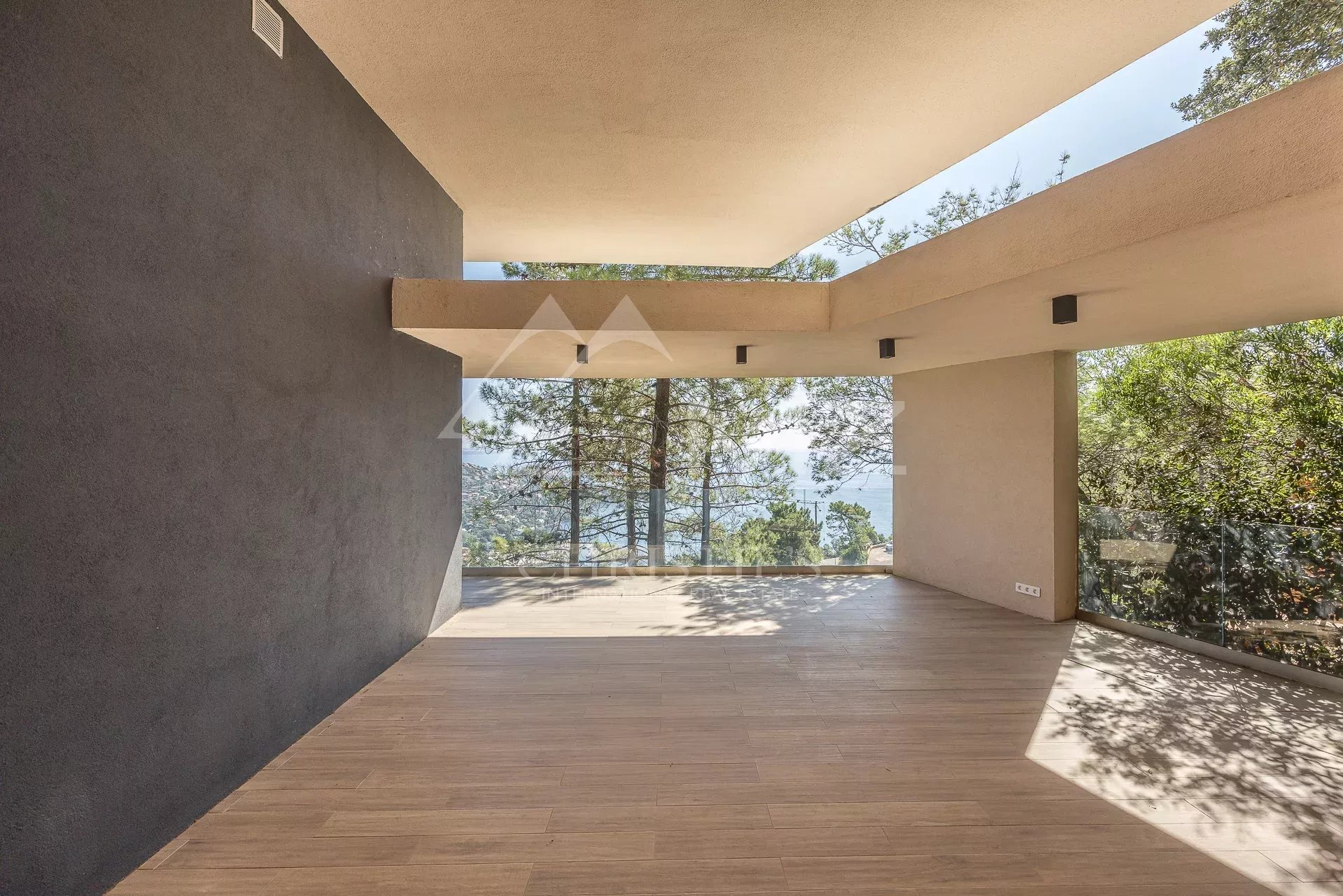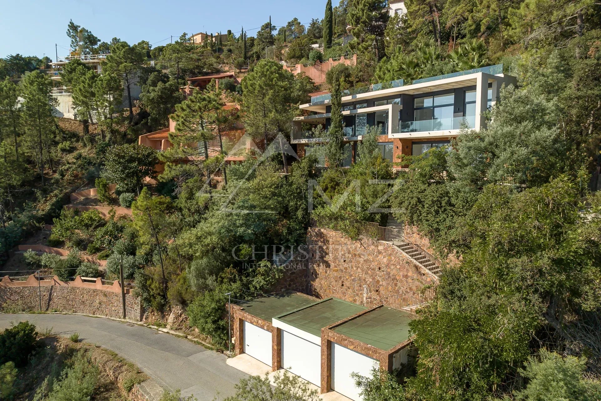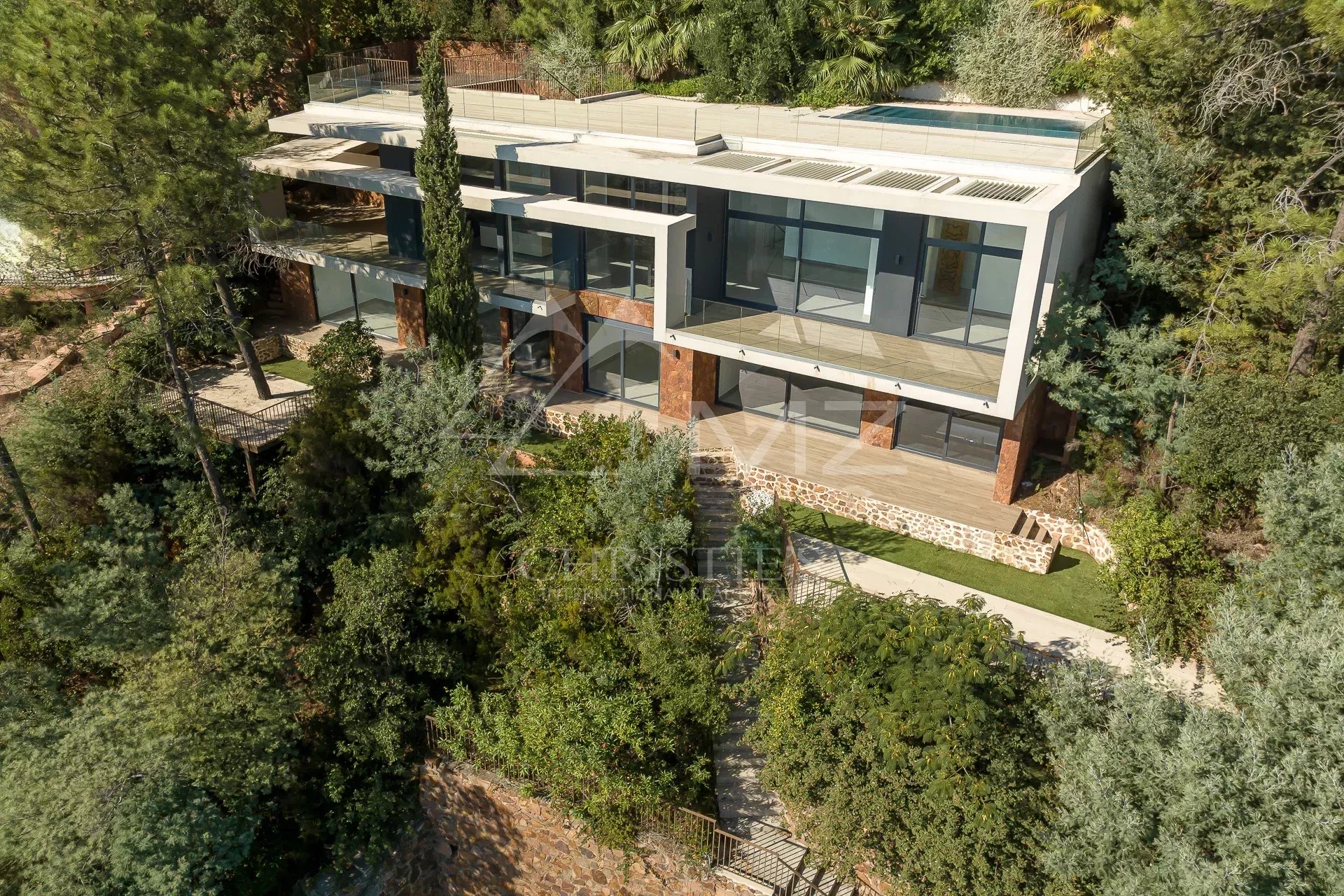 In a gated, secure estate overlooking the bay, this contemporary new villa, designed by a renowned architect, blends perfectly into the landscape. Built on 2 levels, it spans more than 300 sqm with its annexes. Quiet and out of sight, this 2-storey villa boasts 255 m2 of living space, including a very large living room with open kitchen and bedroom on the first floor and 4 other bedrooms, including a master bedroom and another bedroom with an independent access, on the garden level. The roof terrace boasts a swimming pool with breathtaking sea views. Three large garages complete this property located 5 minutes from the beaches and restaurants of Port de La Figueirette, 10 minutes from Théoule town center, 35 minutes from Cannes Croisette and 45 minutes from Nice airport.