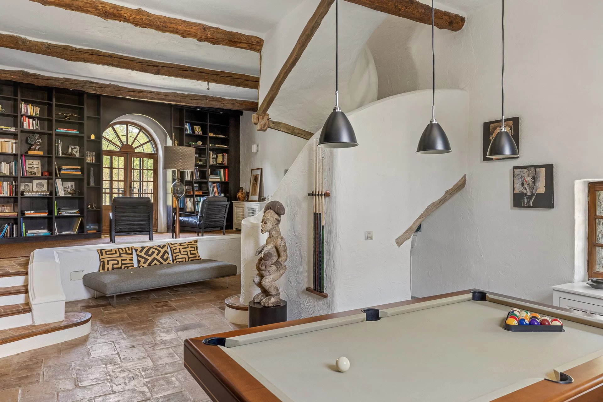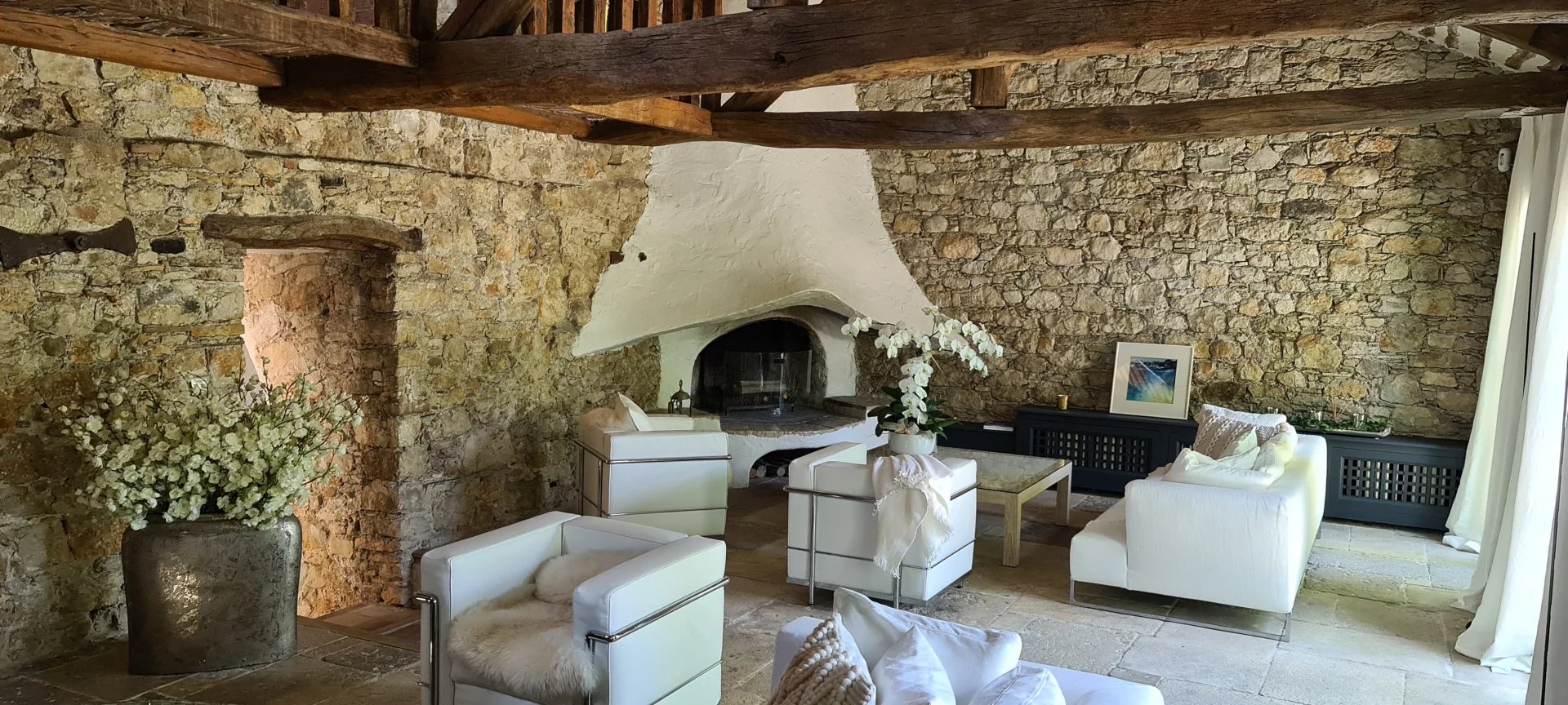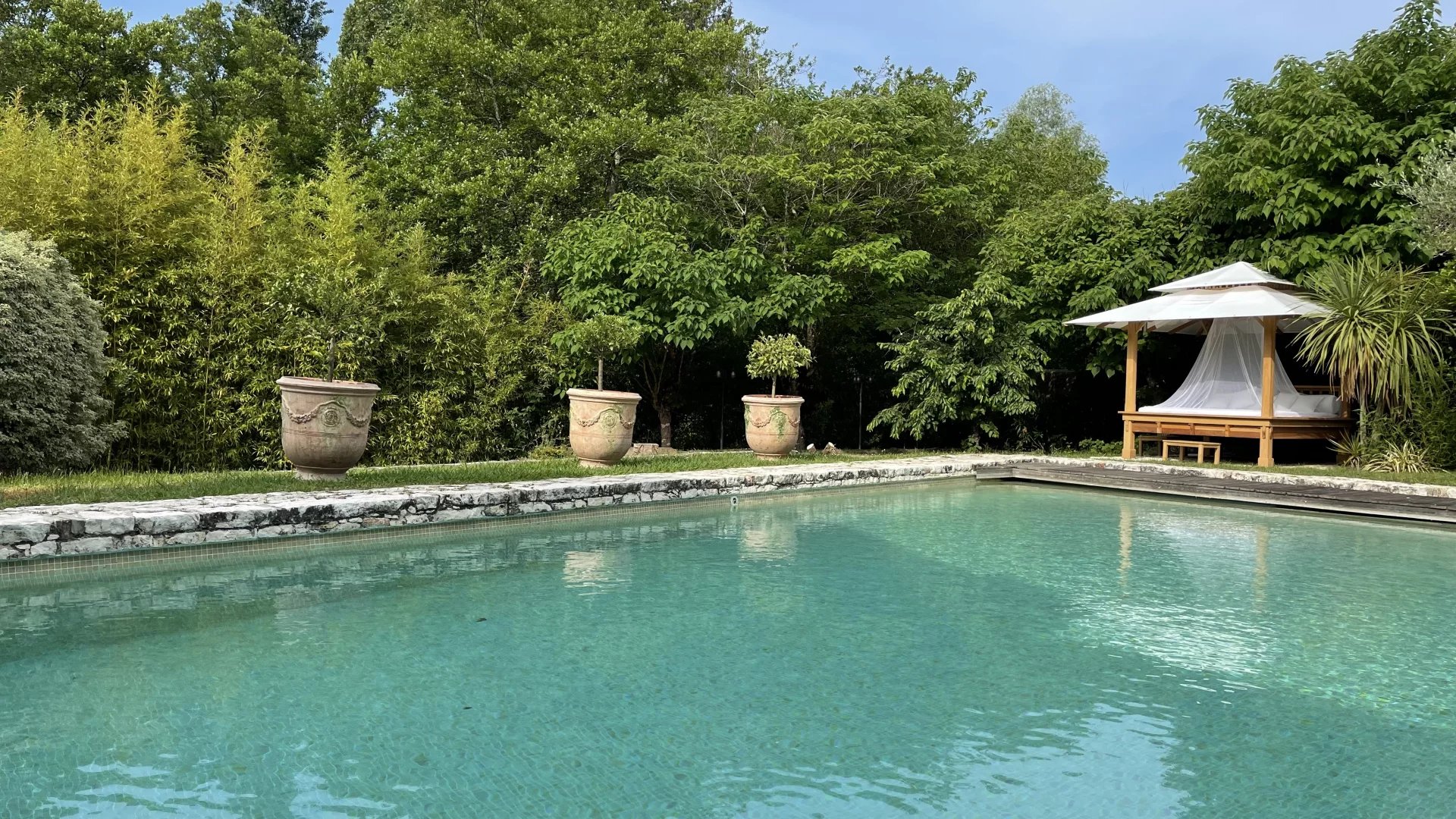 A magnificent tiled and heated free-form swimming pool and its beaches in the shade of the stone arches of an old aqueduct, a carport, and a fitness room complete this unique and timeless property.