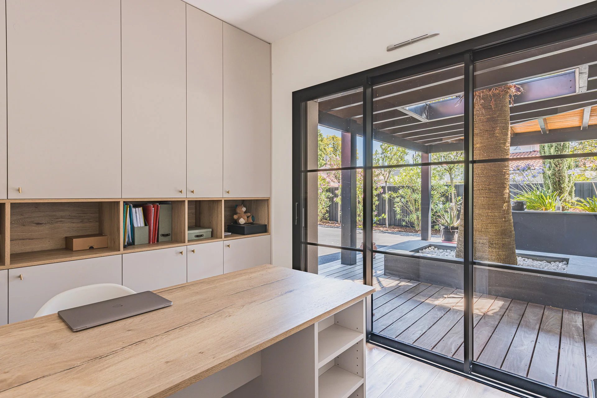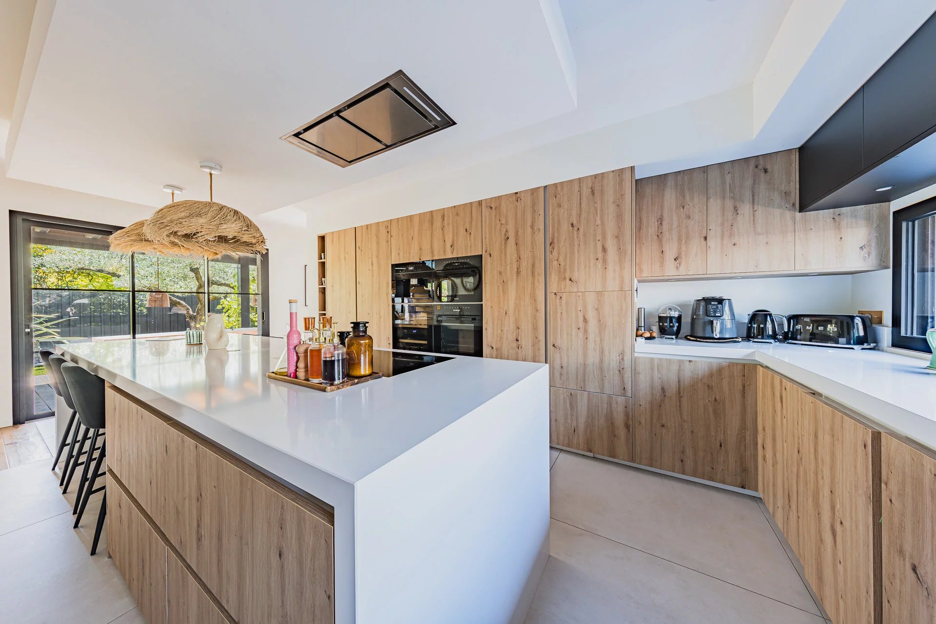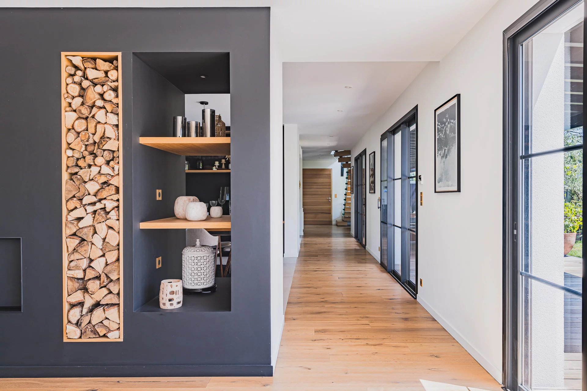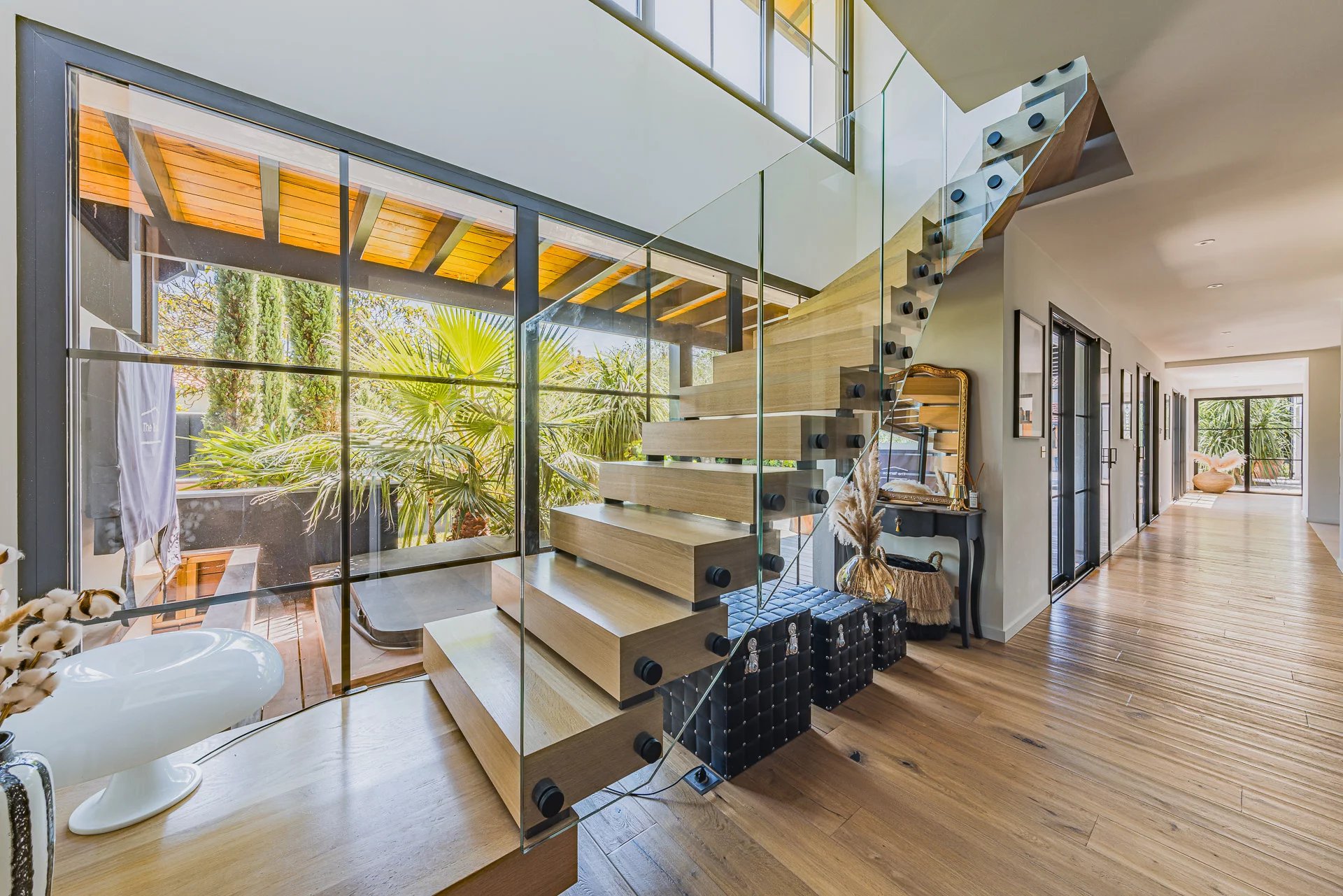 The entrance sets the tone. A corten steel gate opens onto a clean-lined façade, defined by balanced voids and solids, enhanced by a Red Cedar door that echoes the surrounding landscape. Just inside, a bespoke staircase in wood and metal, framed within a glass bay, structures the view. Lines are clean, walls discreetly clad, and built-in storage blends seamlessly into the architecture.
