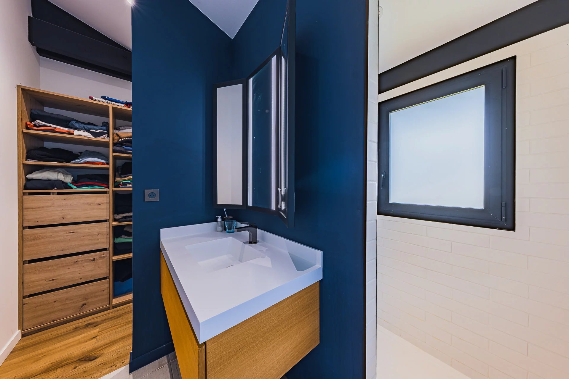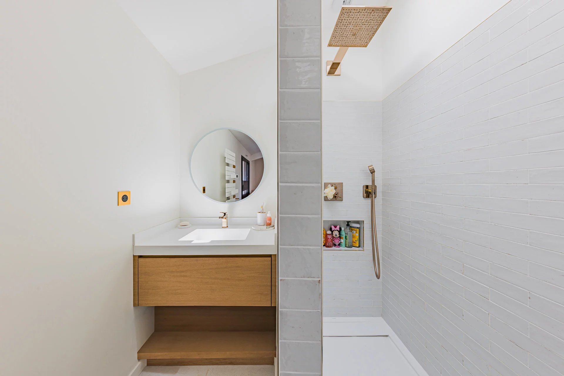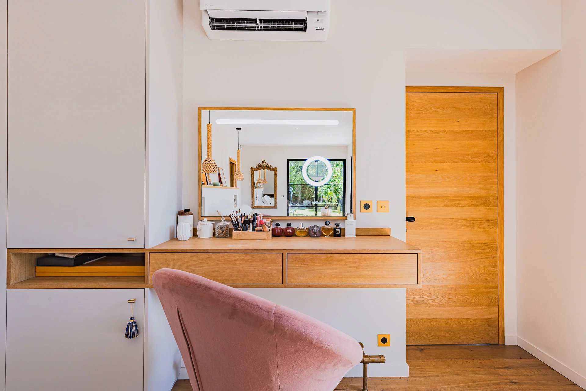 Technical comfort is absolute: the house is fully air-conditioned with a discreet, reversible system. Every detail has been carefully chosen — from smart home controls to door handles, from light switches to wall finishes, each component reveals a quiet commitment to quality. Even in the bathrooms, subtle features reflect the same concern for comfort and use.