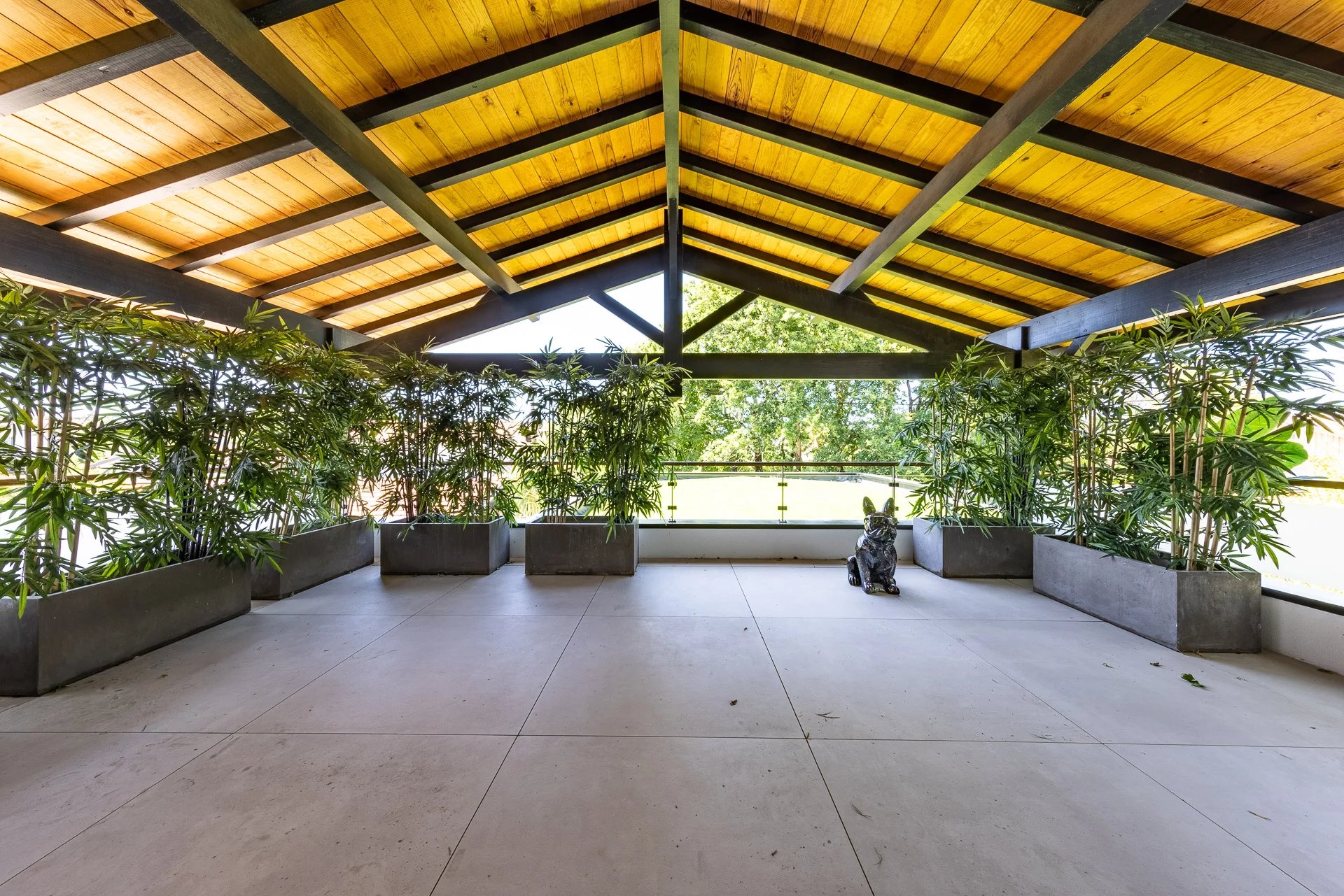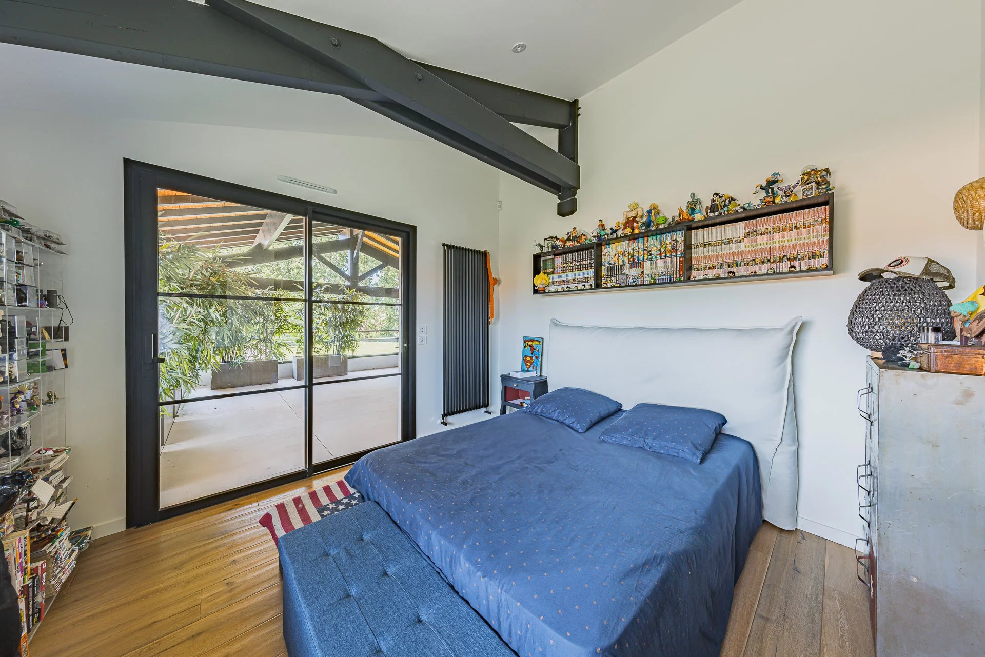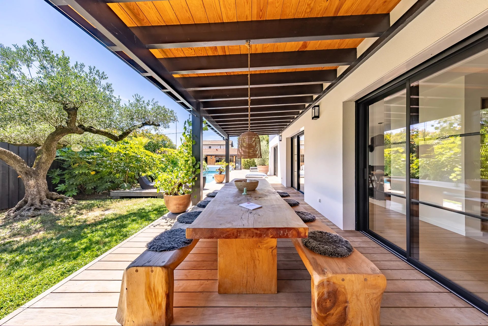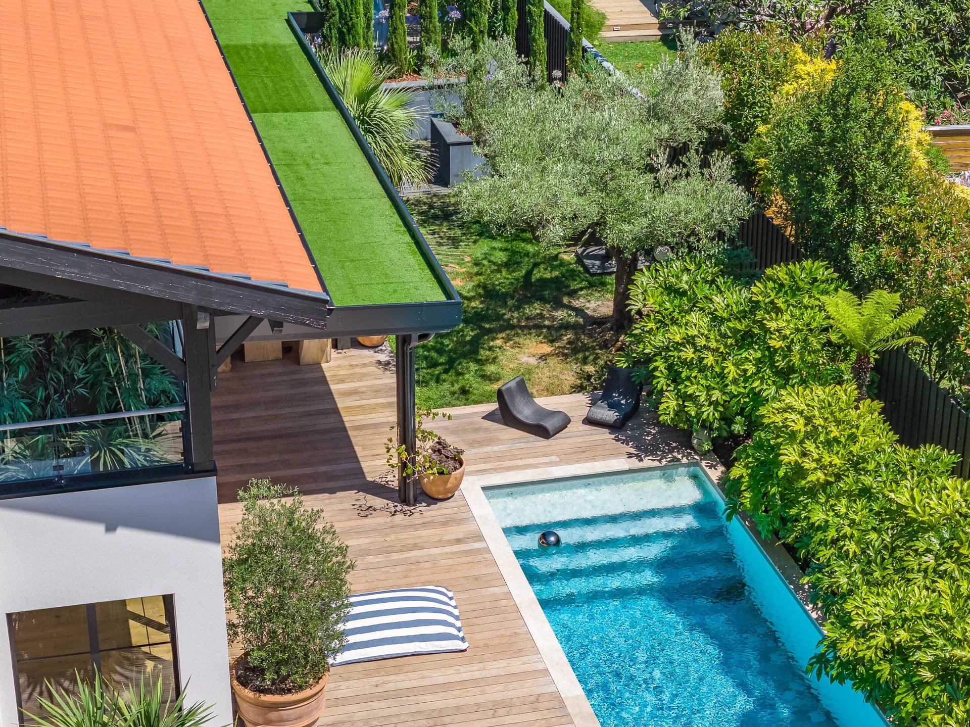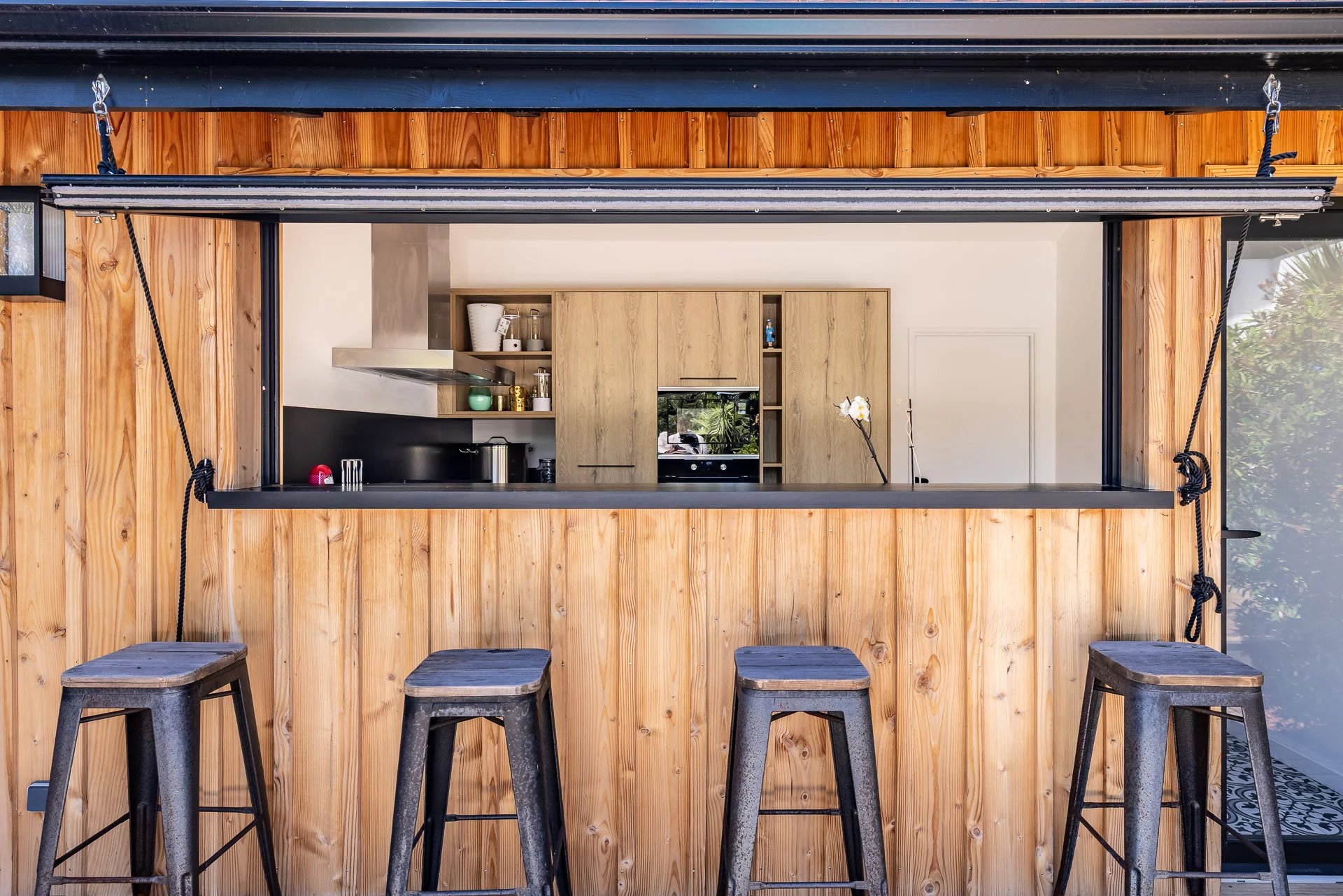 Set apart, a guest bedroom opens onto a zen garden. Further on, a genuine pool house offers a full summer kitchen, changing room and outdoor shower, in direct connection with the pool and jacuzzi. The design is simple, materials carefully selected, and movement throughout the property feels natural and intuitive.