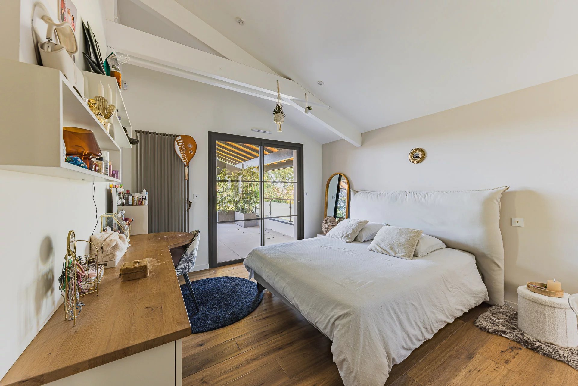 The main suite on the ground floor combines generous proportions, views of mature oaks, and direct access to the terrace and pool. A walk-in dressing room and en-suite bathroom continue the architectural flow. Upstairs, three additional suites with walk-in closets and bathrooms form the night area. Some enjoy double aspects over the garden or upper terrace, enhancing the sense of privacy.