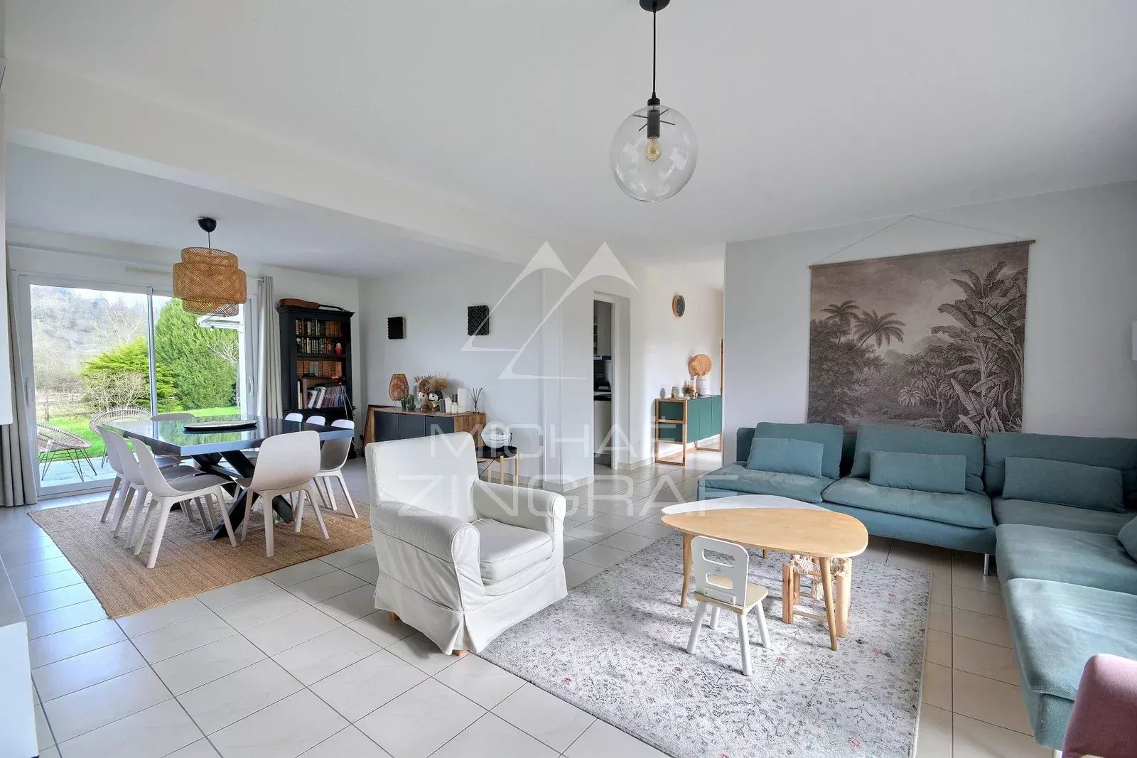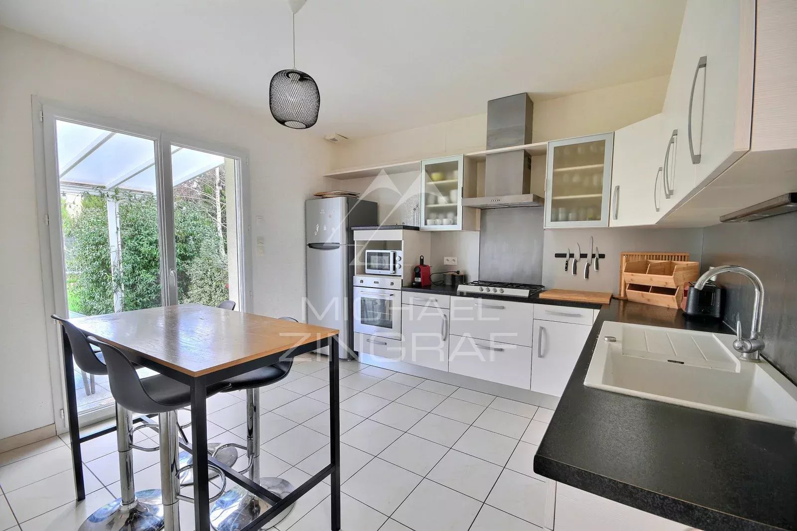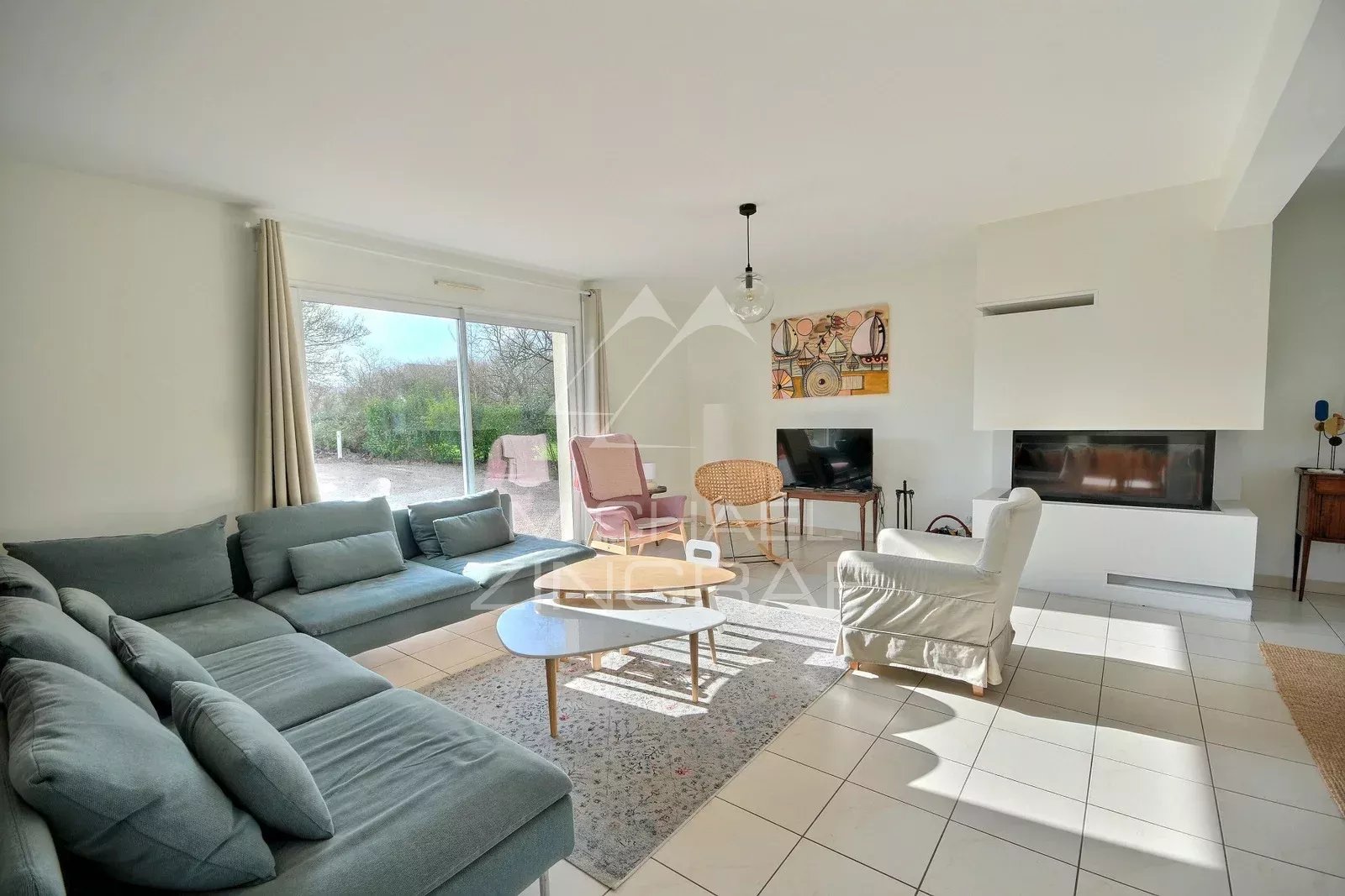 This 185 sqm house features a large, bright living room with fireplace and a fitted and equipped kitchen with direct access to the terrace and garden.