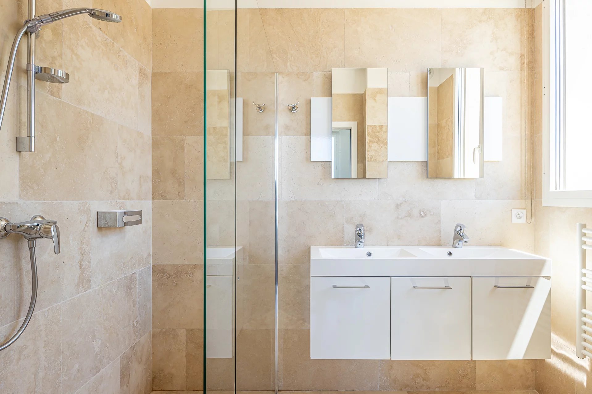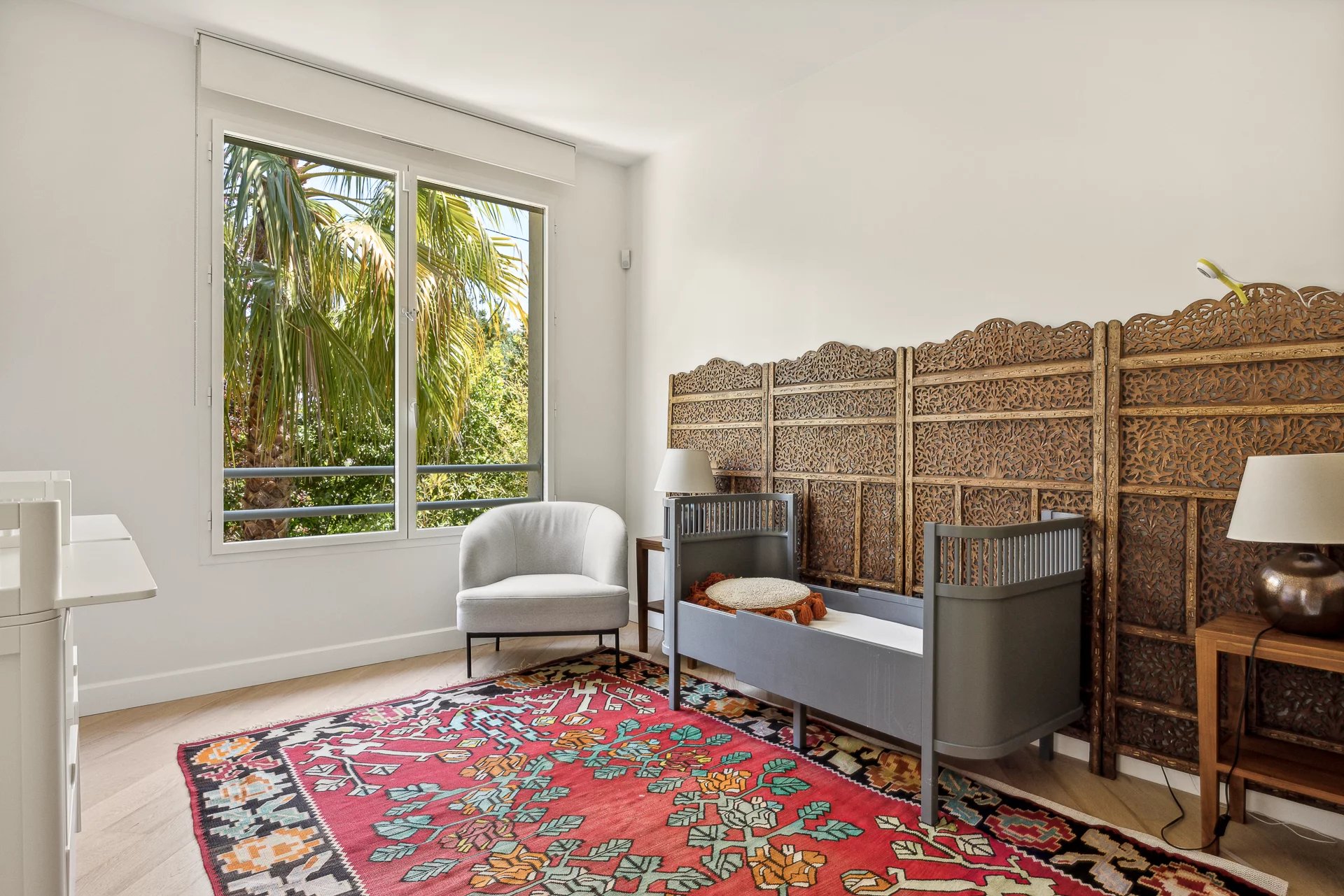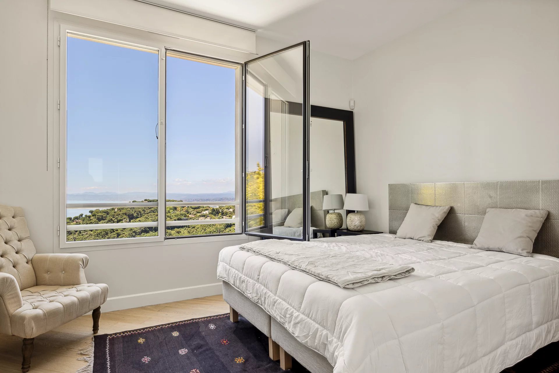 In a calm and picturesque environment offering a sea view on the Baie des Anges and Cap d'Antibes, a new and beautiful villa (interior surface of 215 sqm) with an infinity swimming pool, bay windows and marvellous garden. On 2 levels, it is composed from a spacious living room opening onto a terrace, dining room giving onto a second terrace, an equipped kitchen with laundry and 4 bedrooms with bathrooms/showers and an office. 2 car parking spaces (possibility for a closed garage).