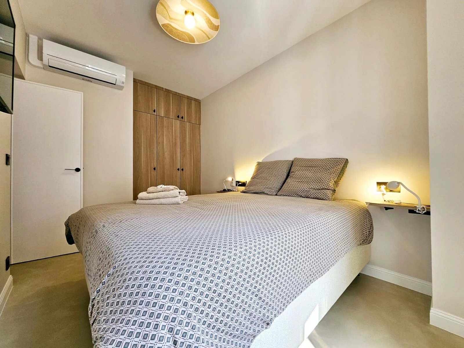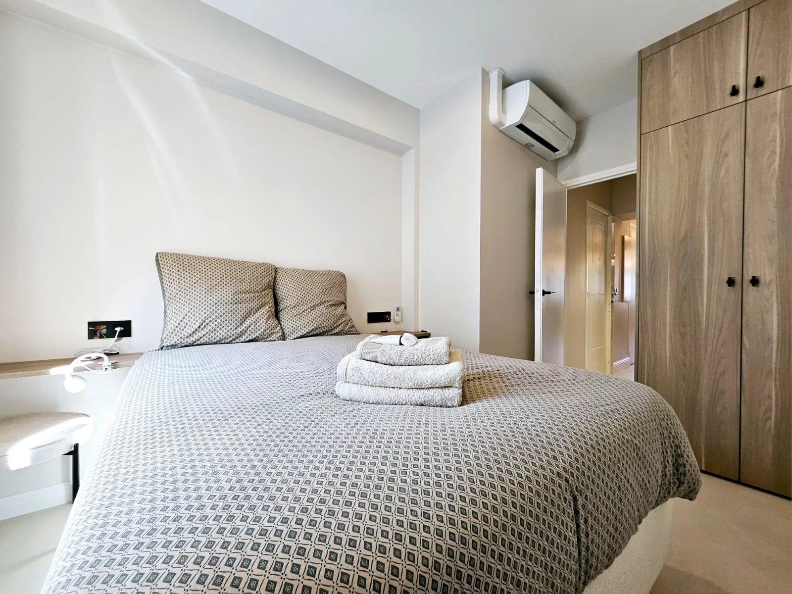 The apartment features two bedrooms with built-in wardrobes, a bright and airy living room, and a sleek contemporary bathroom with WC. Reversible air conditioning in the bedrooms and living area ensures year-round comfort.