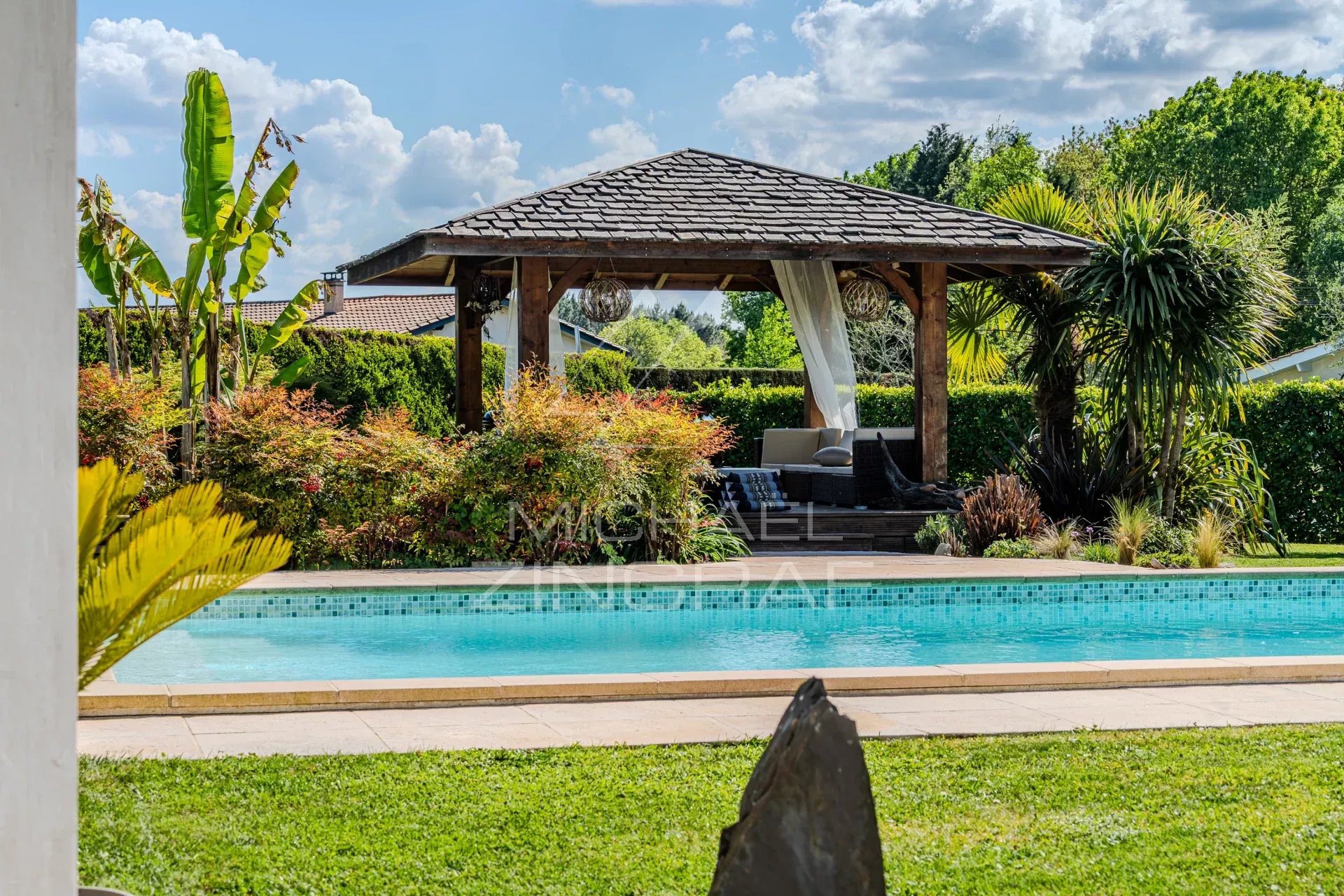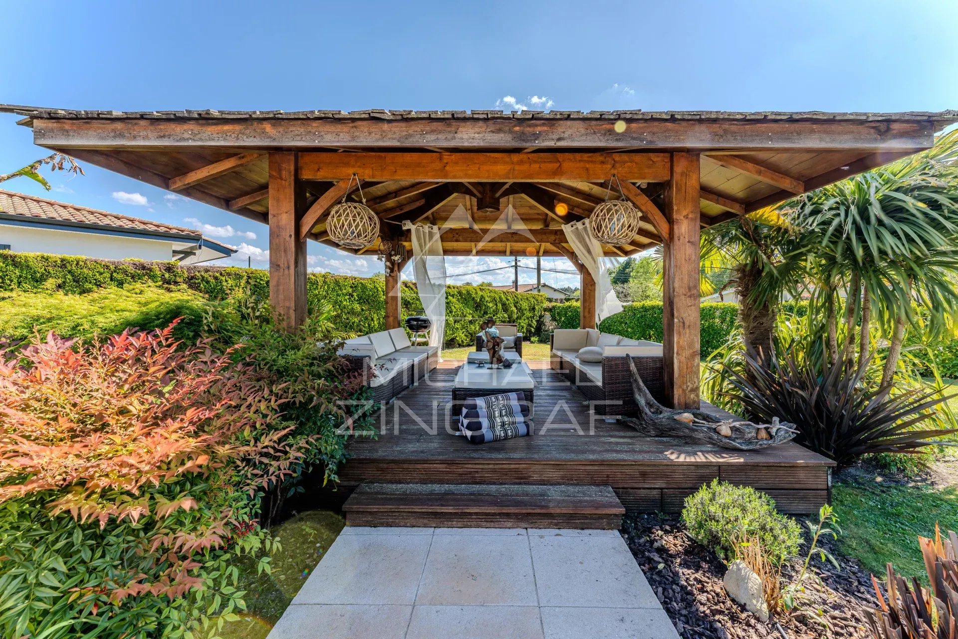 Outside, the 10 x 9-metre heated saltwater swimming pool blends harmoniously into the landscaped surroundings, and is accompanied by an elegant covered outdoor lounge inspired by Balinese architecture. A true invitation to relax, this space is designed as a haven of well-being, between light and shade, ideal for moments of rest or receptions in an exotic atmosphere.