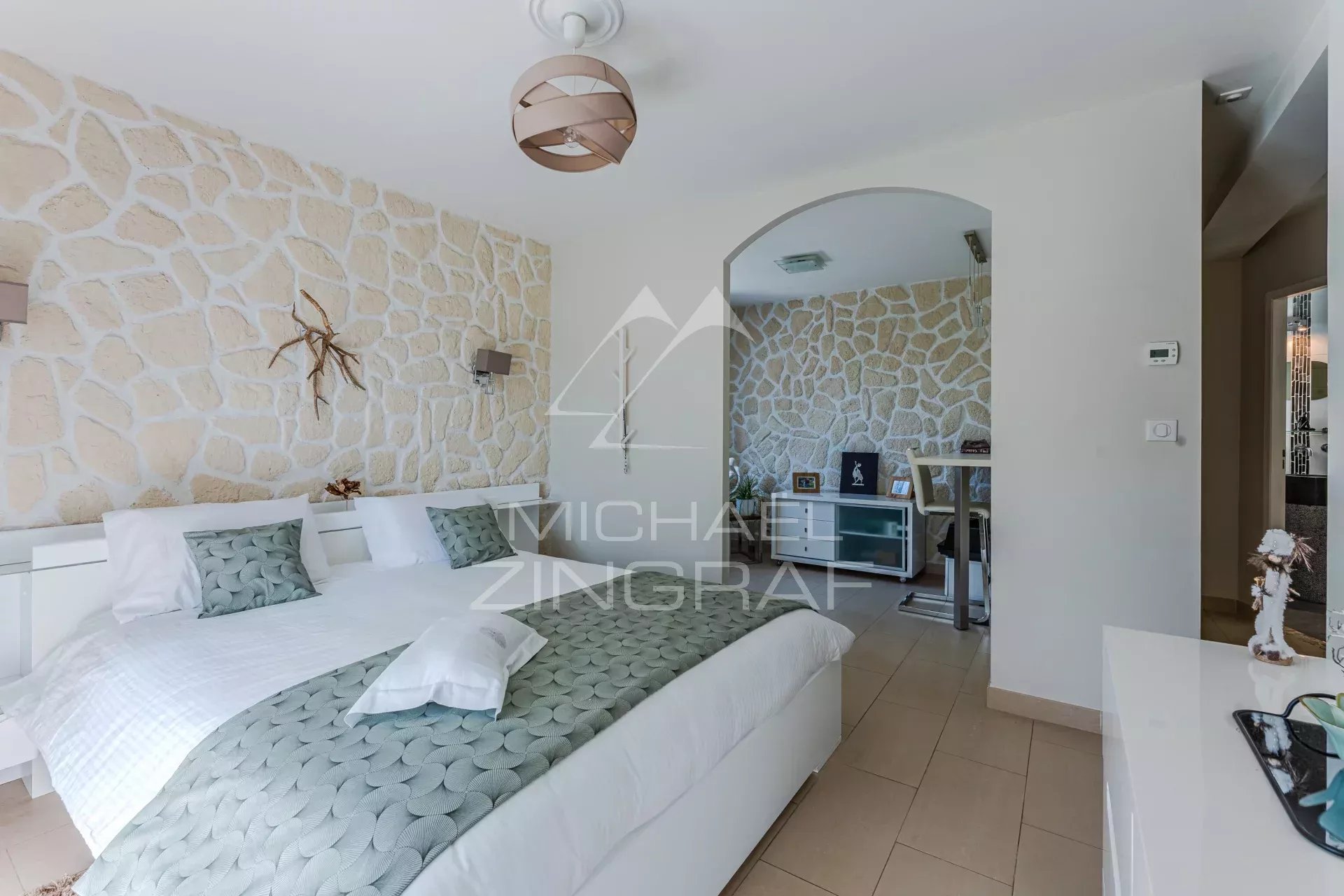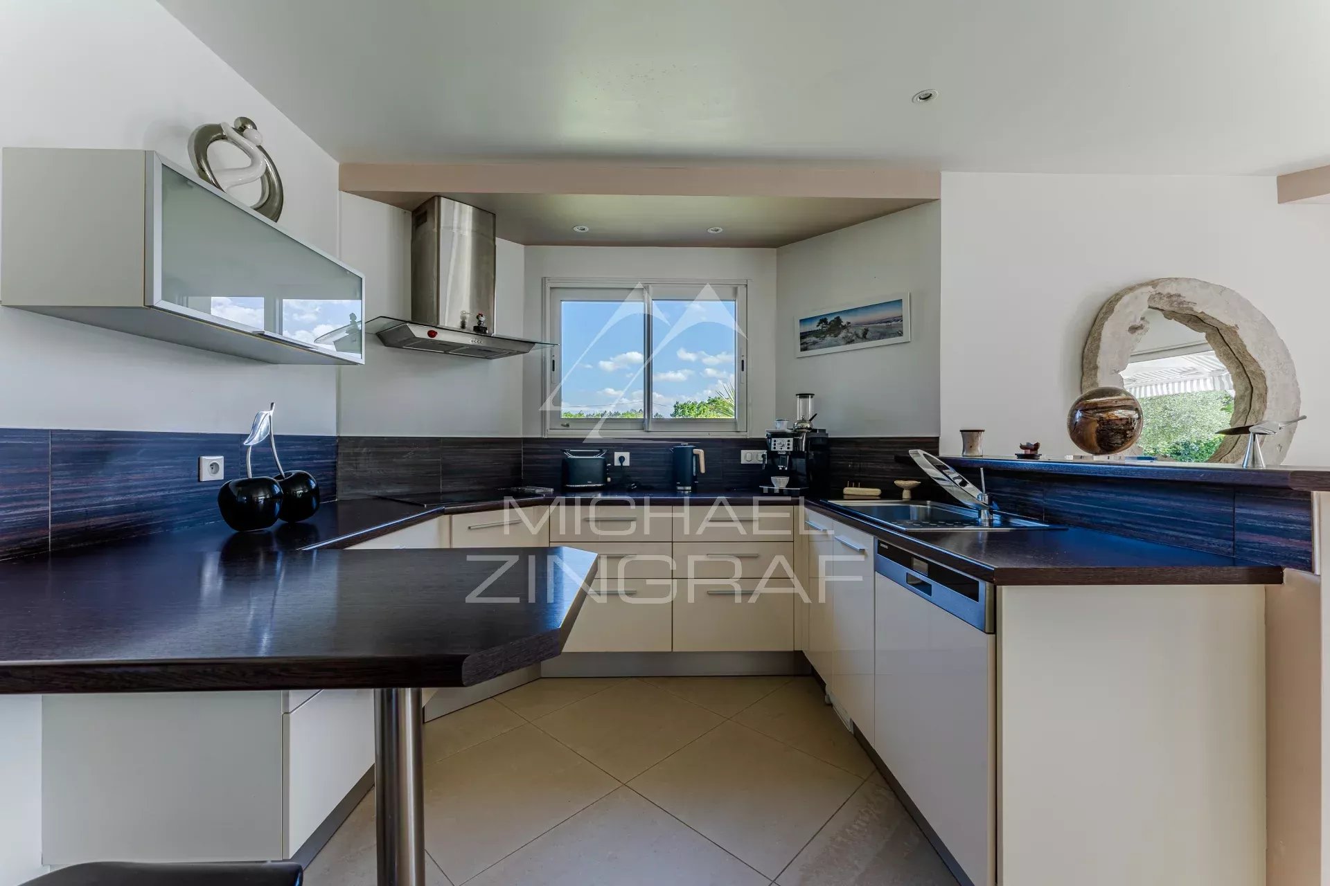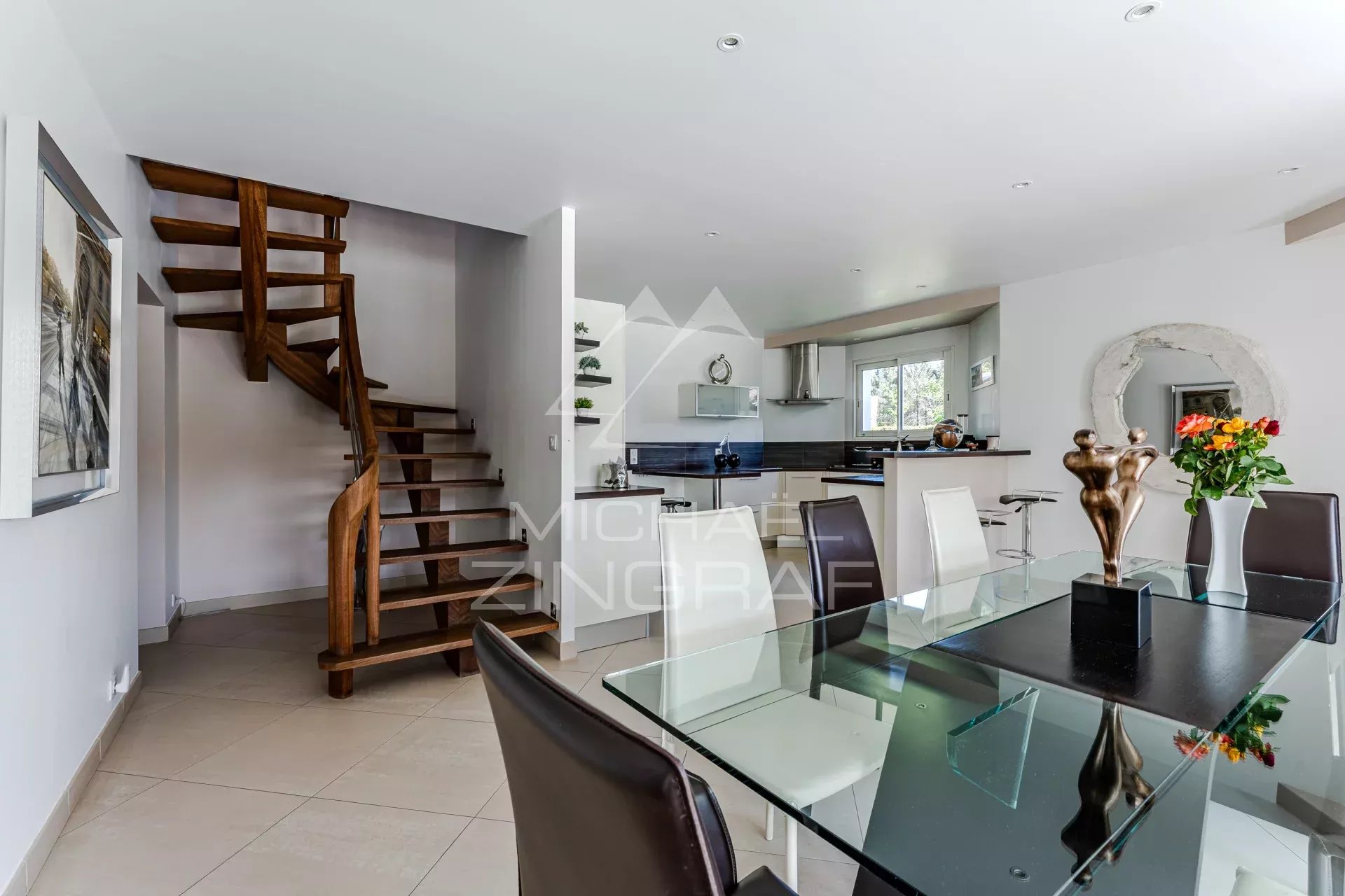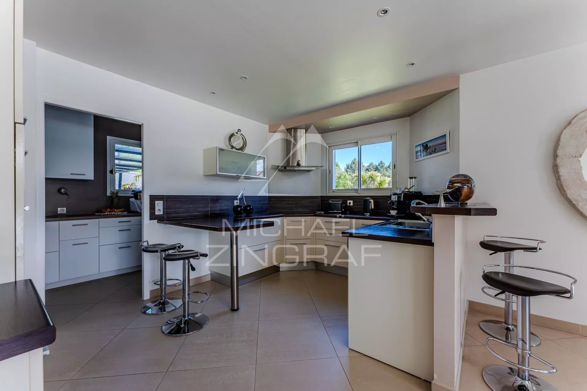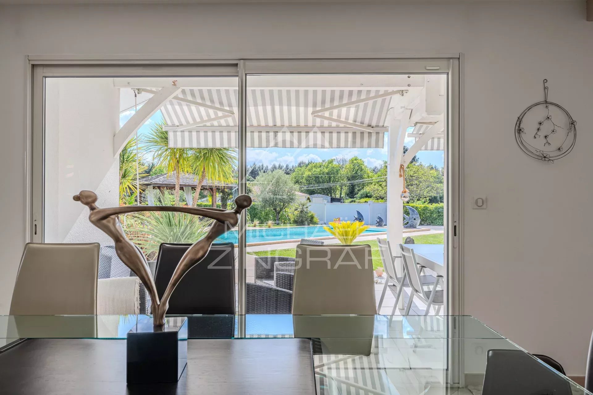 The property benefits from top-of-the-range features such as geothermal underfloor heating, centralized vacuum cleaning, double-glazed aluminum joinery, a whirlpool bath and modern home automation equipment. Two garages, a garden shed, a carport and an electric gate complete the property.
