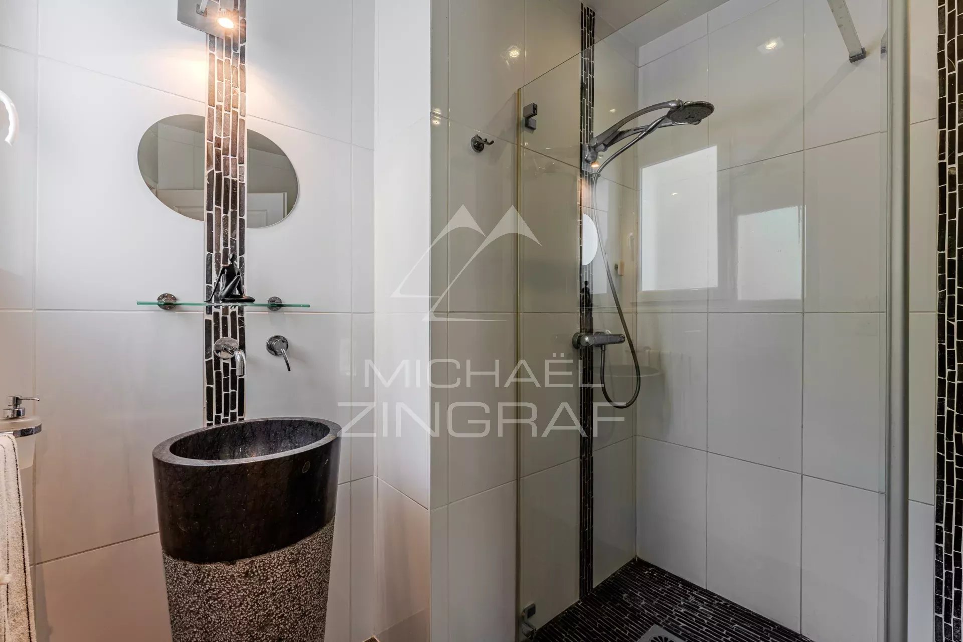 The main 52 m² living space features a bright living room and open kitchen, the heart of the home, designed for convivial moments with family and friends. On the garden level, a vast 28 m² master suite, with en-suite shower room, provides privacy on the ground floor.
