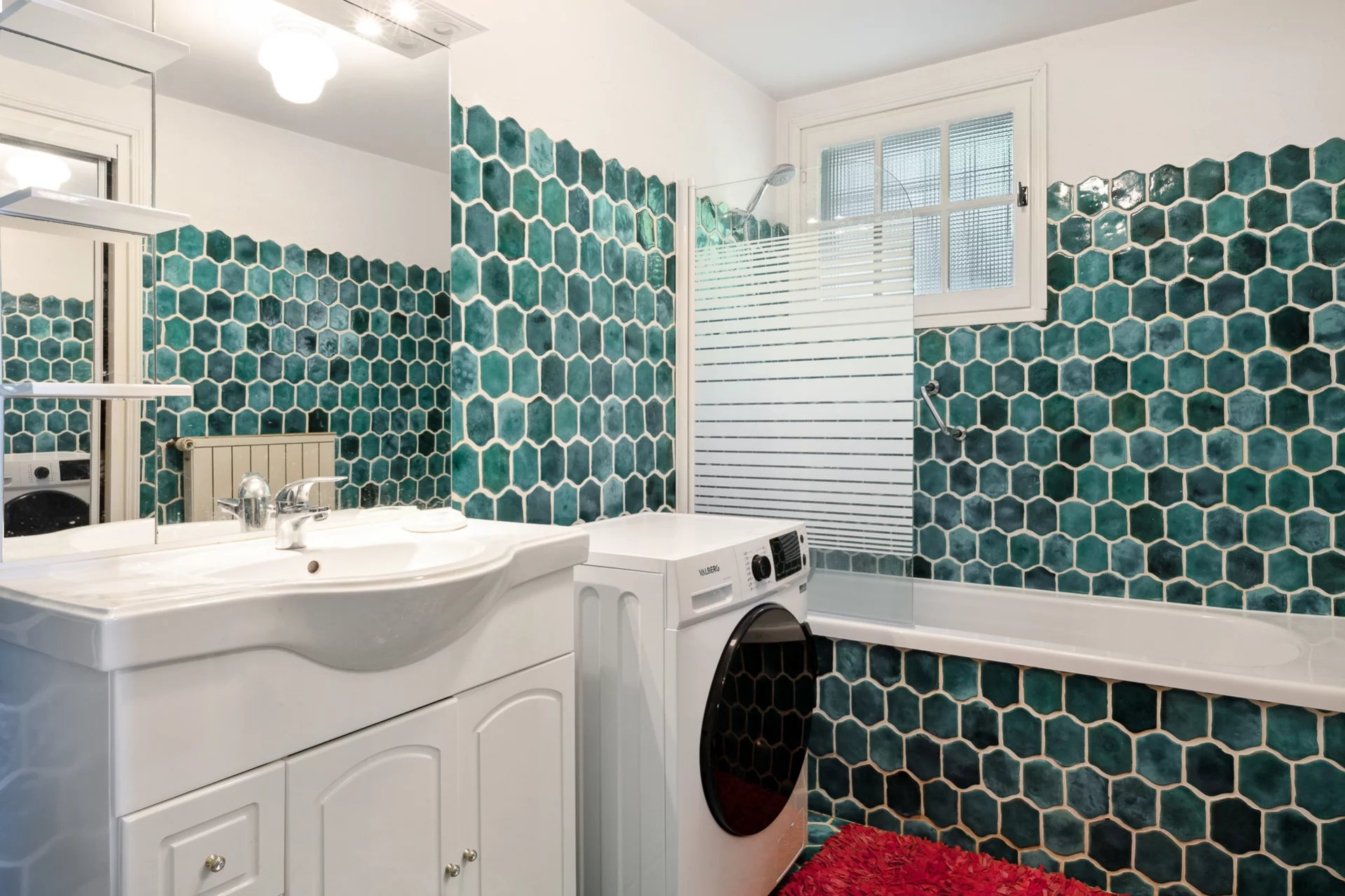 Set over two levels and around 212m2, the 1st floor features a living room with fireplace, high ceilings and opening onto a loggia, a dining room and open-plan kitchen with access to an outdoor terrace, three bedrooms, a bathroom, a shower room and guest toilet.