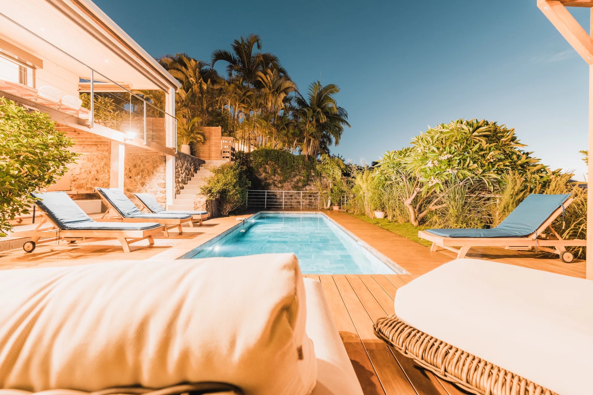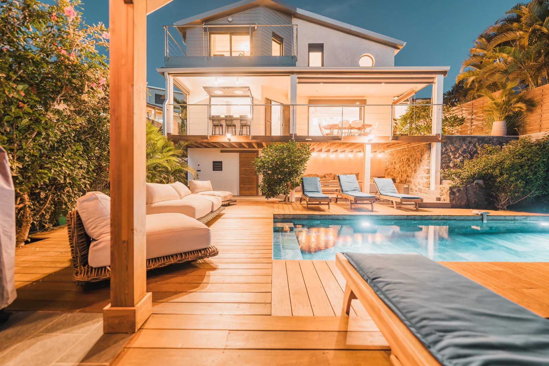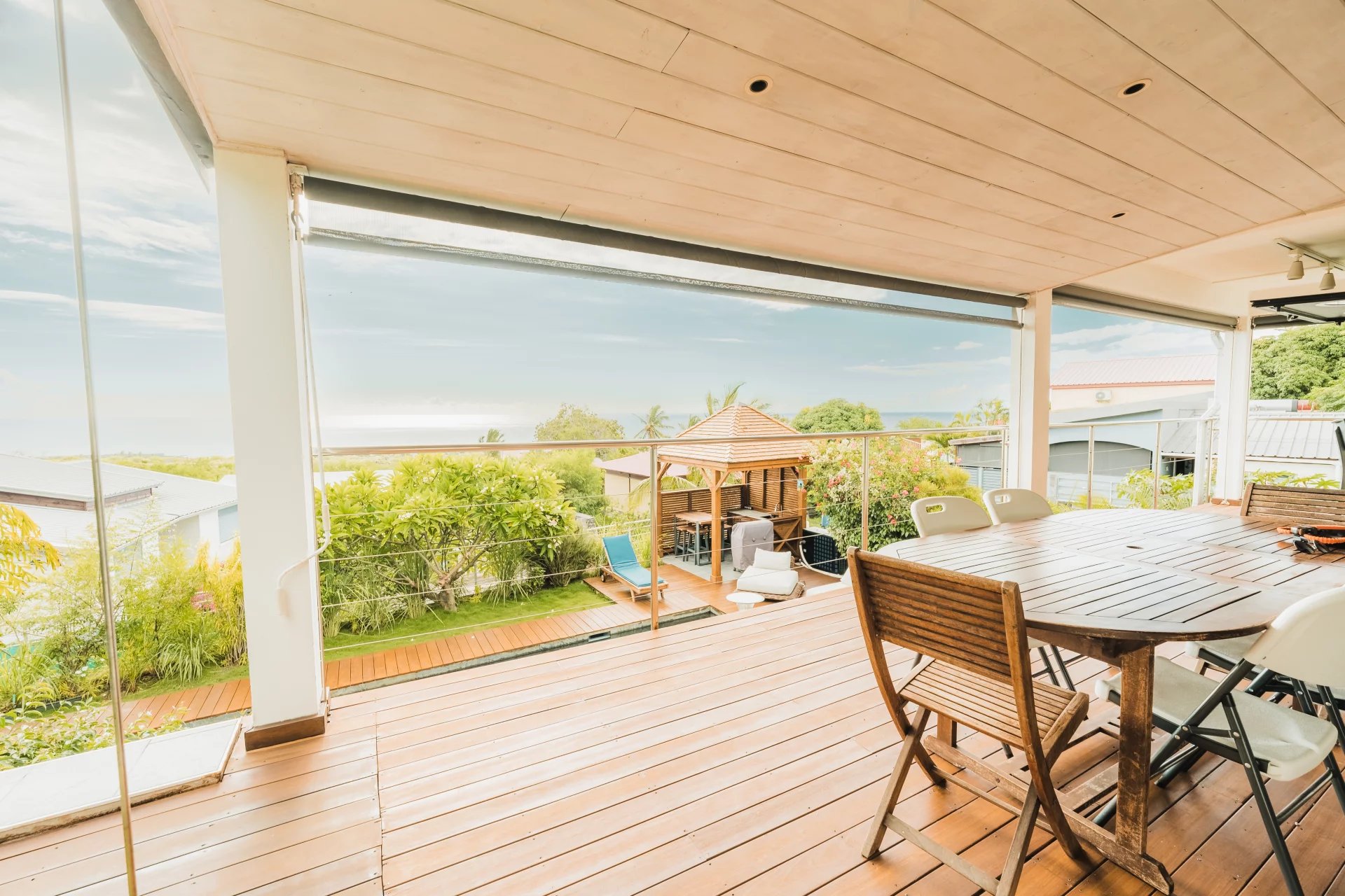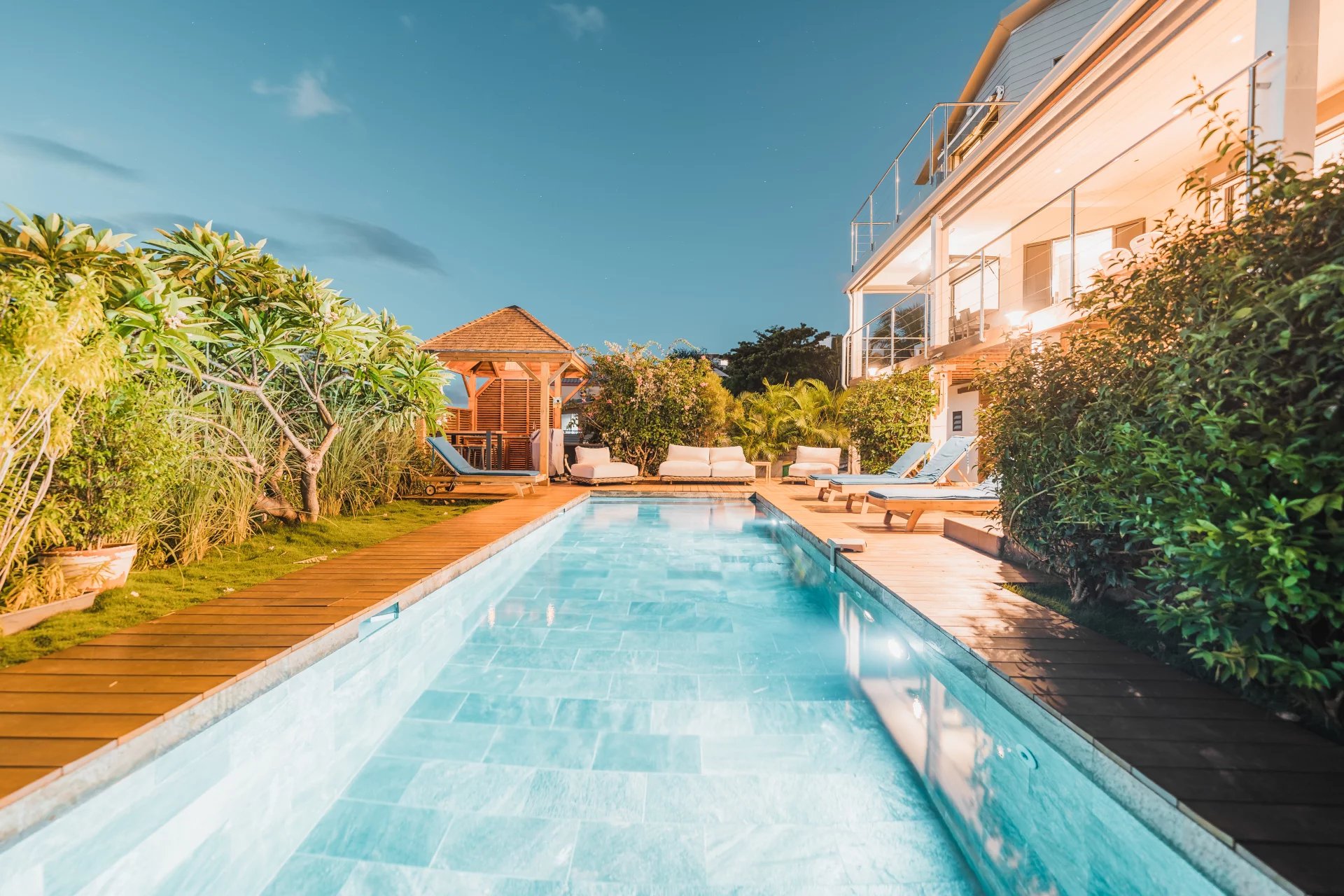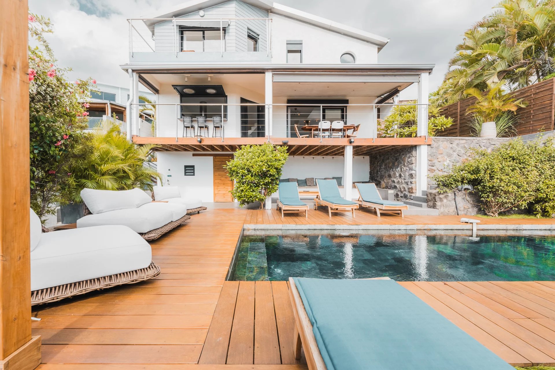The ground floor offers an outdoor space designed for relaxation and well-being, centered around a natural stone pool, still under a ten-year warranty. For elegant moments of conviviality, a tamarind wood gazebo stands proudly at the heart of a magnificent Ipé wood deck, where exceptional outdoor furniture completes this idyllic setting.