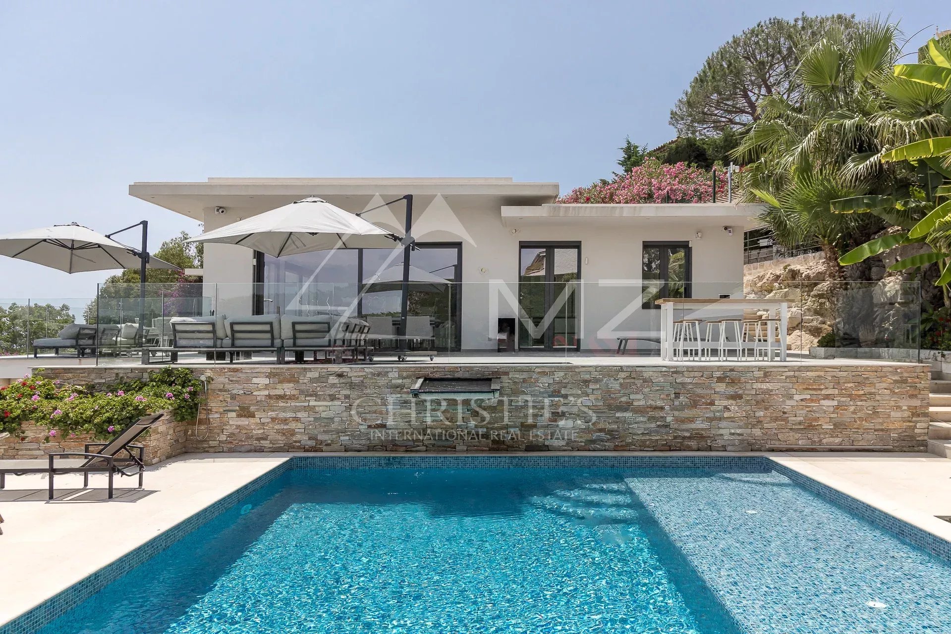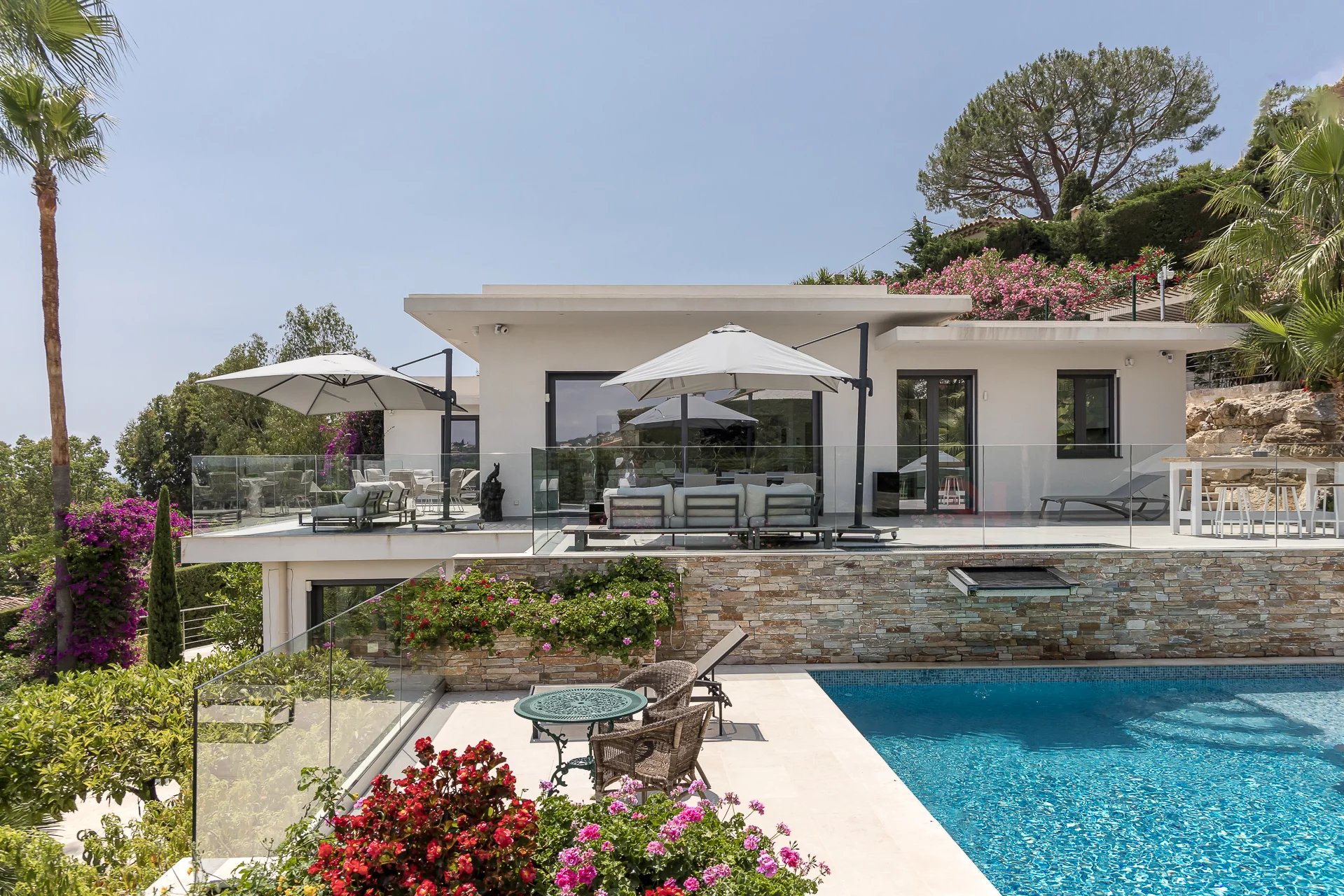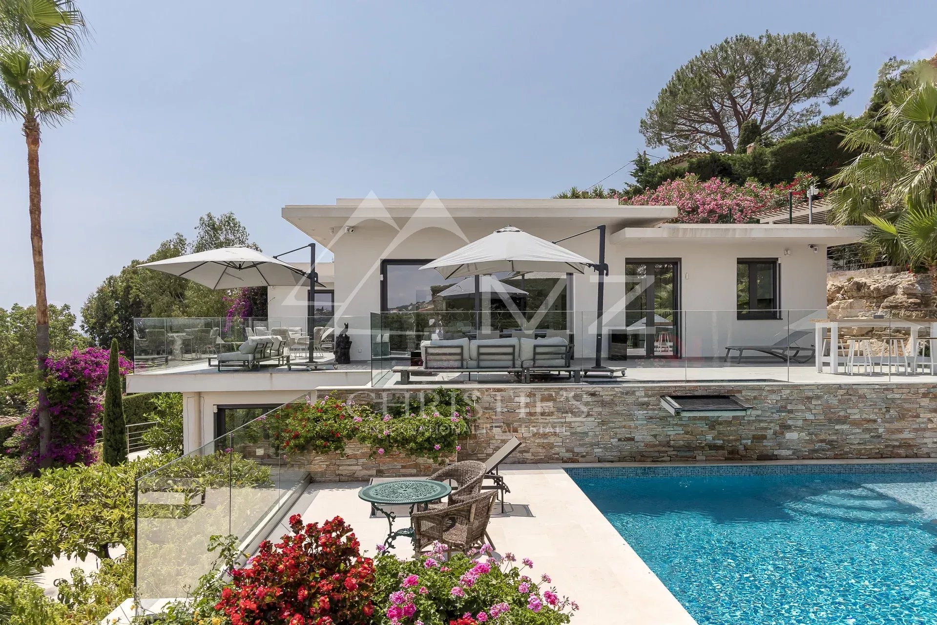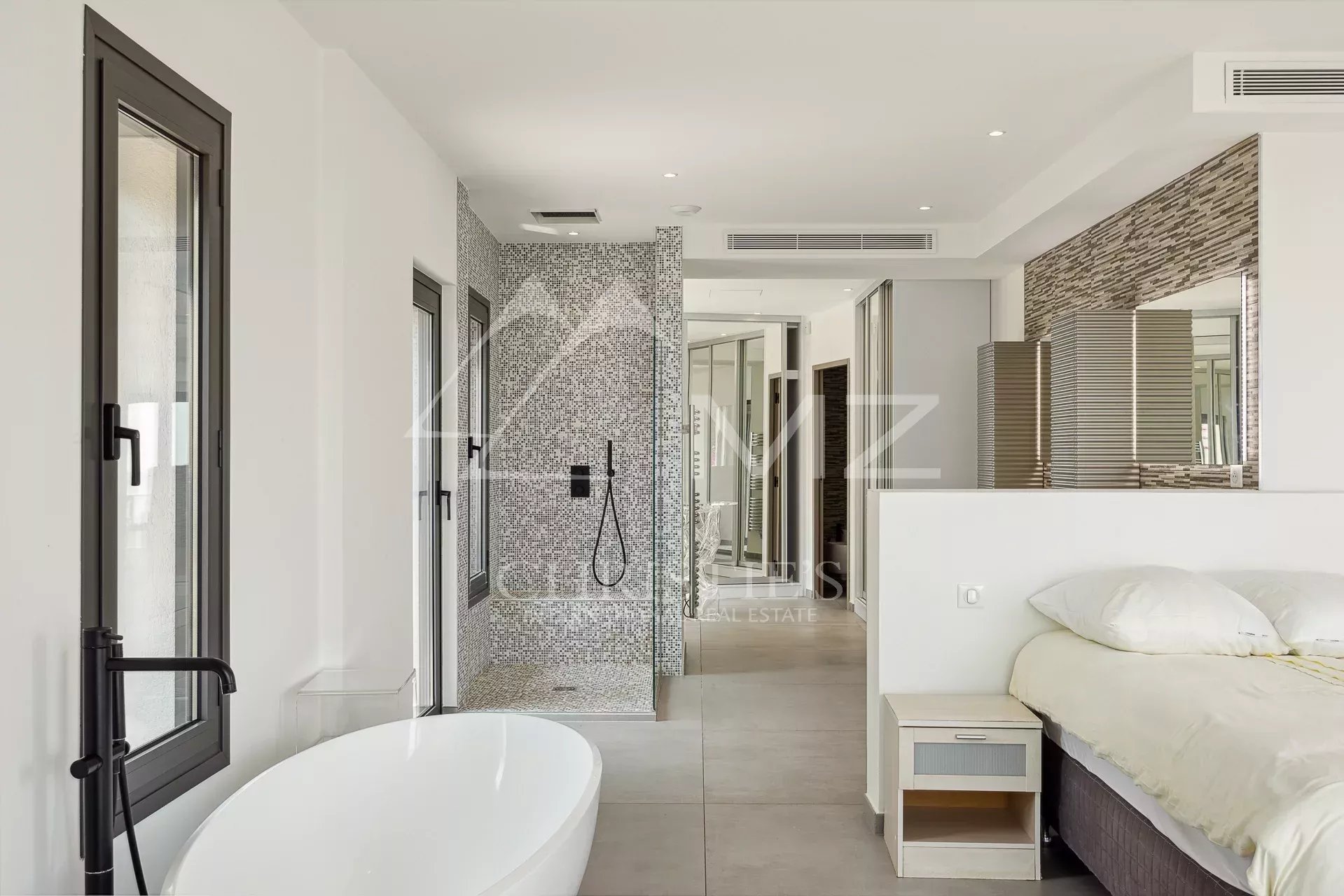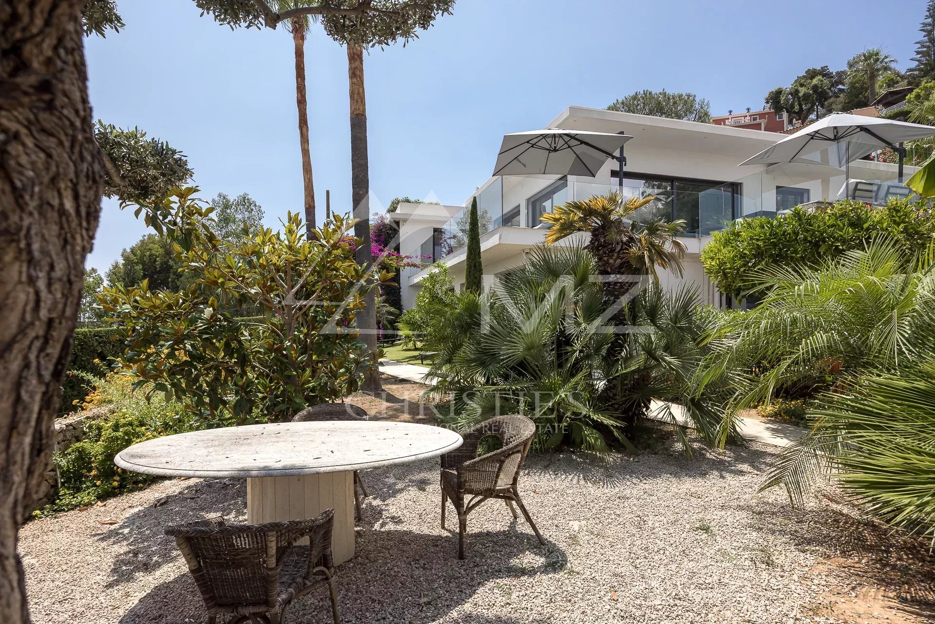 Superb modern villa in Golf-Juan of approximately 419 m², comprising: Upstairs, a living room with dining room, an equipped kitchen, a master bedroom with shower room and bath. On the ground floor, 4 en-suite bedrooms. Two studio annexes. Heated swimming pool 6x11. Land of about 1500 m². Garage.