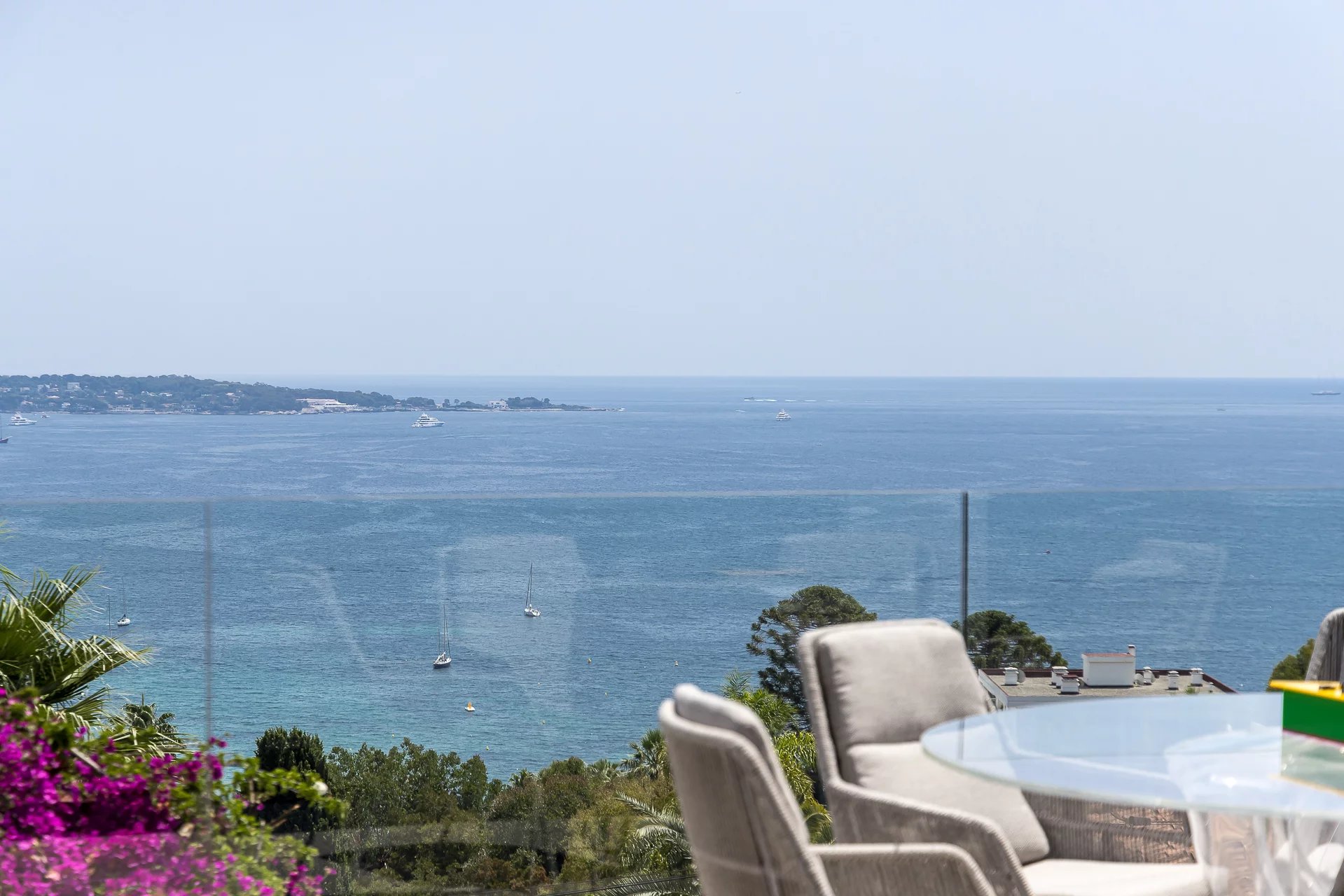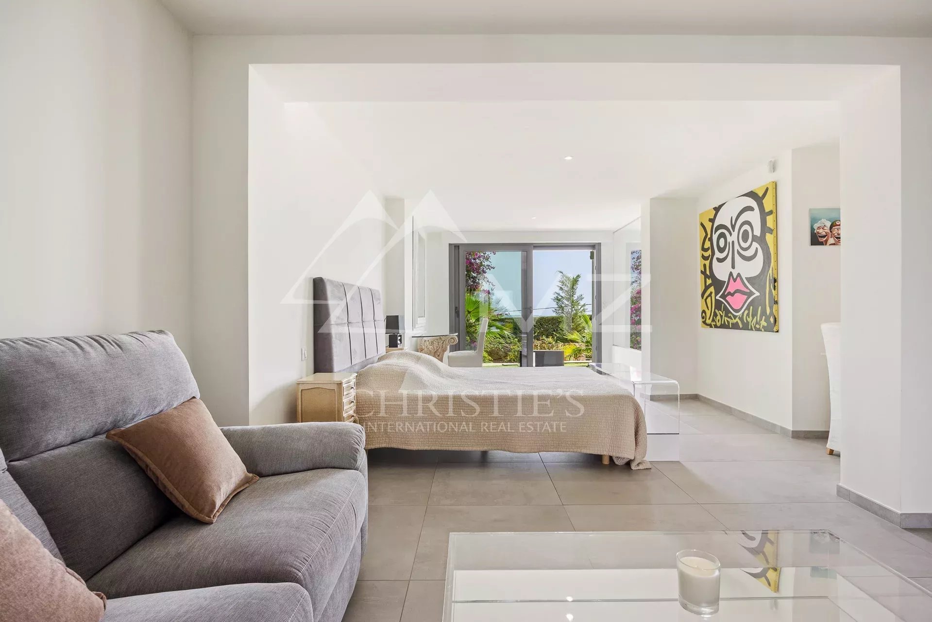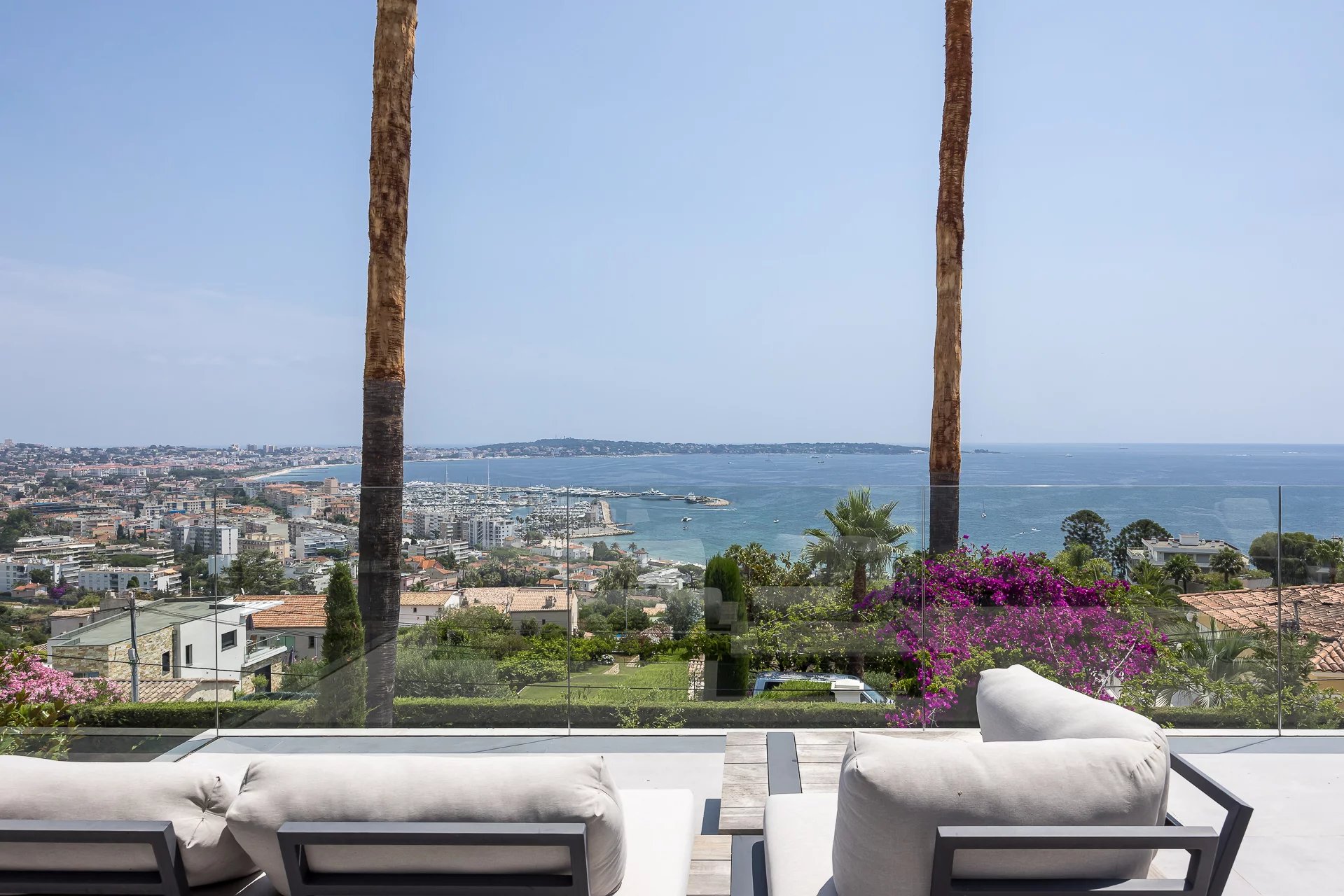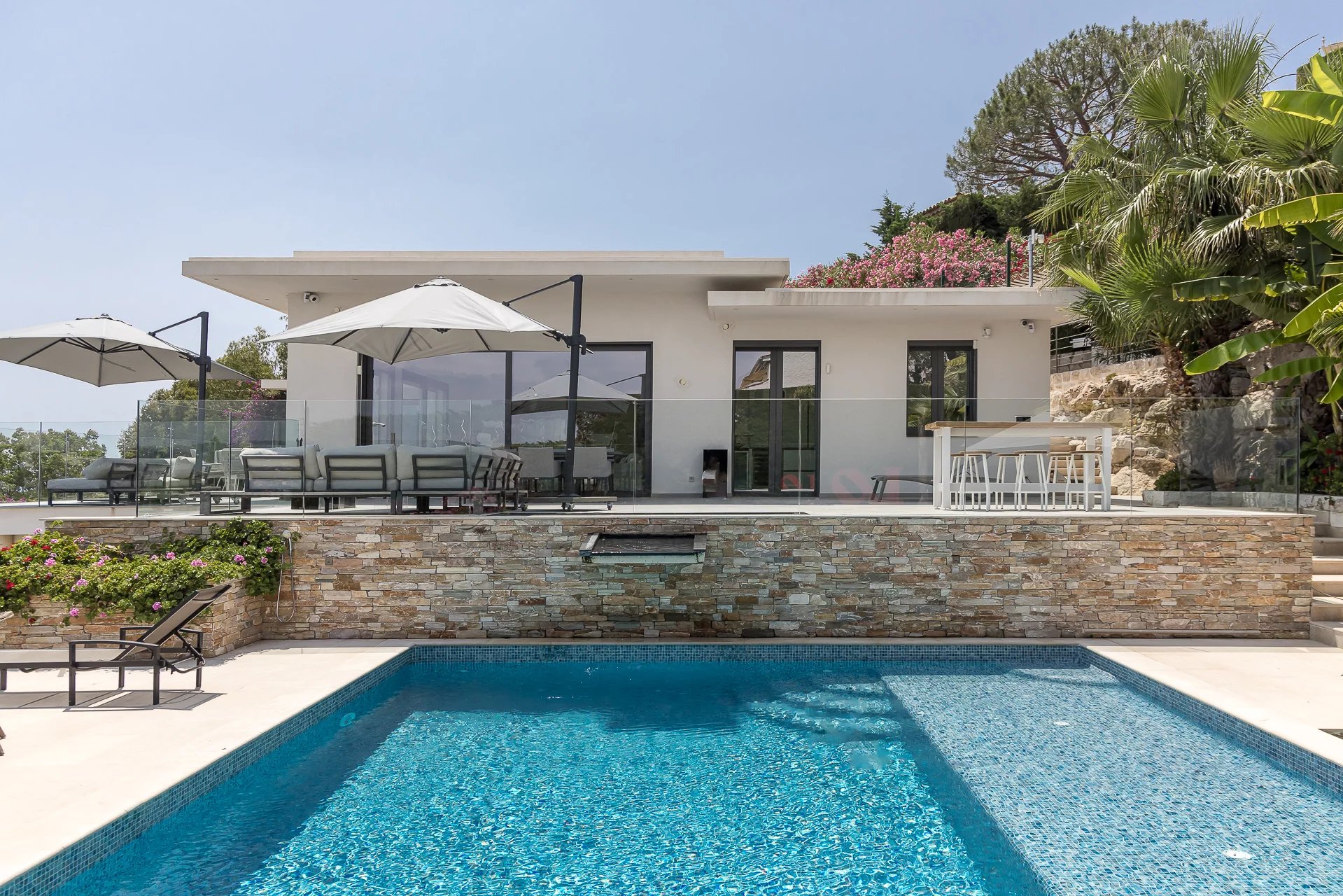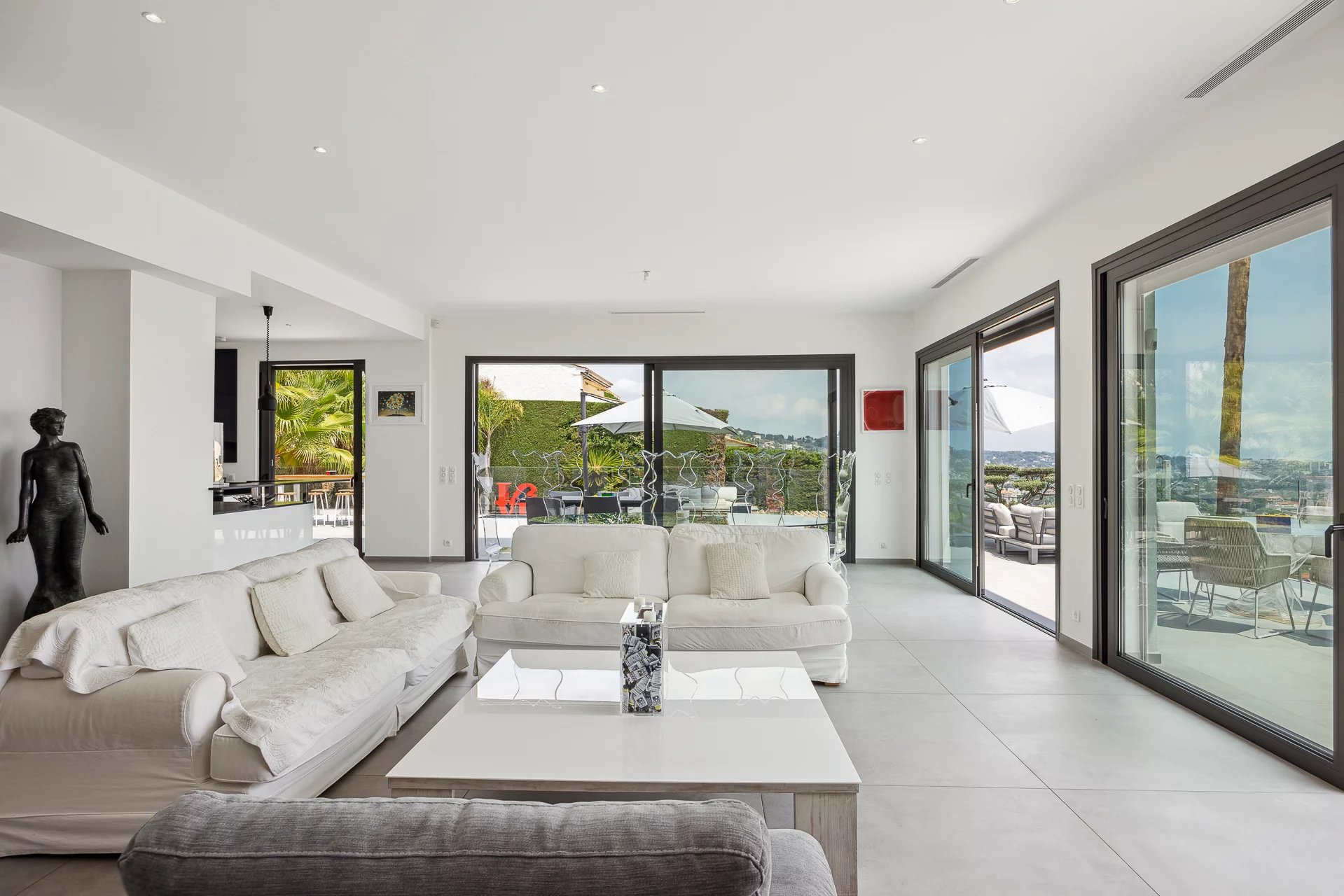 Superb modern villa in Golf-Juan of approximately 419 m², comprising: Upstairs, a living room with dining room, an equipped kitchen, a master bedroom with shower room and bath. On the ground floor, 4 en-suite bedrooms. Two studio annexes. Heated swimming pool 6x11. Land of about 1500 m². Garage.