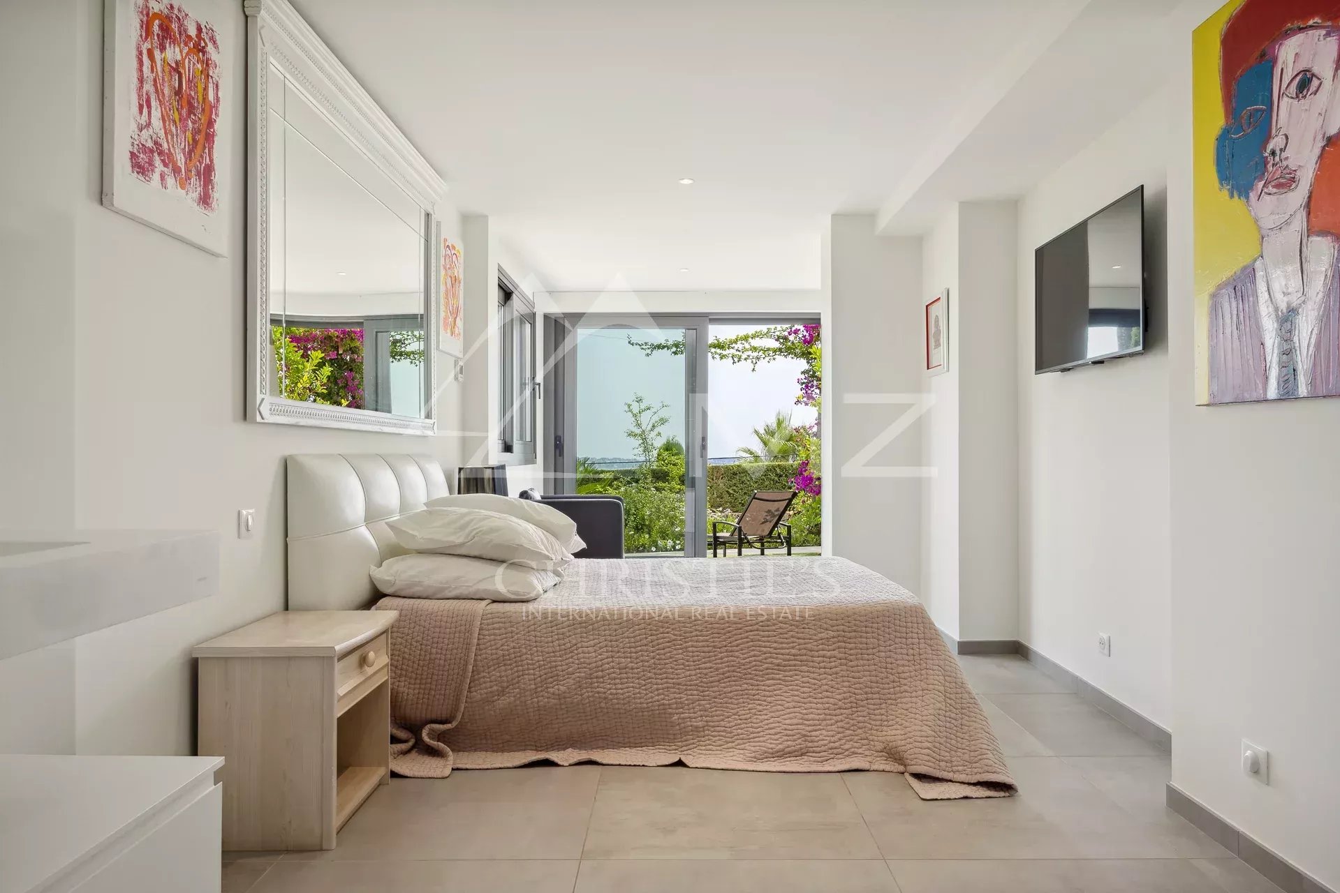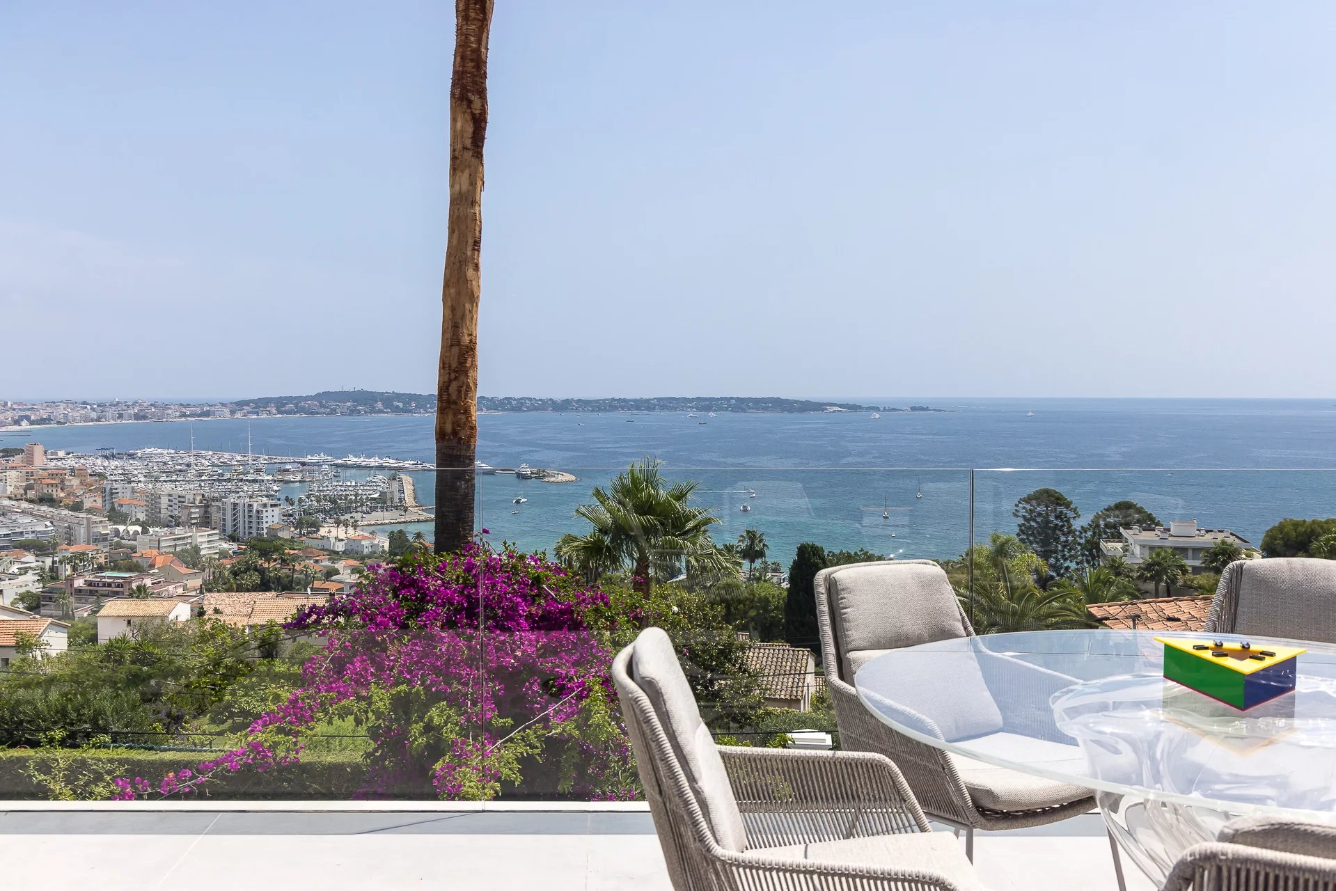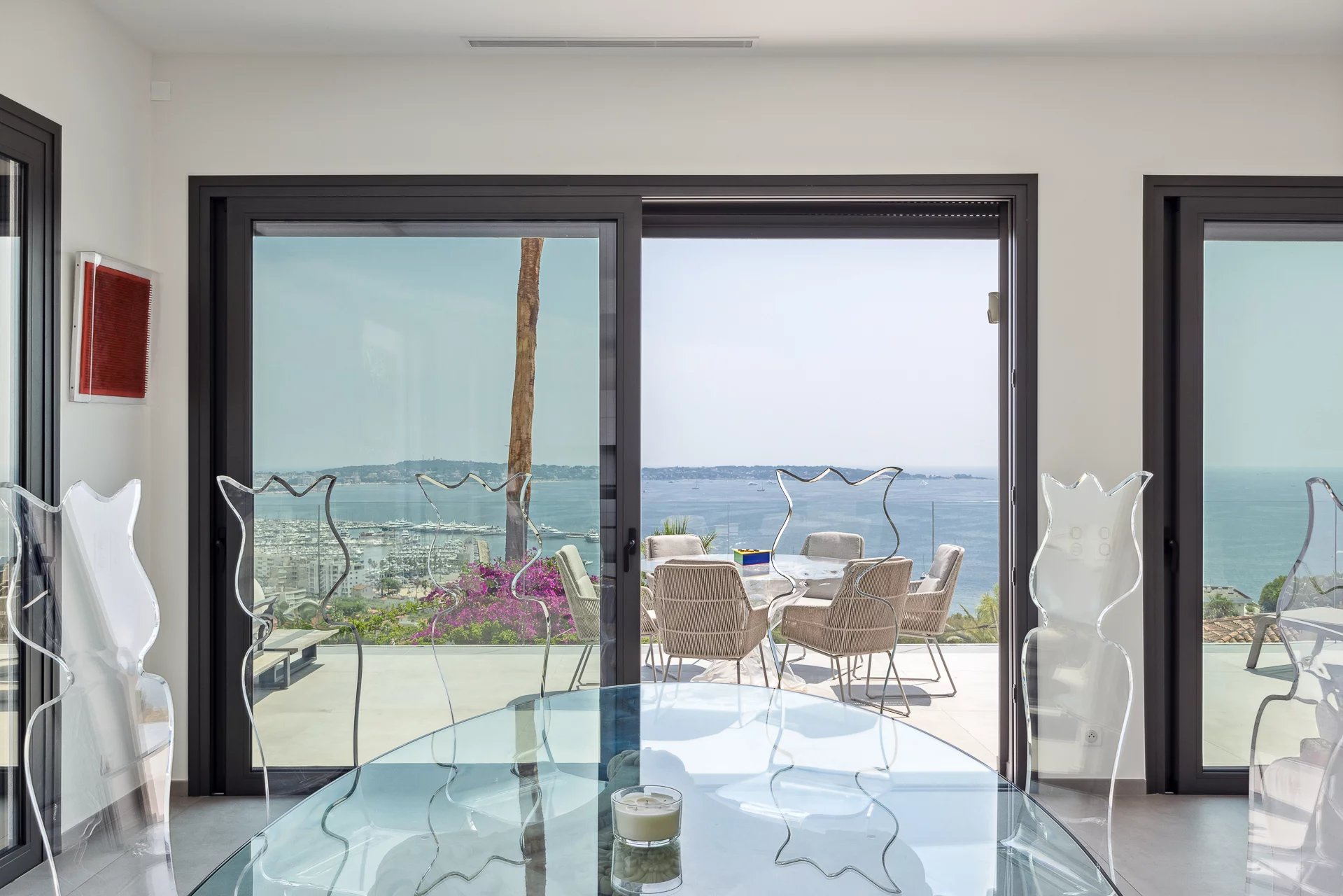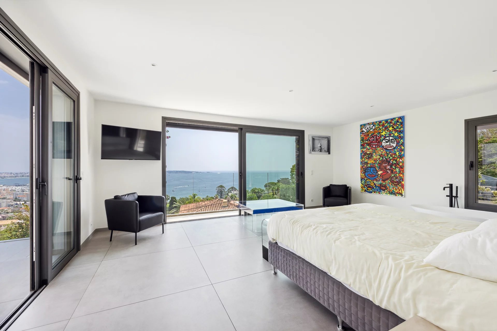 Superb modern villa in Golf-Juan of approximately 419 m², comprising: Upstairs, a living room with dining room, an equipped kitchen, a master bedroom with shower room and bath. On the ground floor, 4 en-suite bedrooms. Two studio annexes. Heated swimming pool 6x11. Land of about 1500 m². Garage.