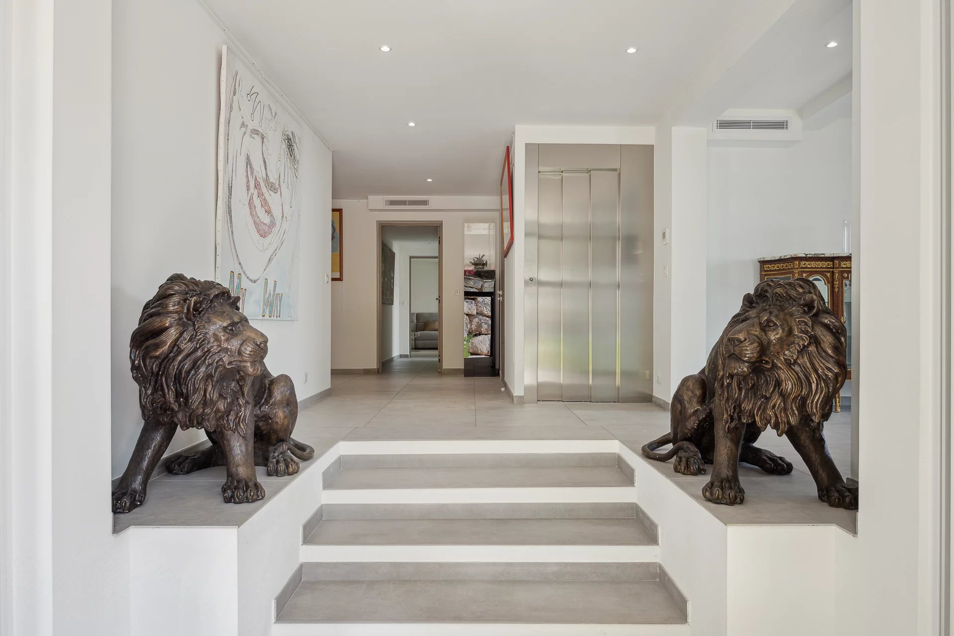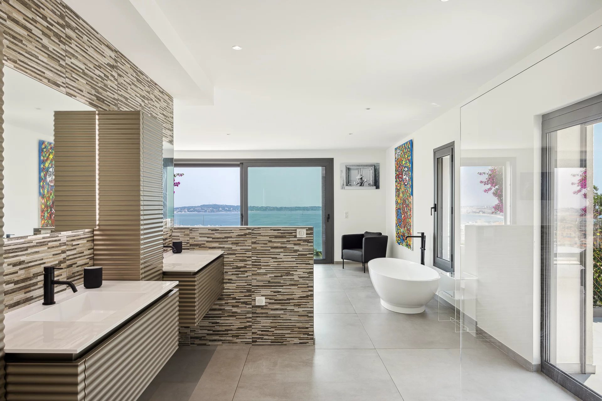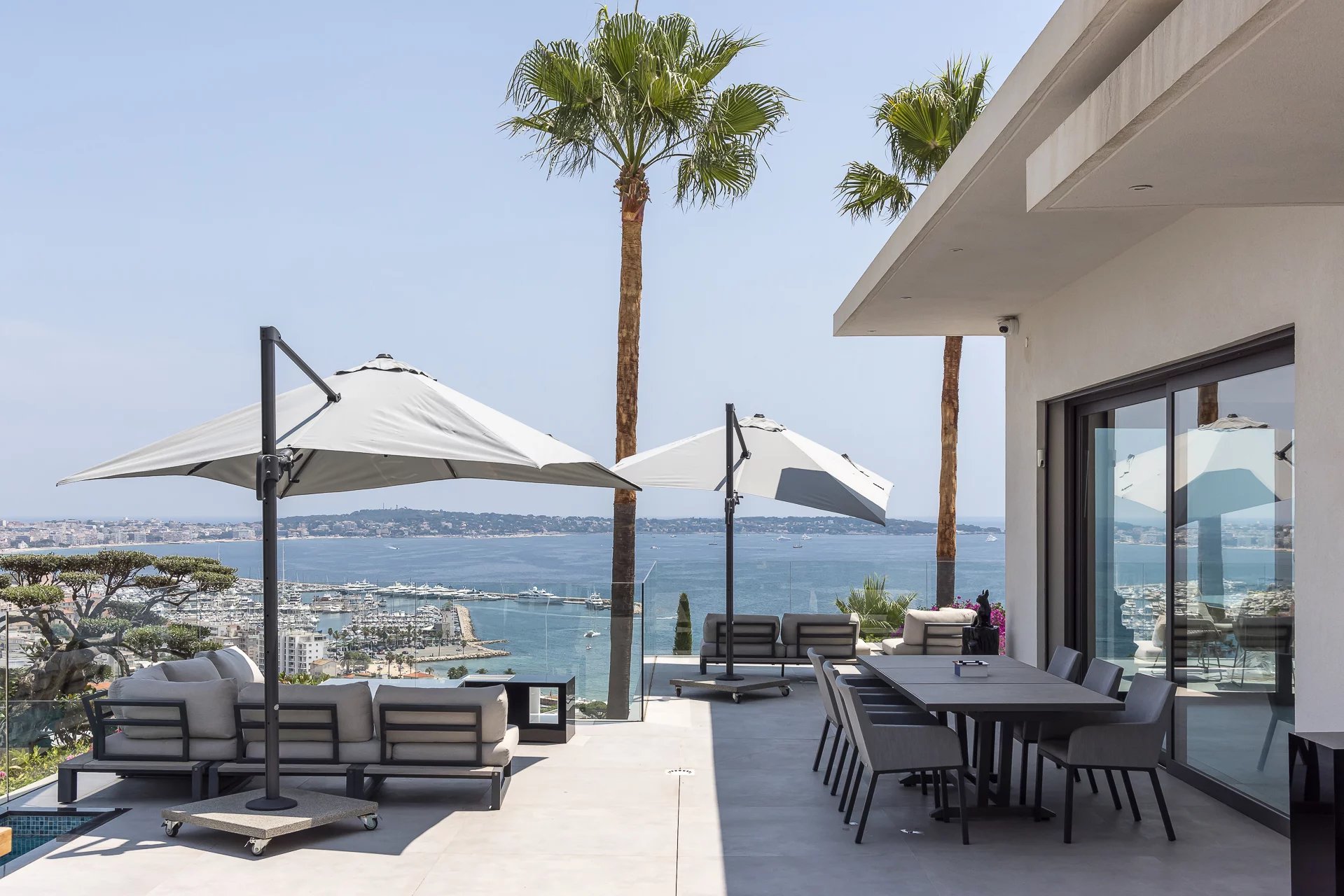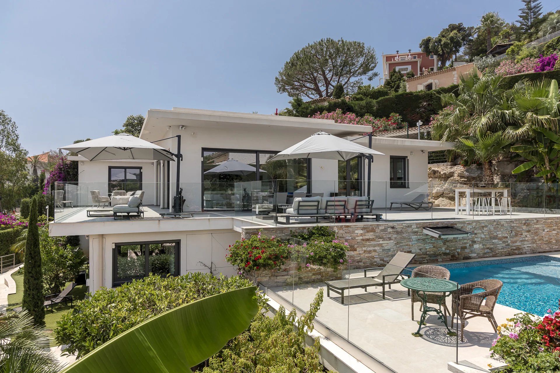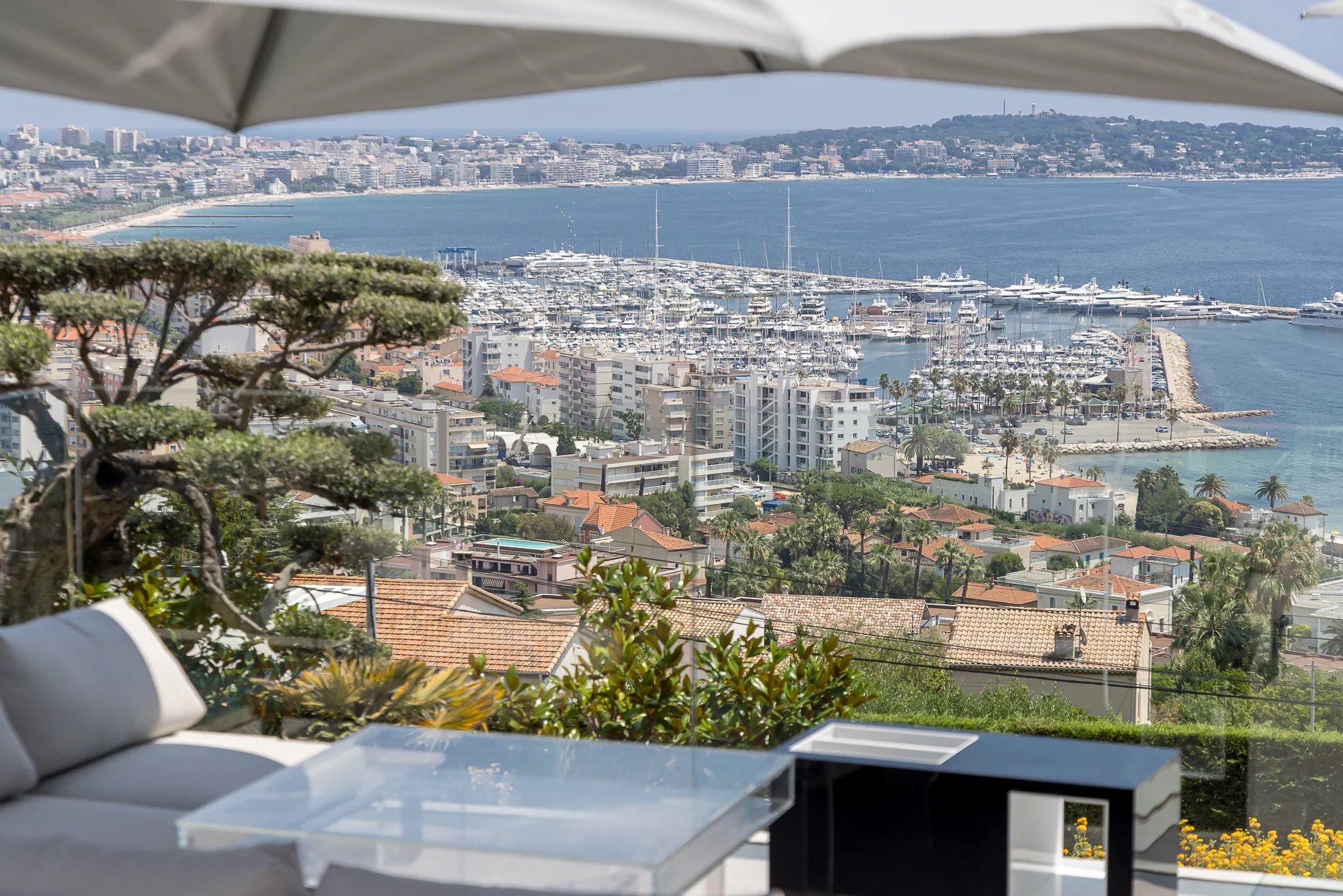 Superb modern villa in Golf-Juan of approximately 419 m², comprising: Upstairs, a living room with dining room, an equipped kitchen, a master bedroom with shower room and bath. On the ground floor, 4 en-suite bedrooms. Two studio annexes. Heated swimming pool 6x11. Land of about 1500 m². Garage.