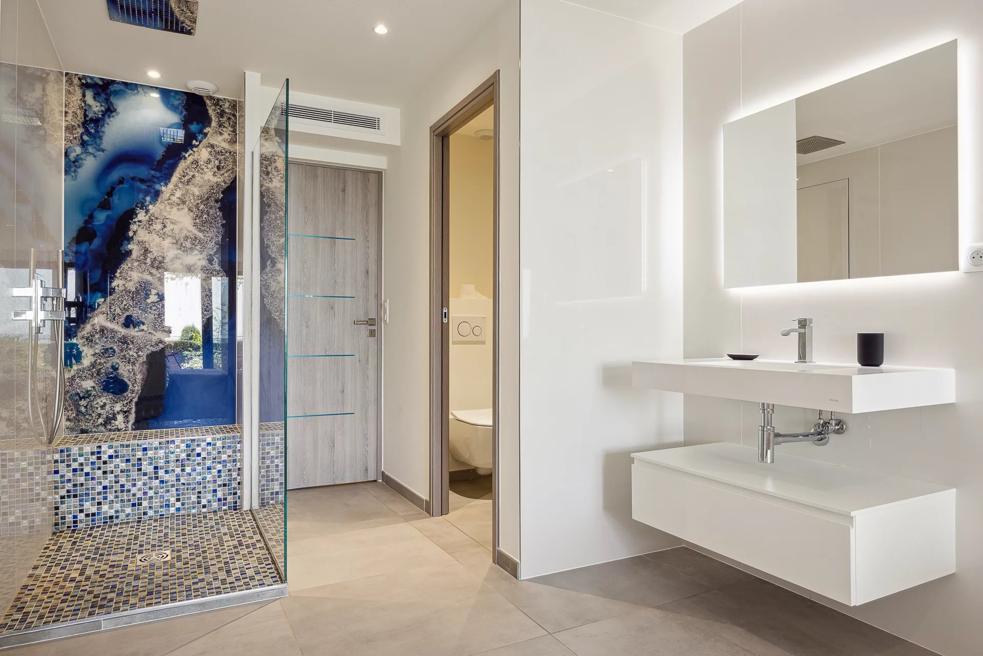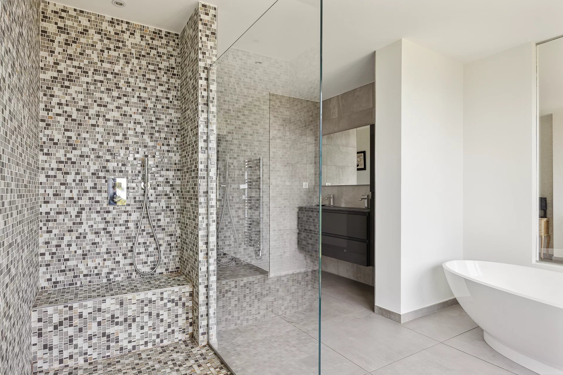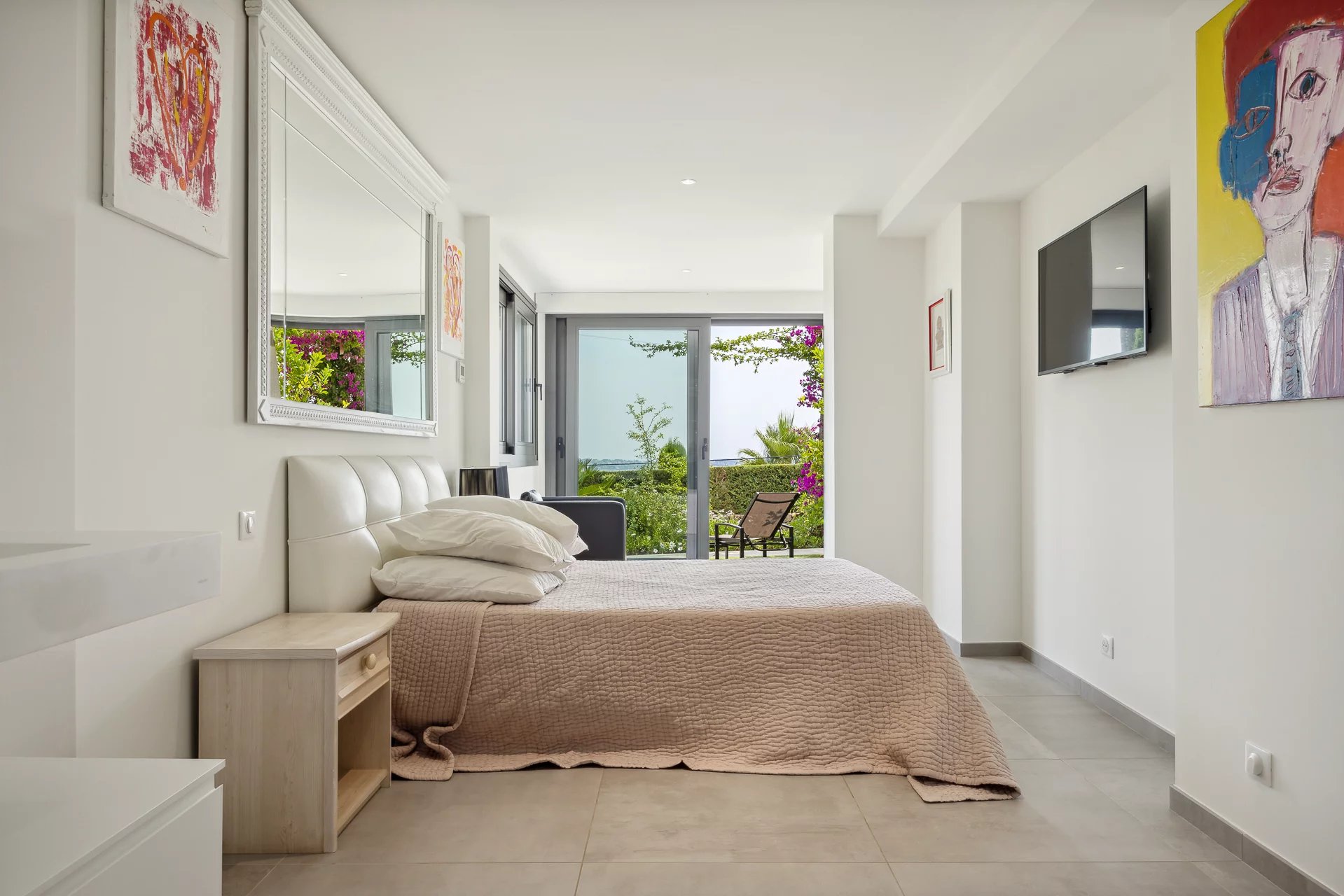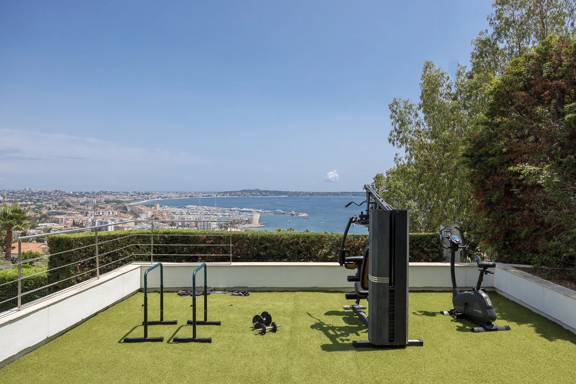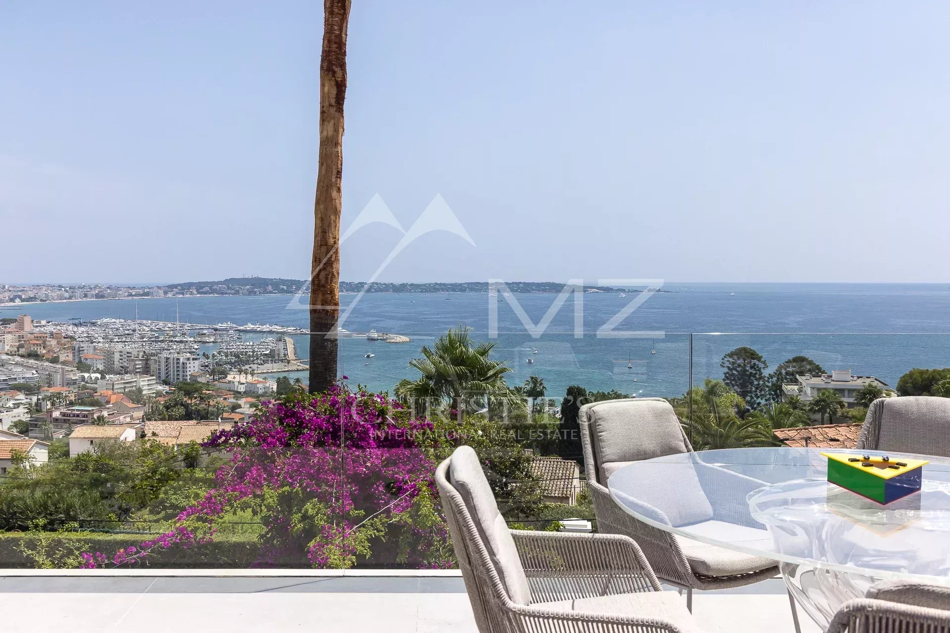 Superb modern villa in Golf-Juan of approximately 419 m², comprising: Upstairs, a living room with dining room, an equipped kitchen, a master bedroom with shower room and bath. On the ground floor, 4 en-suite bedrooms. Two studio annexes. Heated swimming pool 6x11. Land of about 1500 m². Garage.