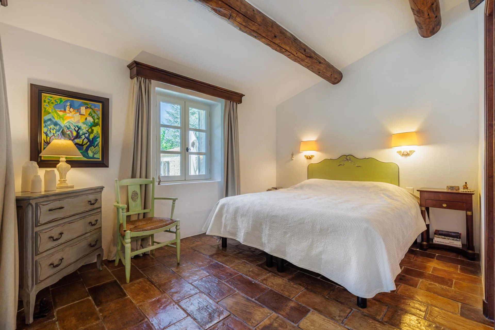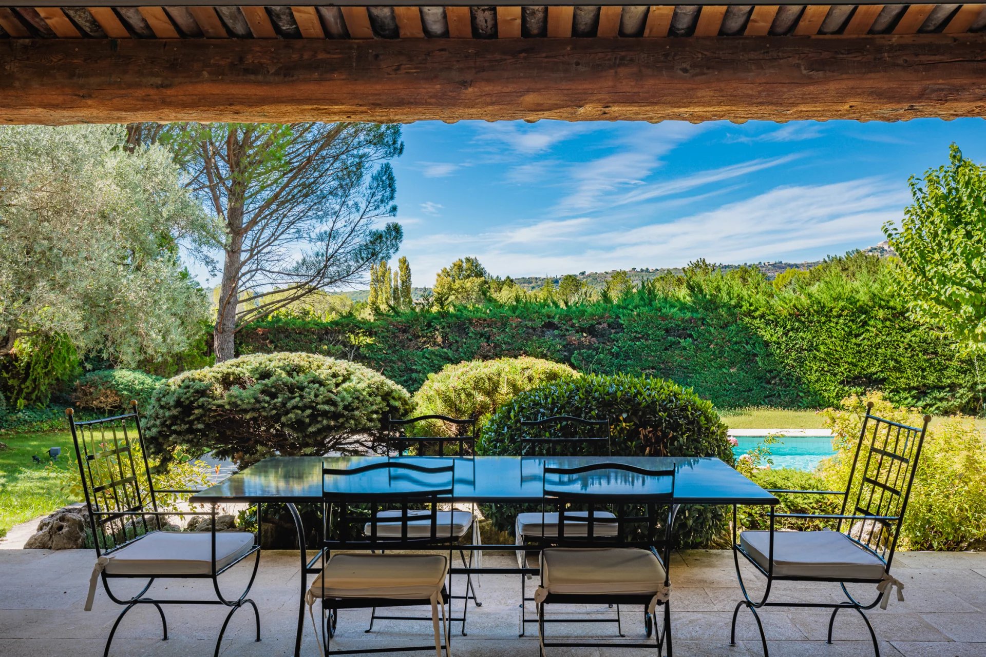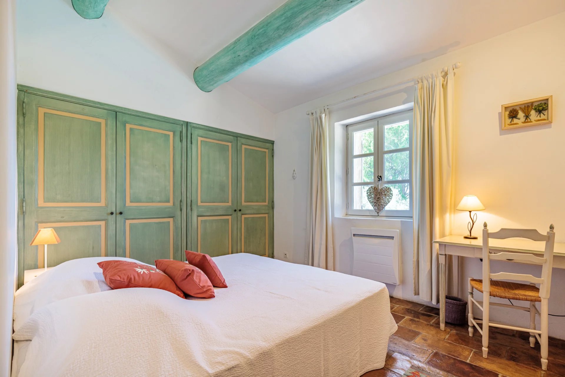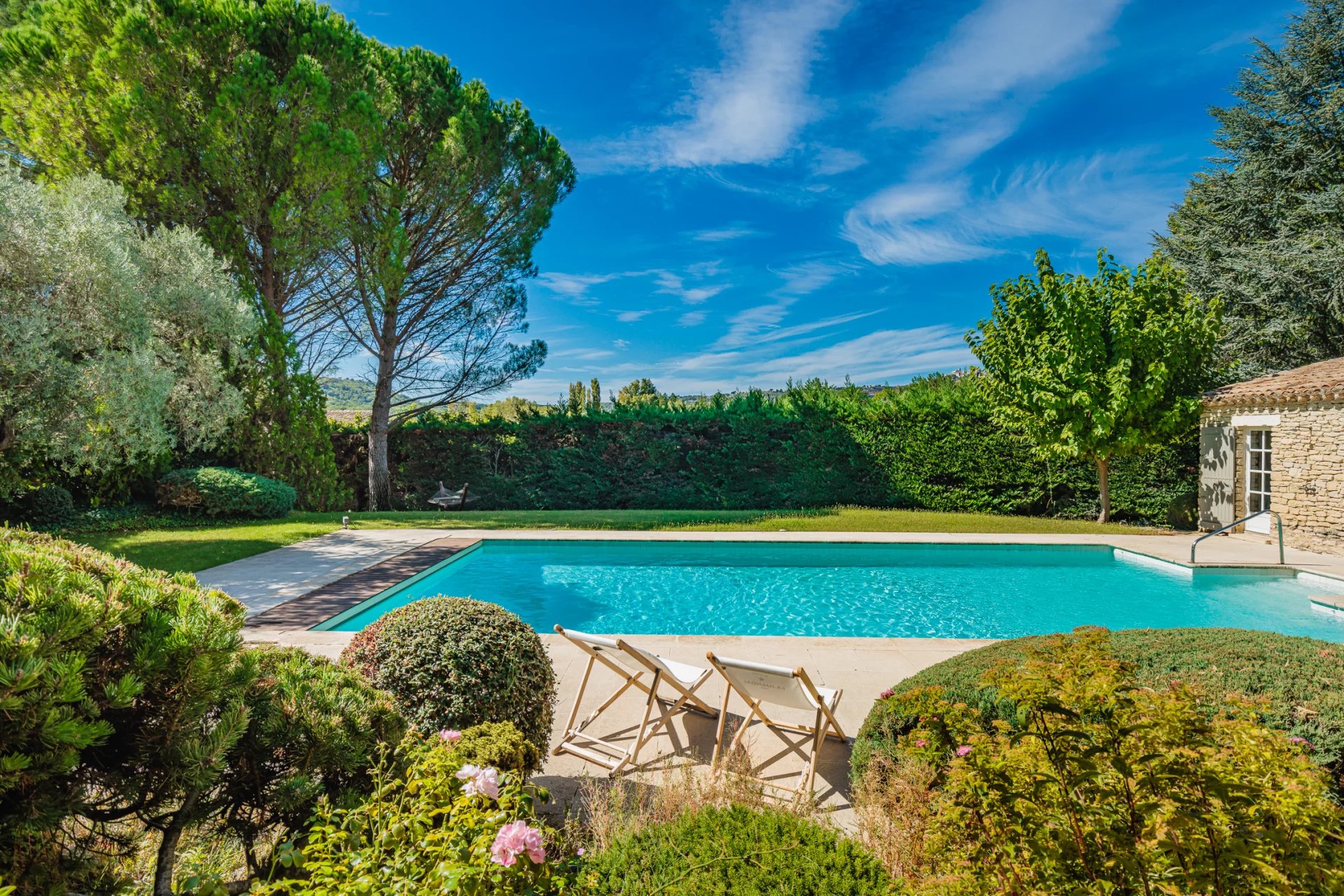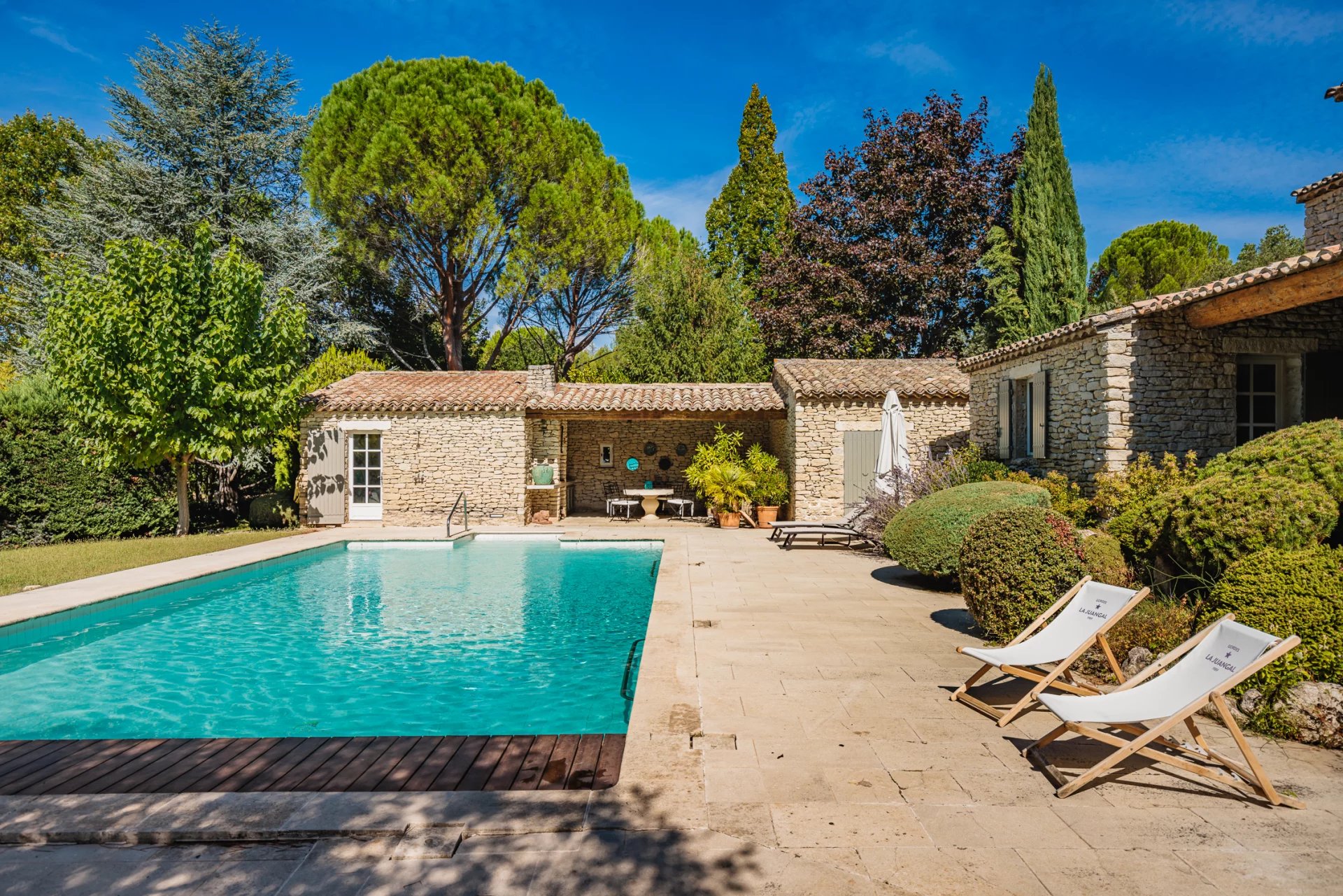A few minutes from the centre of Gordes, this lovely stone house offers a clear view of the village. On a pretty landscaped garden with swimming pool and two beautiful covered terraces, it is the perfect place for holidays in Provence. A large park with fruit and olive trees, cypresses, mulberry plane trees, cedars, pines... decorates the flat garden which also offers a naturally shaded parking. A lawned area surrounds the pool and its pool house with dining area.