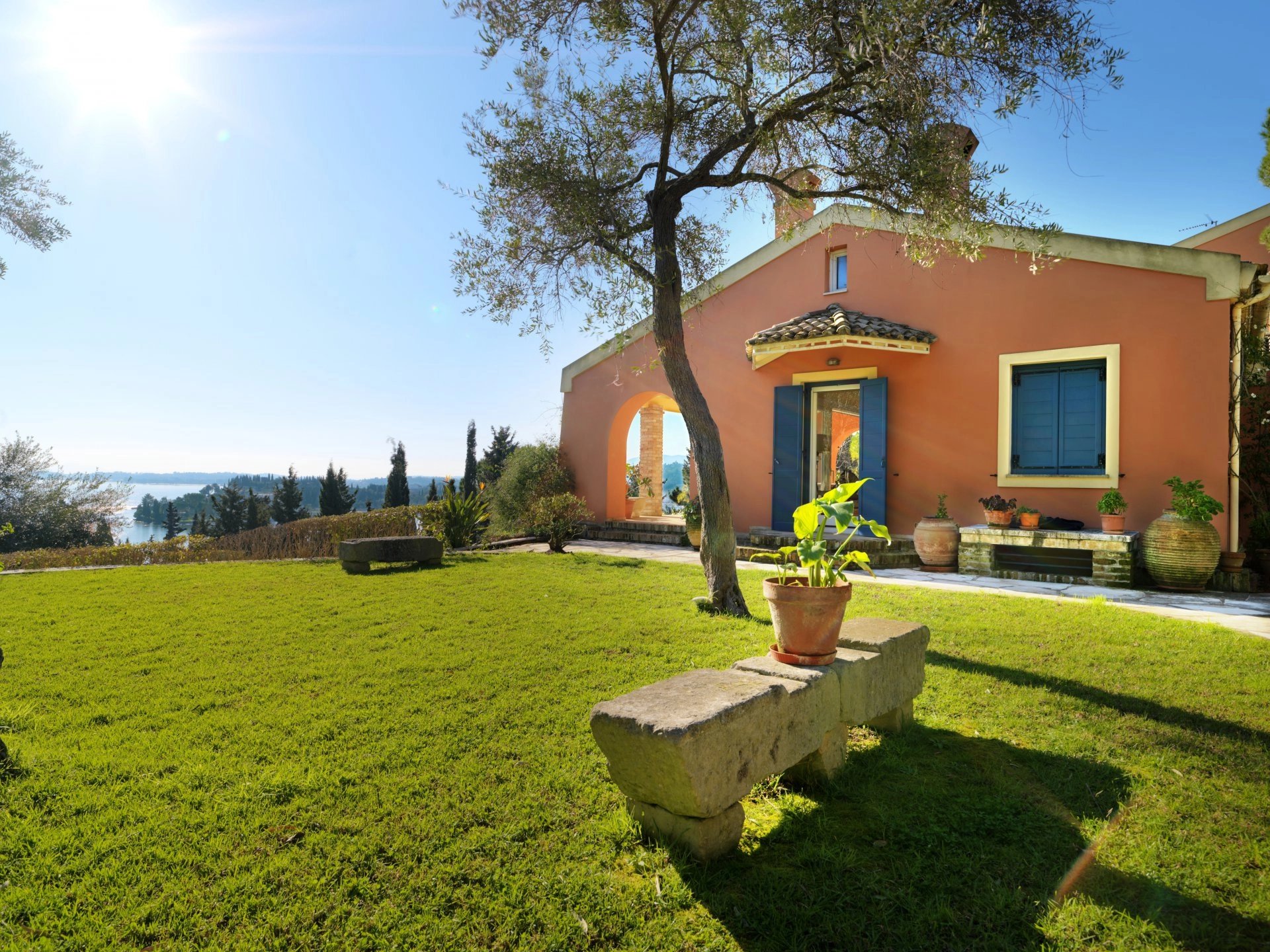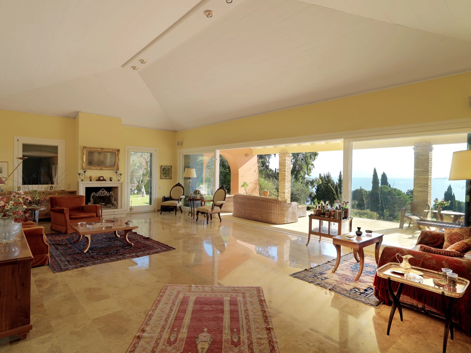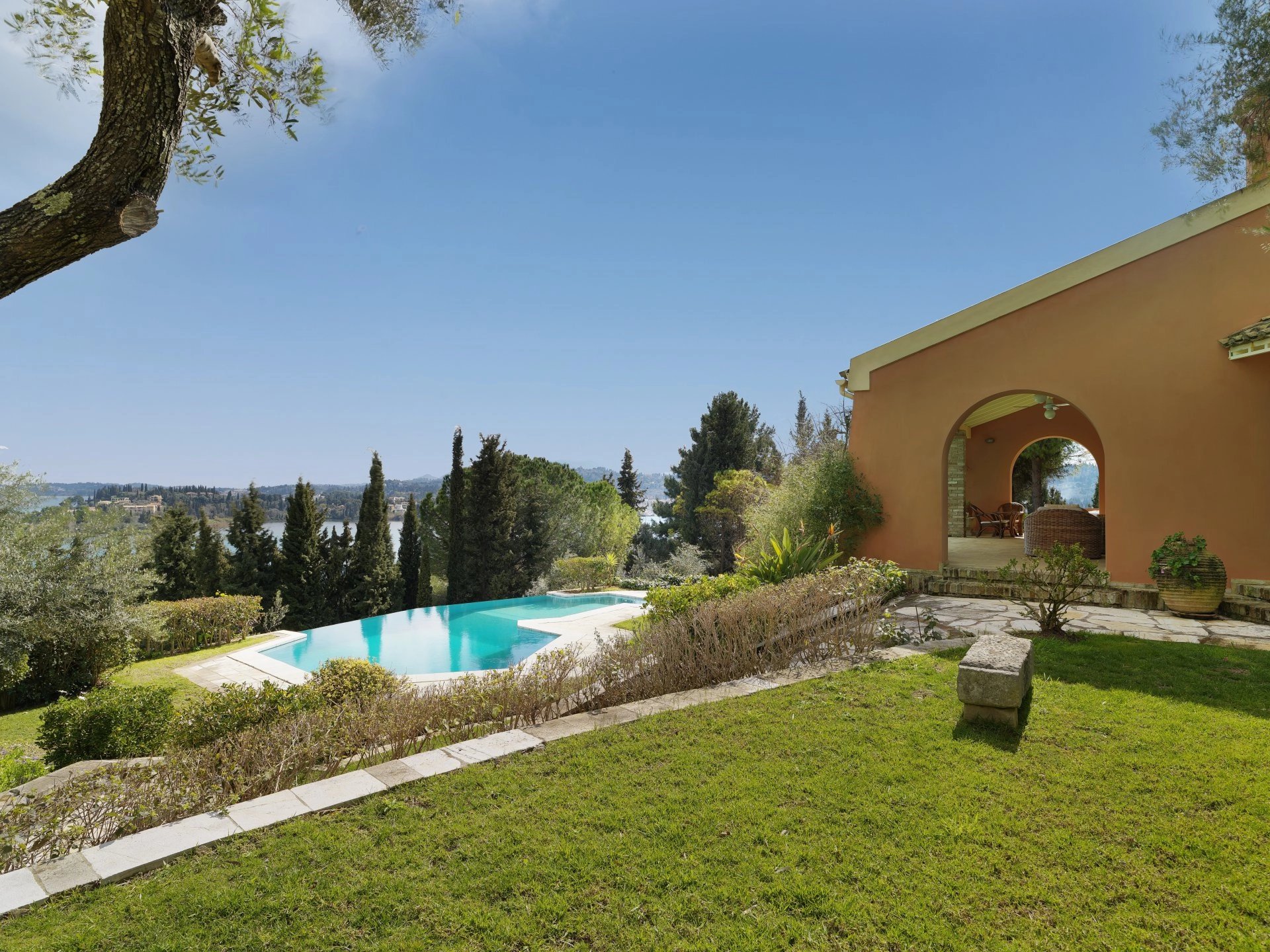 This luxurious villa of 750 m² is set in the prestigious enclave of Kommeno, only 10 km from Corfu Town and the international airport. It offers breathtaking panoramic sea views and is very close to the yacht marina at Gouvia. The house is laid out on 3 levels and features spacious entertaining areas, 8 bedrooms, a library-office, three kitchens, and numerous terraces. The grounds of 3,500 m² are beautifully landscaped and include a large infinity swimming pool.