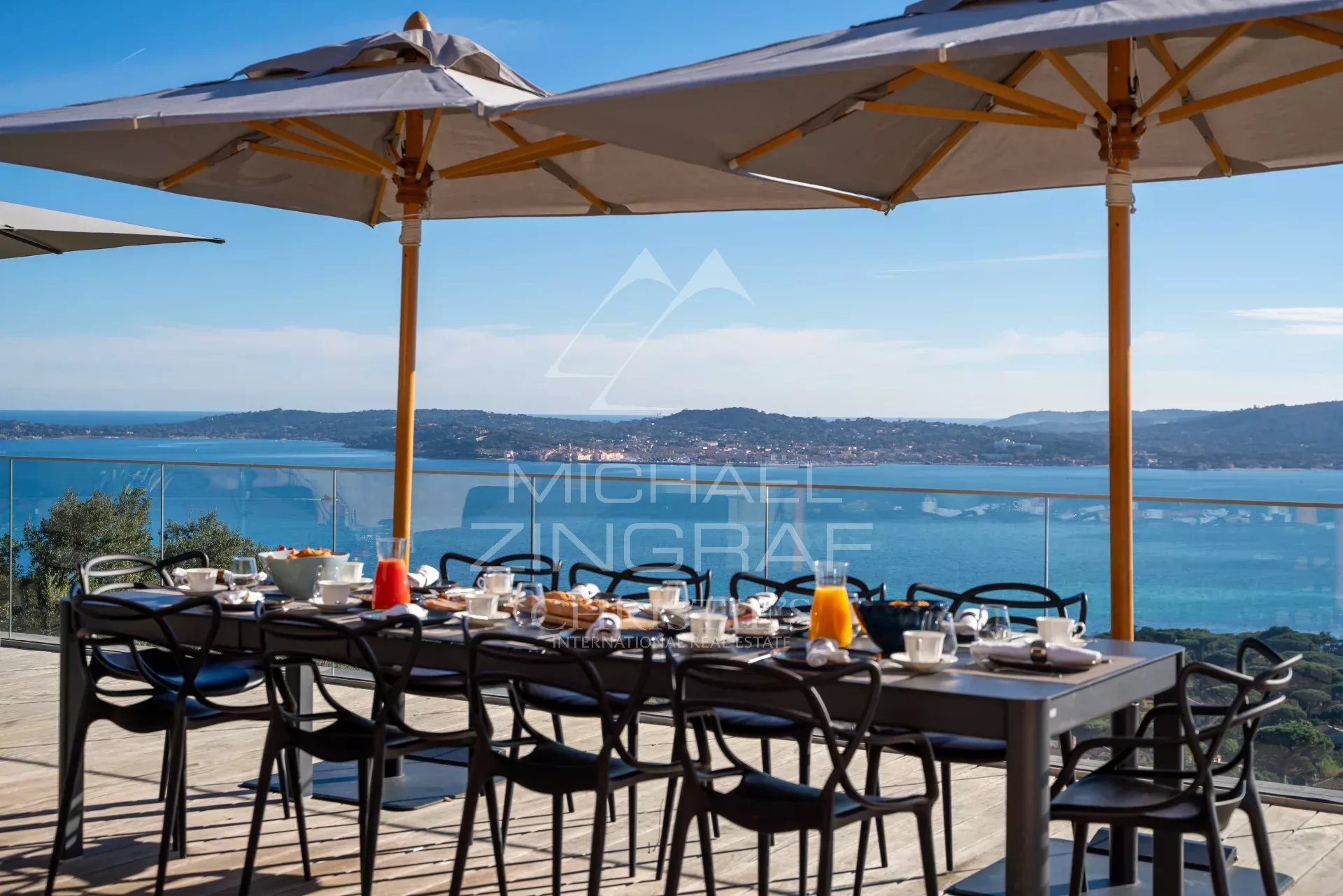 In an ultra-dominant position, facing south and bathed in light, this magnificent property is nestled in the heart of one of the most sought-after areas of Grimaud, in a closed and secure estate, offering an incredible 180° panoramic view of the sea, Saint-Tropez, and the Gulf.