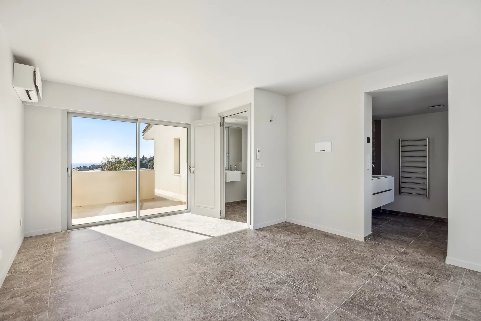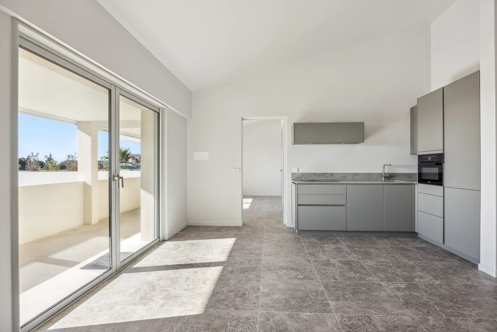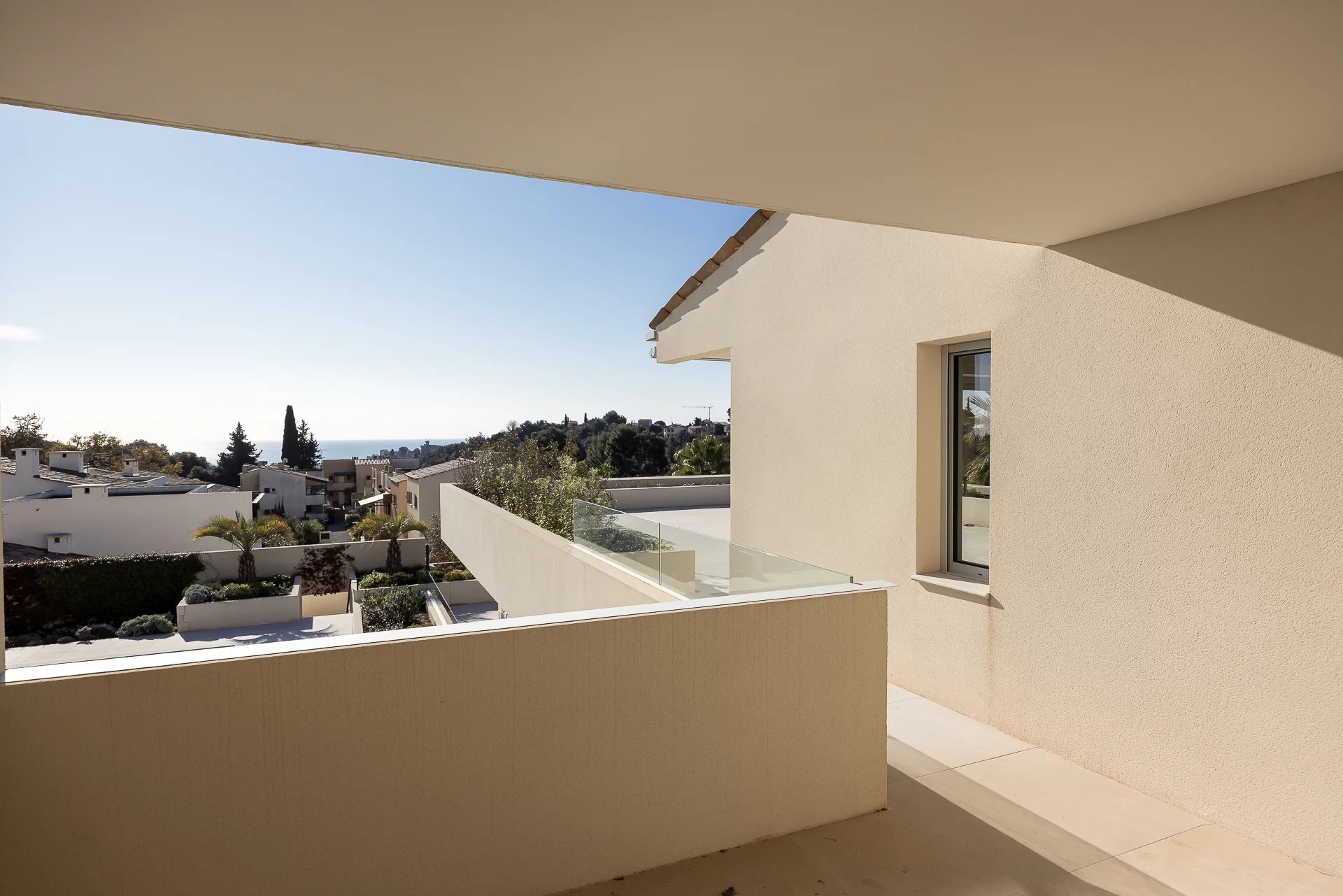 The second apartment, approximately 141 m², also includes a living room/dining area with an open-plan kitchen and access to a spacious terrace with sea views. It has three en-suite bedrooms, guest toilets, a cellar, and an open garage.