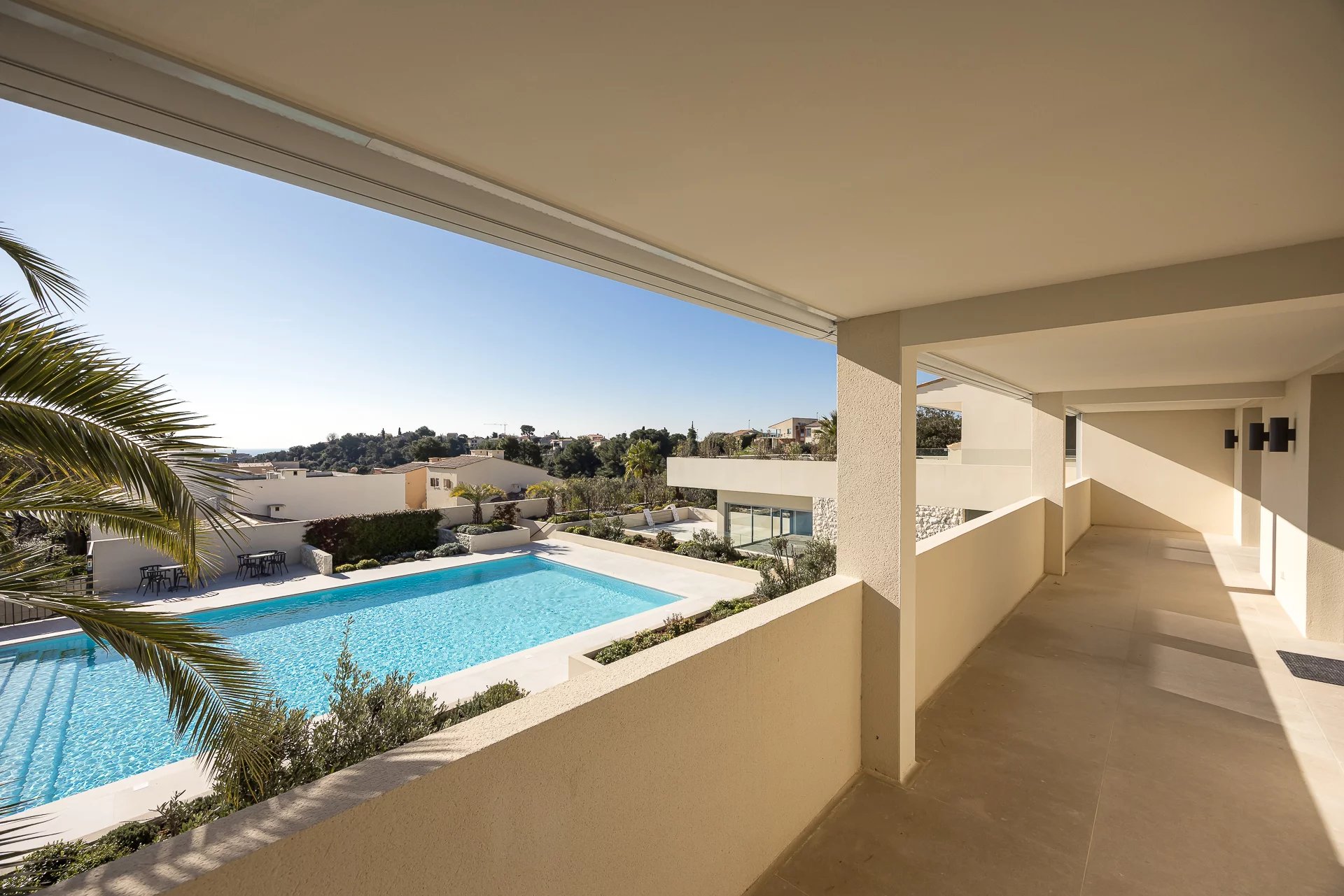 The fourth apartment, approximately 68 m², includes an entrance with a guest toilet and a living room/dining area with an open-plan kitchen leading to a terrace with direct access to the pool. It consists of two bedrooms, two shower rooms with toilets, and parking spaces.
