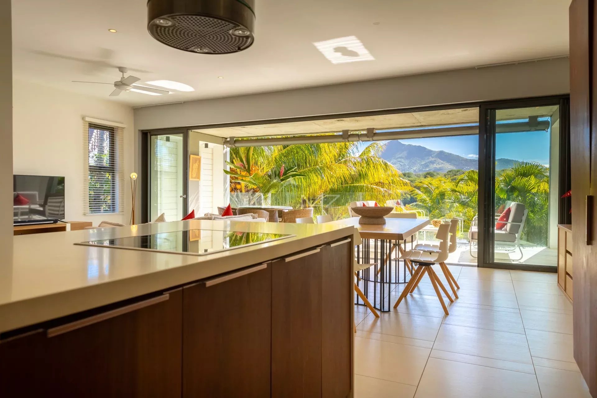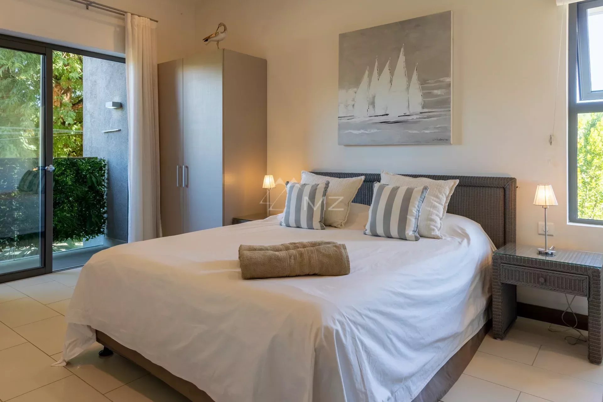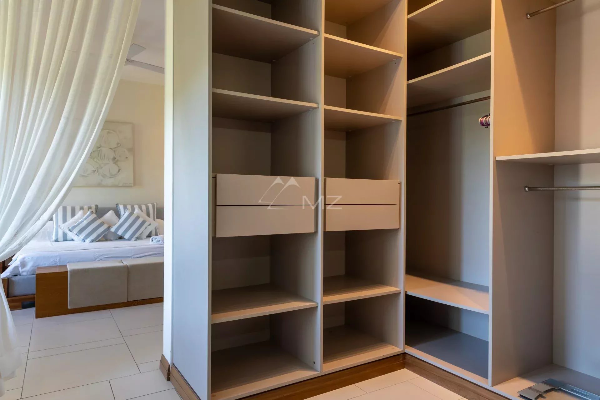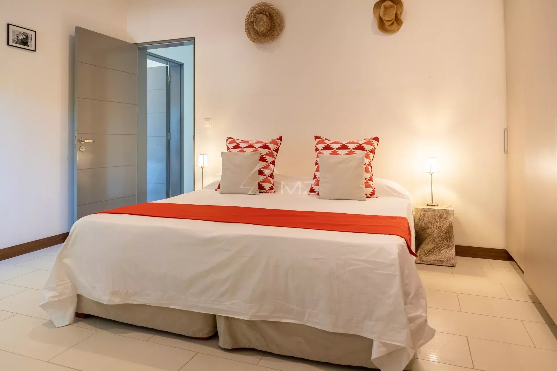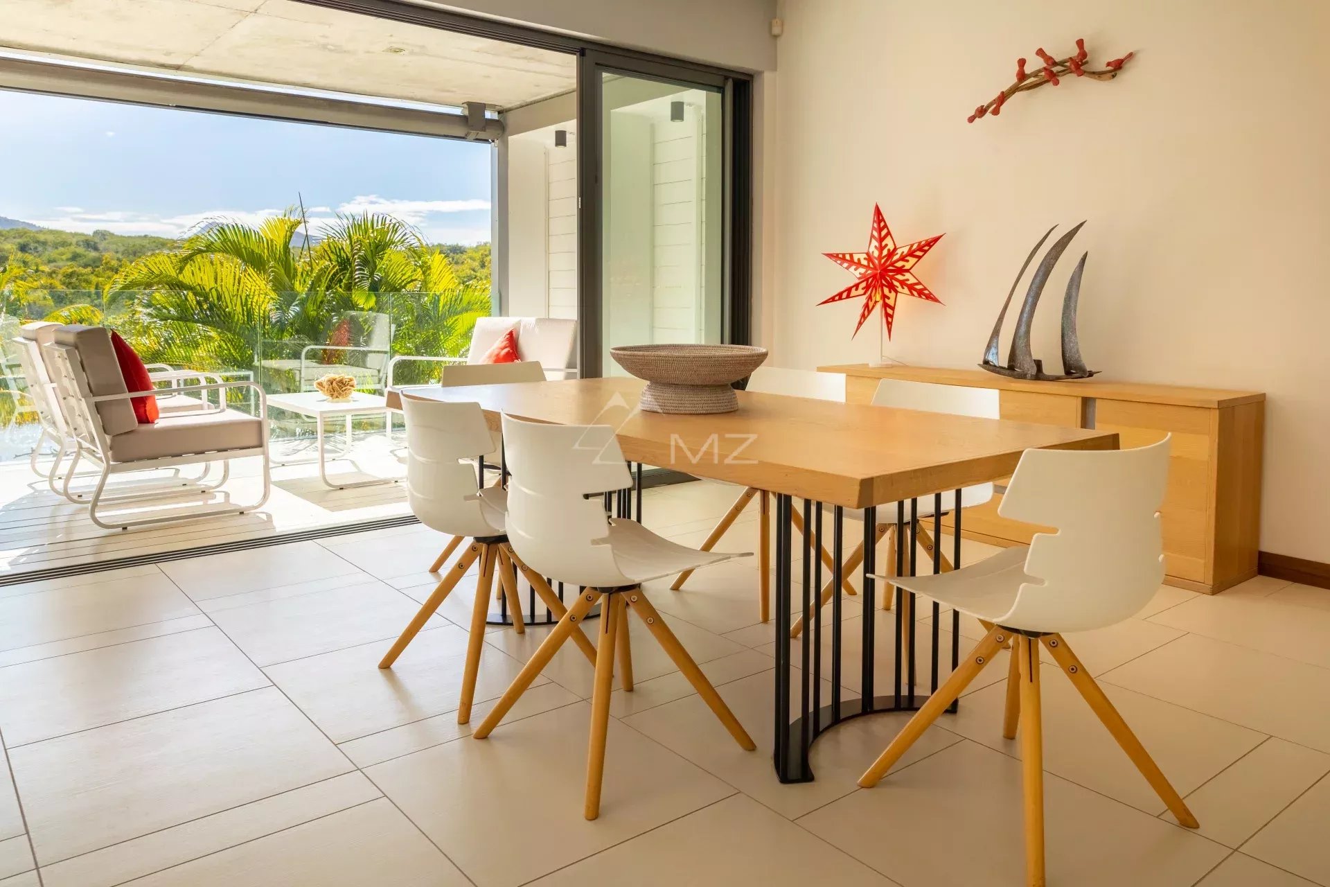 The en-suite master bedroom is equipped with a dressing room as well as a bathroom with a bathtub to relax. The other 2 bedrooms also have their own bathroom. This modern design apartment offers you great comfort in a trendy atmosphere and a "tropical-chic" setting.