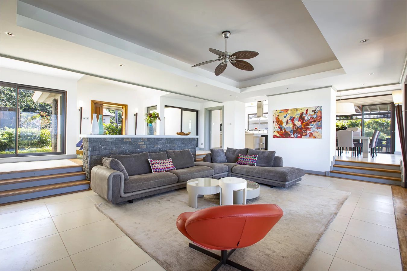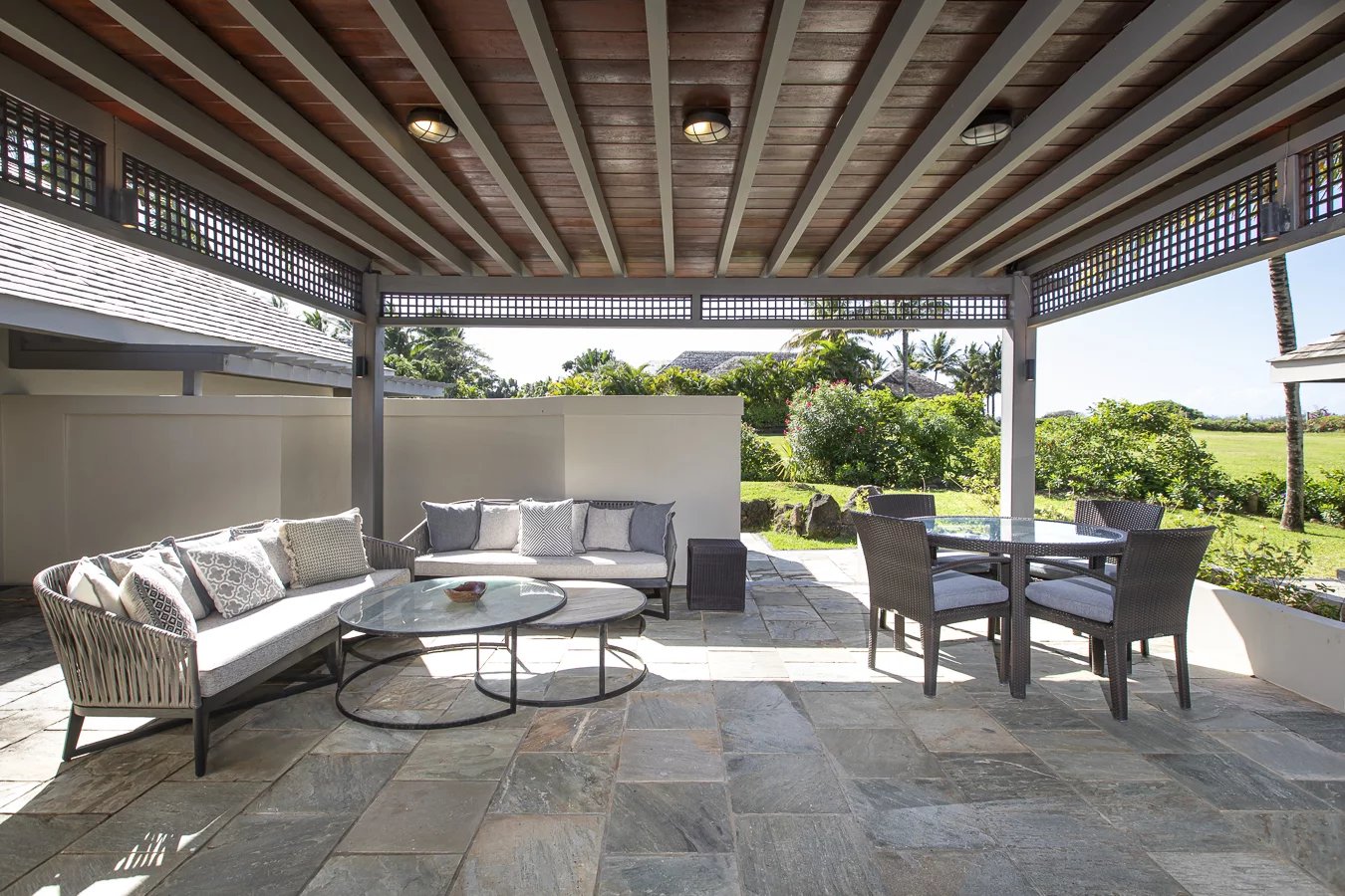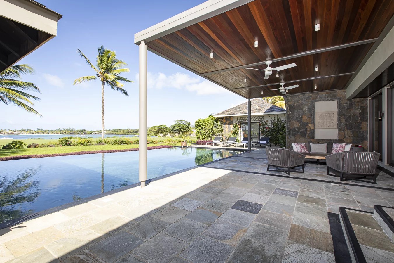 Offering magnificent views of the 18th fairway, facing the turquoise lagoon and Ile aux Cerfs Island, this 500m2 villa is built on a 2,044m2 plot and features traditional Mauritian architecture with pitched roofs. Volcanic stones and timber give character to the villa.