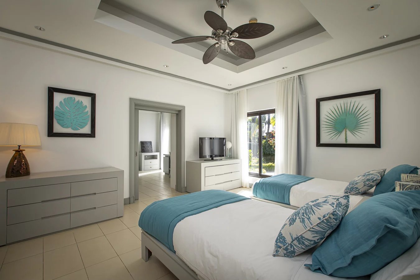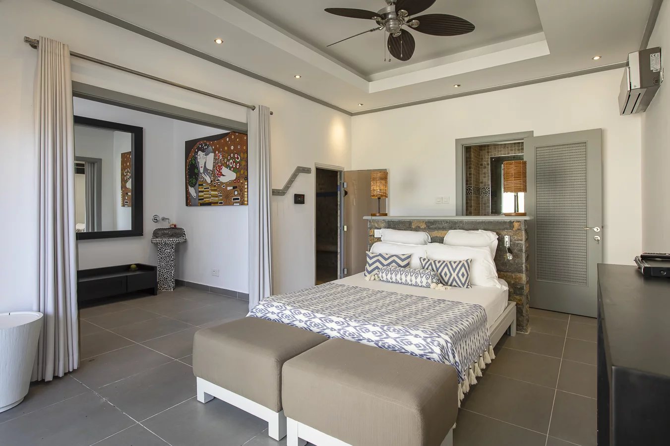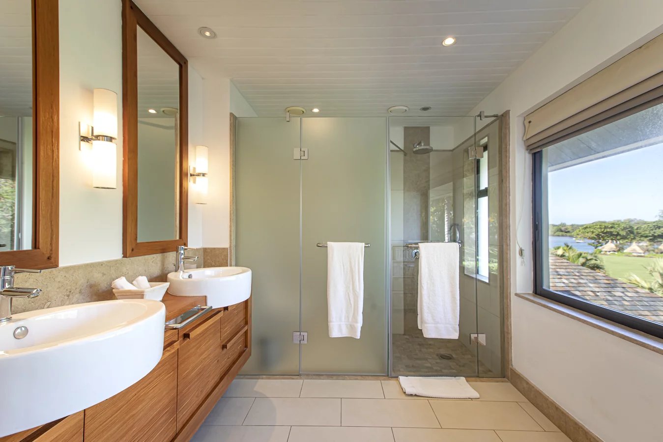 The villa has five bedrooms with en-suite bathrooms and dressing rooms, two on the ground floor with outdoor showers and two upstairs, as well as an en-suite studio ideal for guests, overlooking the golf course and the lagoon.