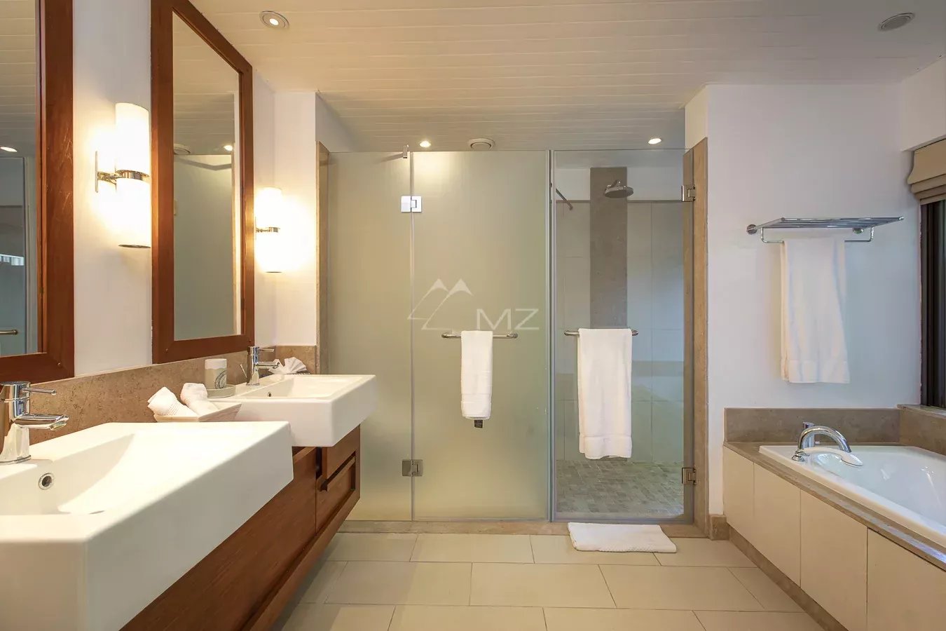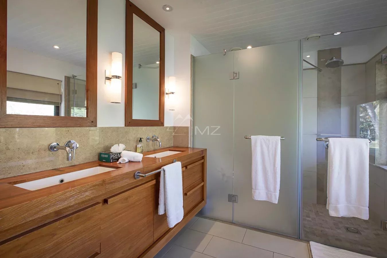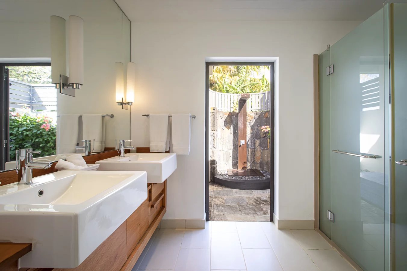 The villa has five bedrooms with en-suite bathrooms and dressing rooms, two on the ground floor with outdoor showers and two upstairs, as well as an en-suite studio ideal for guests, overlooking the golf course and the lagoon.