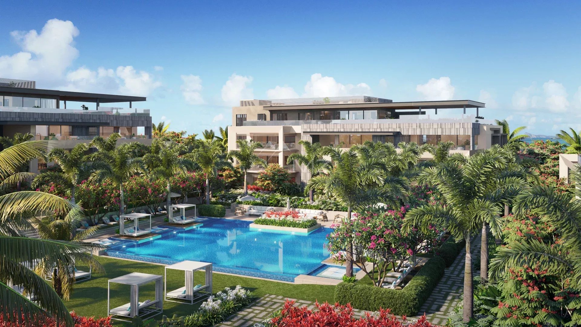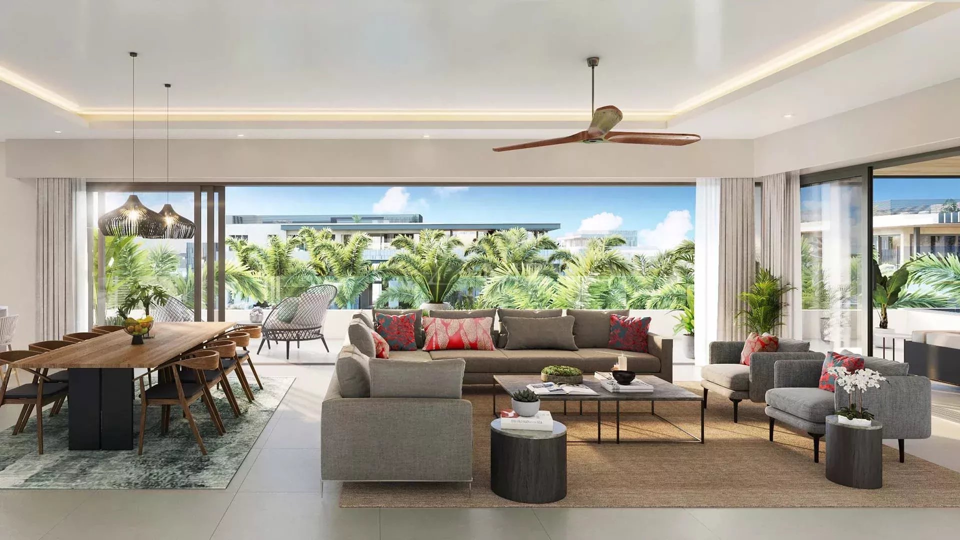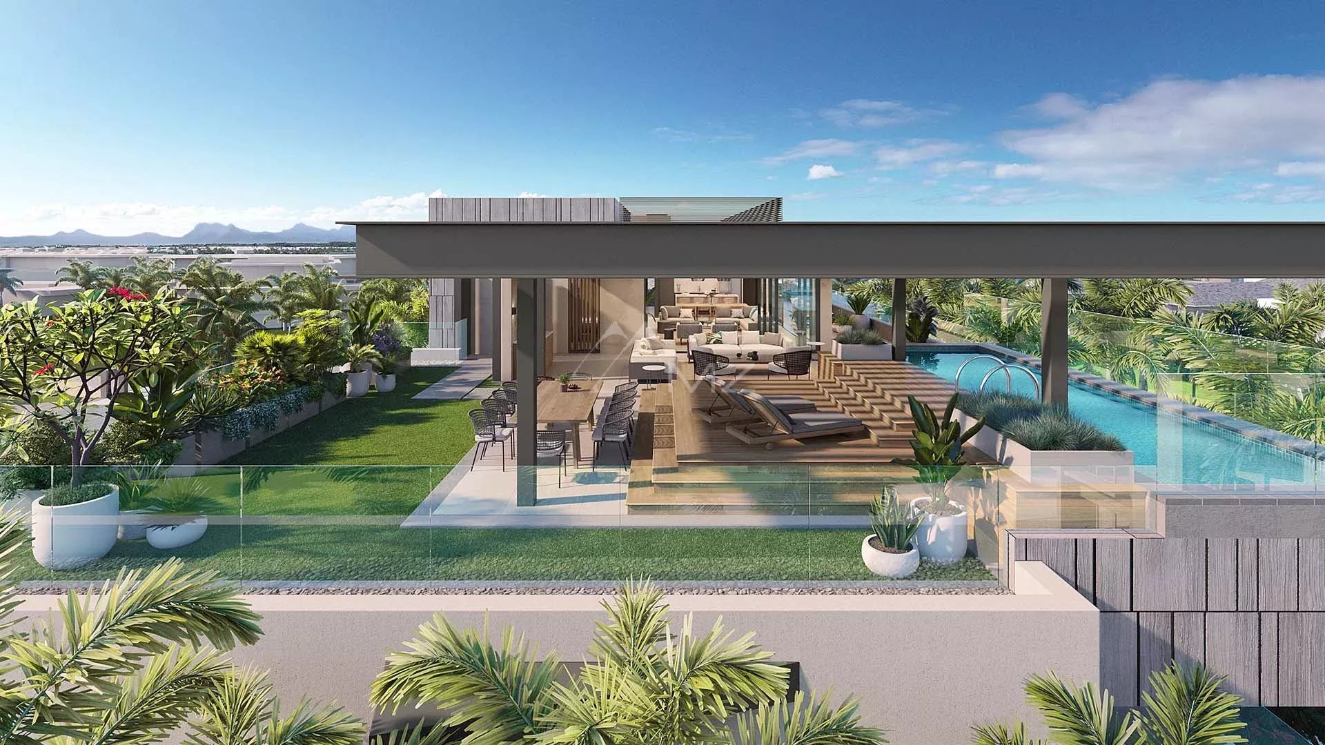 The architecture and design in these magnificent penthouses embodies the spirit, sleek design and warm tactile materials of the Mauritian lifestyle. Large private terraces and generous openings blend the inside and outside spaces into one, the pool terrace becoming a seamless extension of the living room. The large sailing canopies add to the distinctly tropical feel, so you can marvel in comfort at the amazing views to the sea or over the golf course to the mountains beyond.