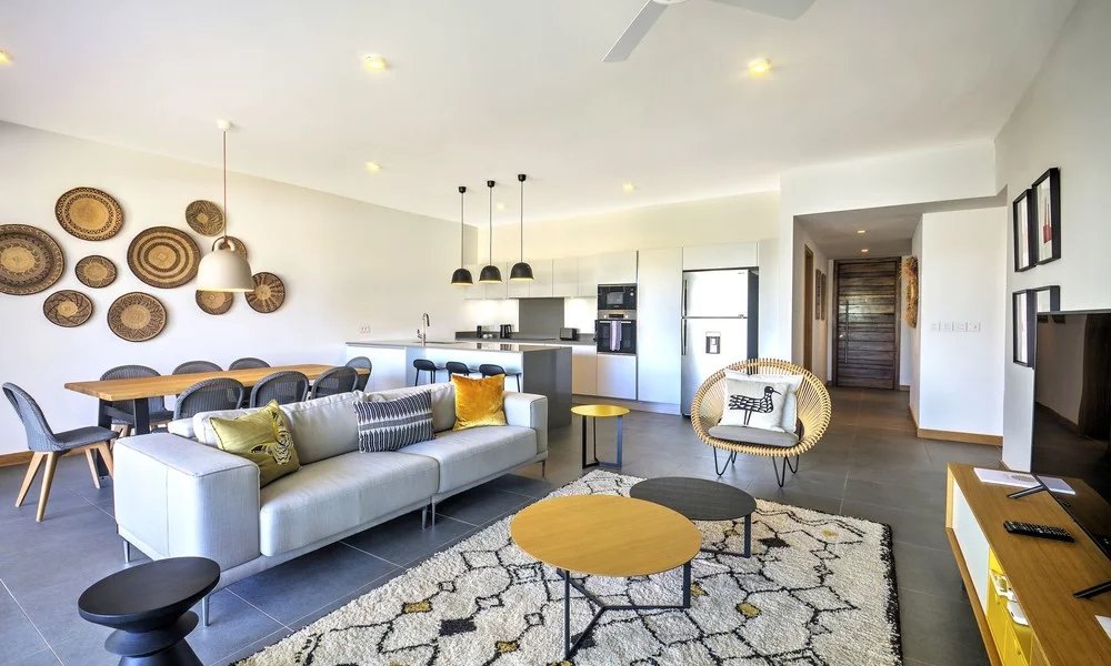 The living room is made up of the kitchen, the dining room and the living room. You will love this living room for its natural light and its opening onto the apartment's terrace or balcony. The rooms are designed to be comfortable, restful and intimate. Each bedroom has its own shower room with double sink. In the master suite, a king size bed. A charming all-season apartment in Mauritius. Whether inside or outside, the layout of this property offers everyone the opportunity to relax. Access to the communal swimming pool is a few steps from your apartment.