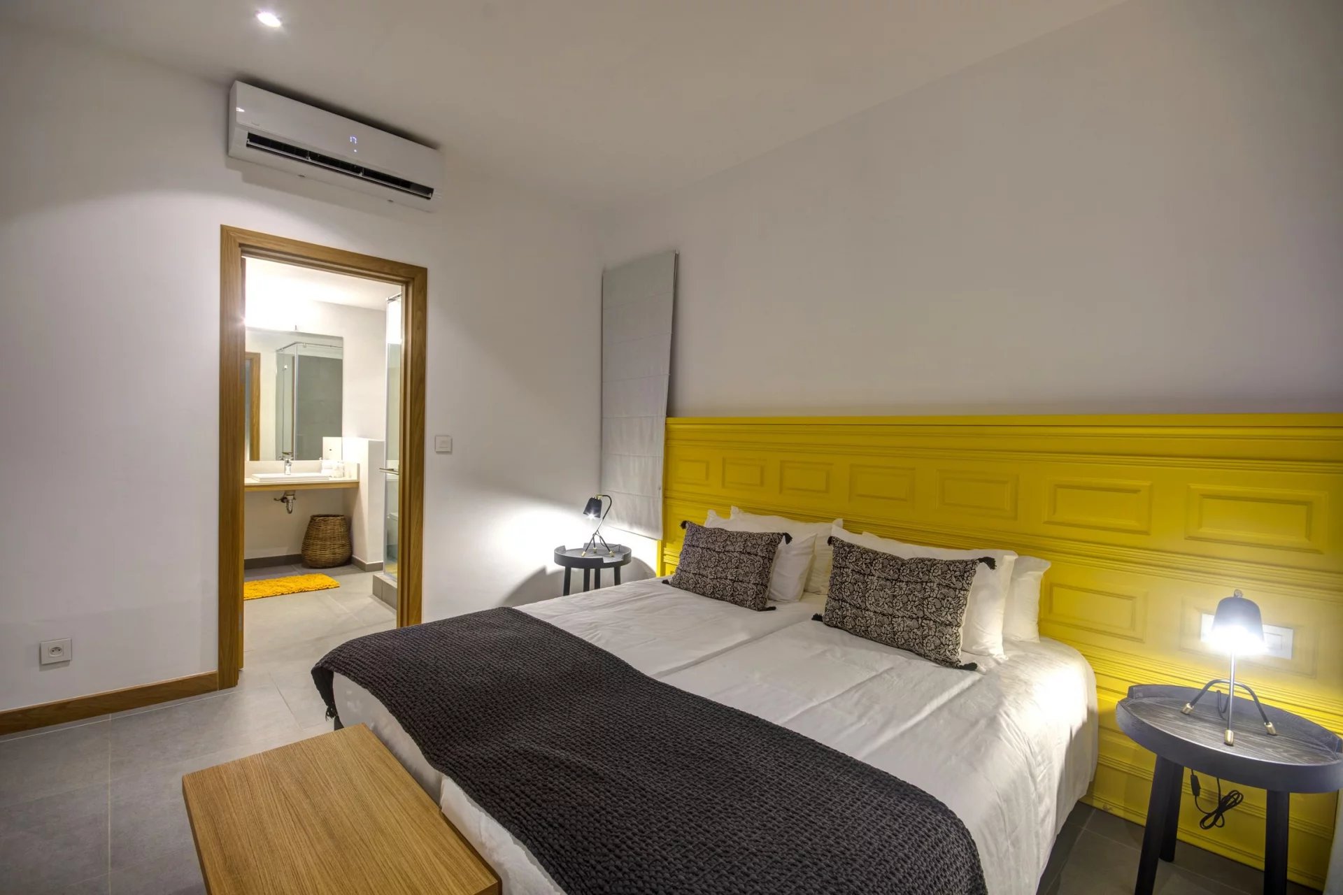 A bedroom opening onto a private covered terrace, and overlooking the garden and the swimming pool.