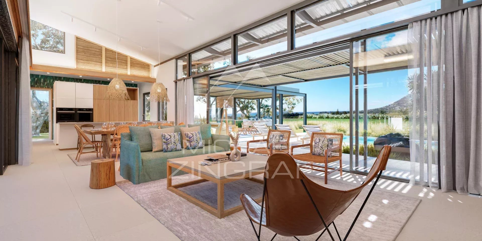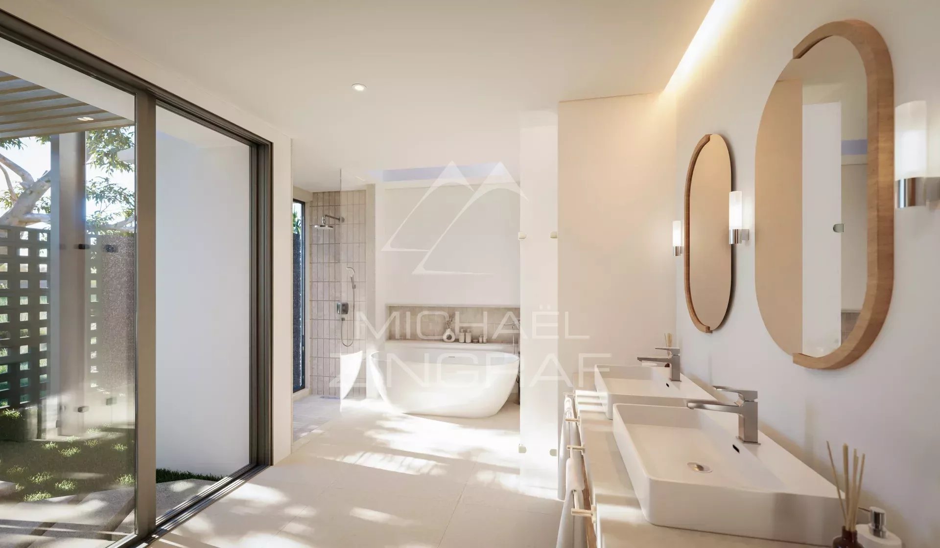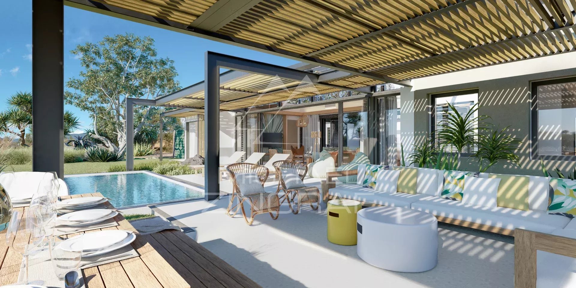 VILLA N: This villa combine elegance, space and privacy, with superb views of the golf course and Tourelle de Tamarin Mountain. These plots enjoy an ideal orientation, sheltered from the wind and taking full advantage of natural lighting. Its patio with tropical landscaping is a green lung and a central point for the household’s daily life. It is an ultimate tropical family home with three en-suite bedrooms (with an optional fourth bedroom) and large living spaces combining a living room, a dining room and an open kitchen facing out towards the outdoor living spaces (gazebo and pool).