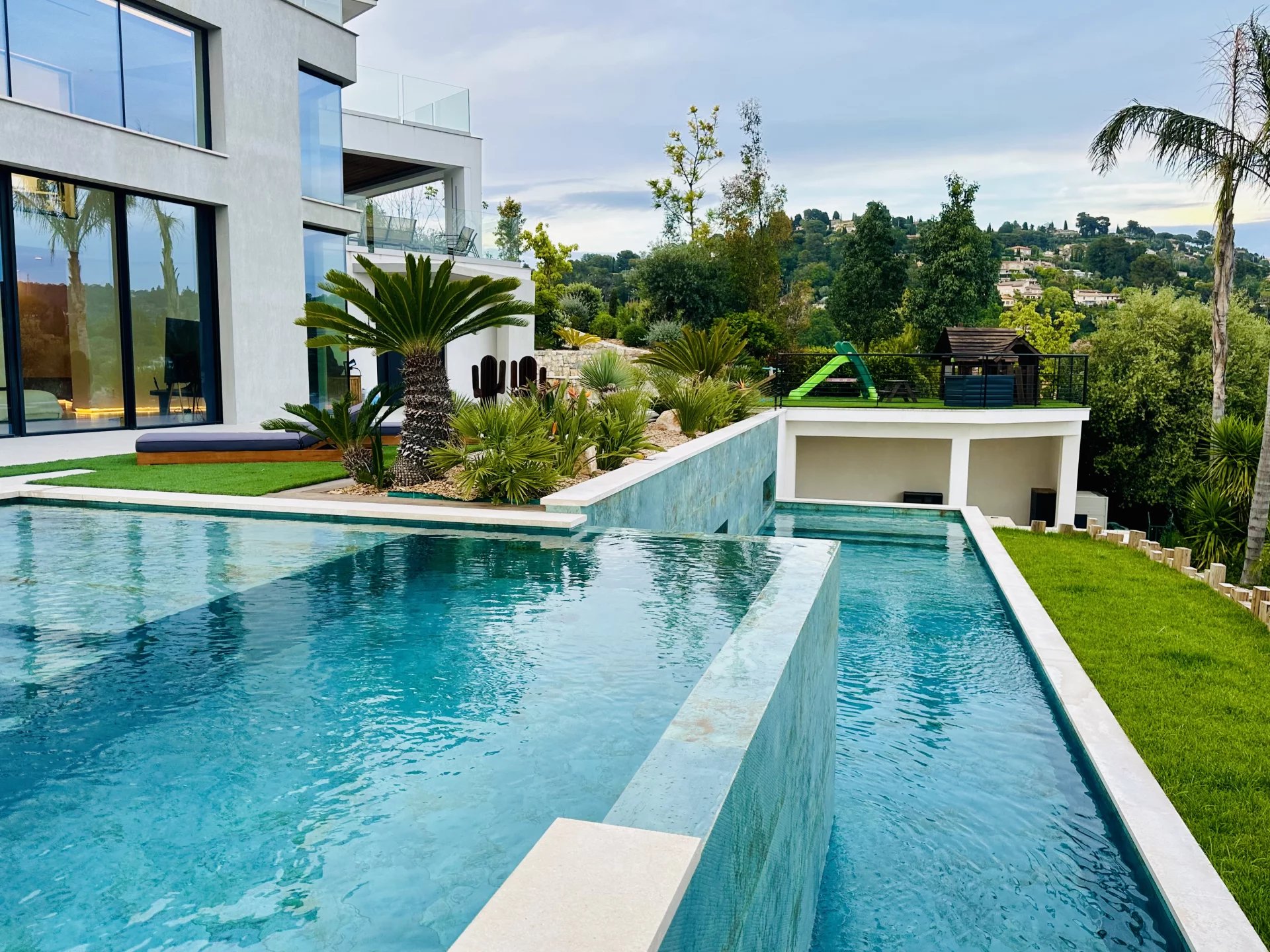 In a prime area of Mougins, a beautiful contemporary villa of approx. 500 sqm offering a refined garden with a heated infinity pool, a pleasant pool house (equipped with a pizza oven and barbecue). On a grounds of approx. 2000 sqm, in absolute peace and quiet, the house features a large living room with fireplace, a dining room, an open kitchen, a games room and a cinema room. A spa connects the house to the terrace, with jacuzzi, sauna, toilet and shower room. On the first floor, there's a large master suite with dressing room and large bathroom, and on the same floor, an en suite double bedroom and laundry room. Upstairs, 3 bedrooms, each with shower or bath and private terrace. Storage and parking space within the property.
