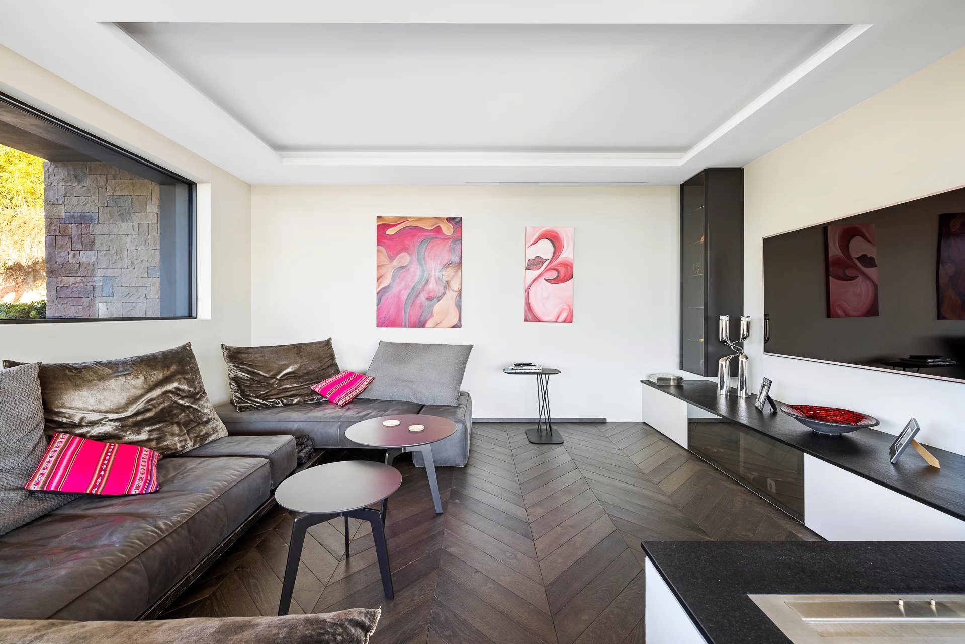 Newly built contemporary villa located on the hills, 5 minutes driving to Mougins village, its shops and restaurants. This property is perfectly implanted in the middle of nature, with its pine trees and mediterranean plants. It offers 5 double bedrooms and their en suite bathrooms, a double living area opening onto a terrace with its panoramic view over the hills and Mougins village. Several summer lounges and dining areas. Swimming pool 11m x 3,5m with counter current swimming. Pétanque court.