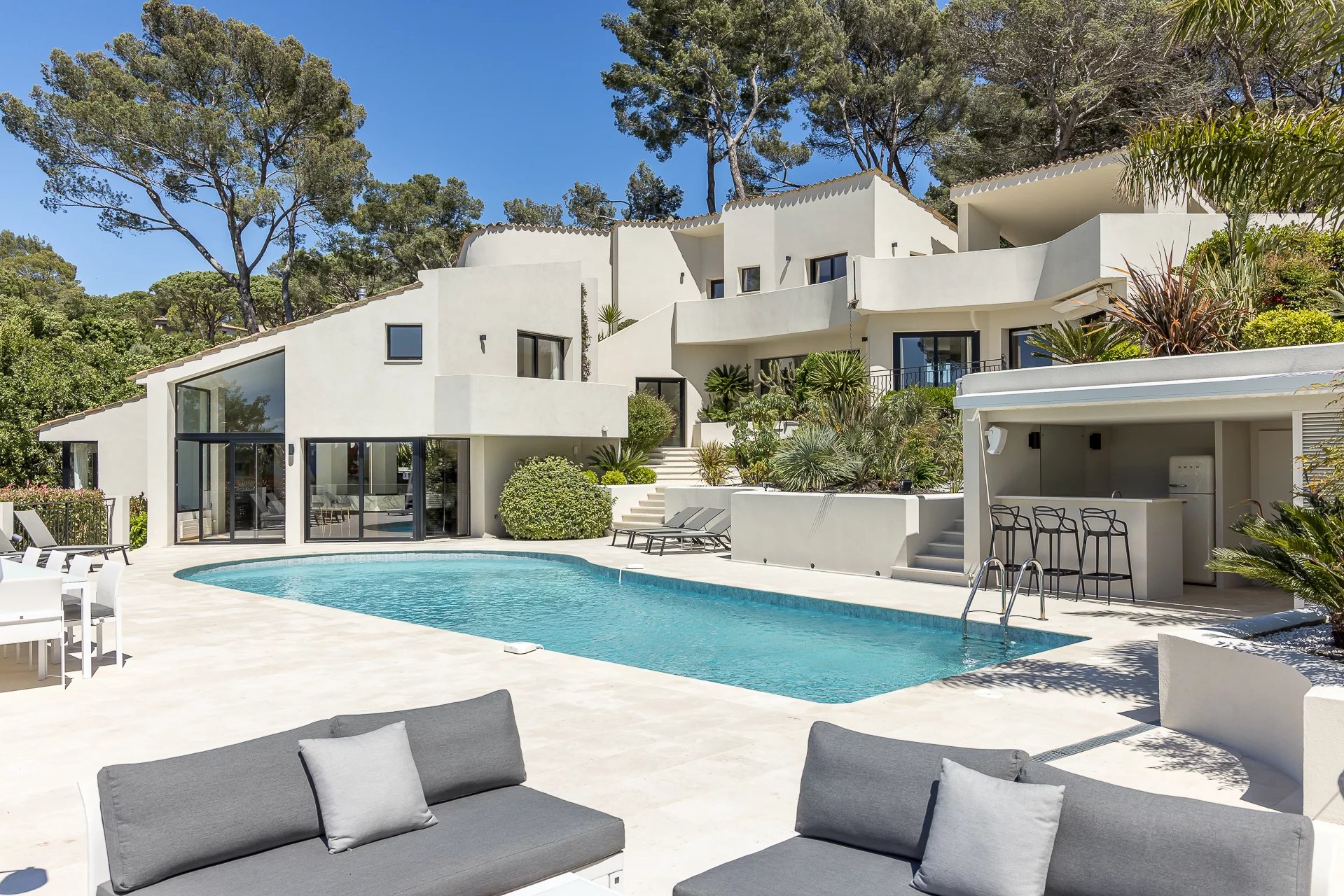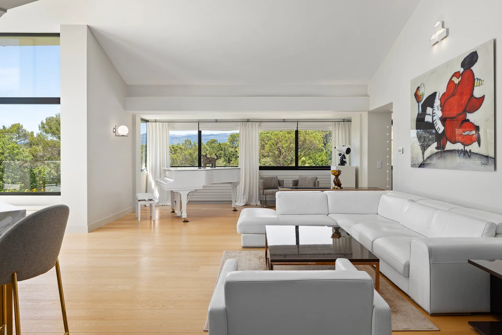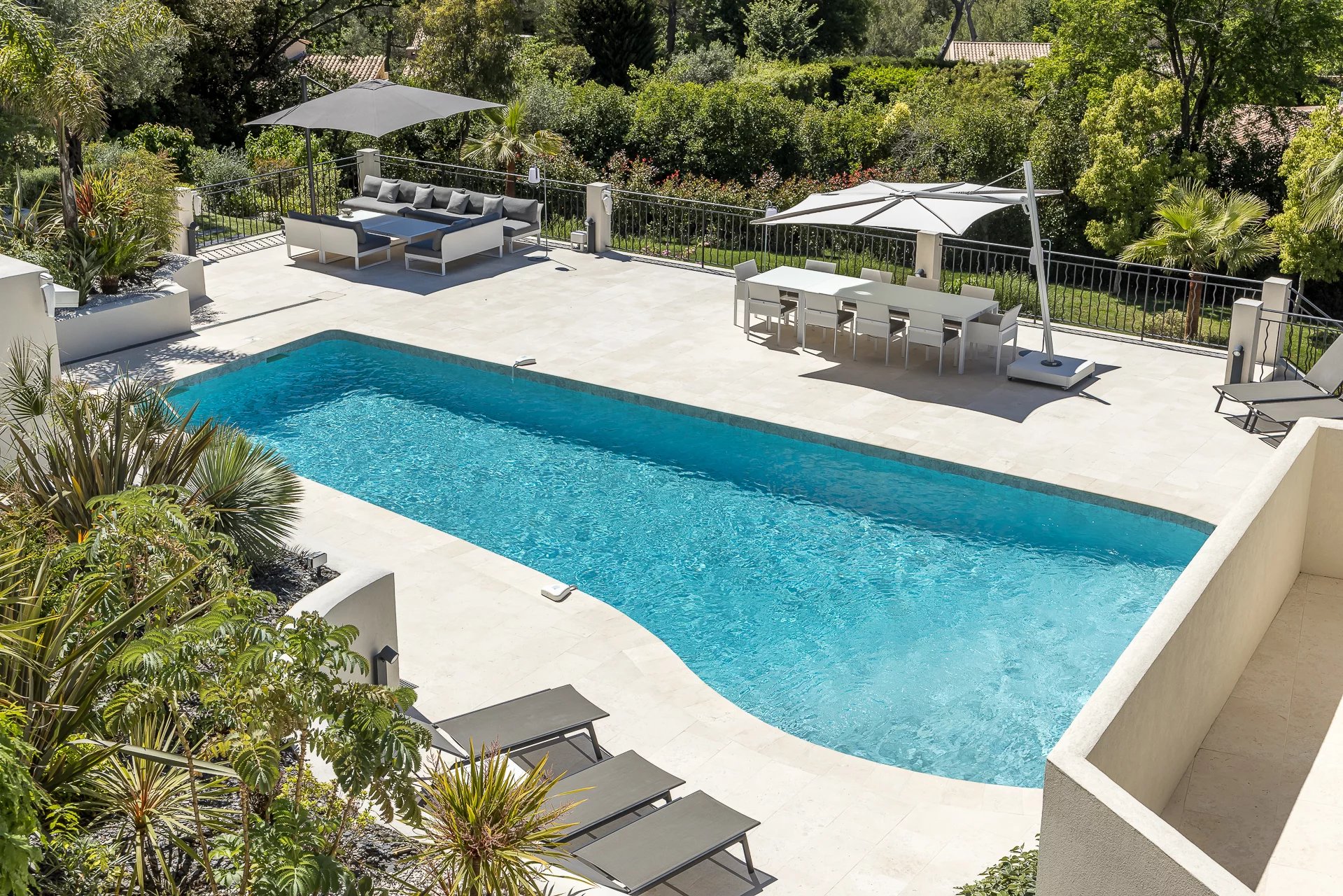 Located in a private domain, in a quiet and residential area, this nice villa of 450m2 has a dominant position and offers 5 double bedrooms and their ensuite bathrooms. Open views over the surrounding hills and old village of Mougins. Tastefully decorated and furnished with high quality furniture, this property also offers several indoor and outdoor lounge areas with its triple reception room opening onto the pool and several fitted terraces. Salted heated pool of 17m. Pool house with a bar, shower and toilet.