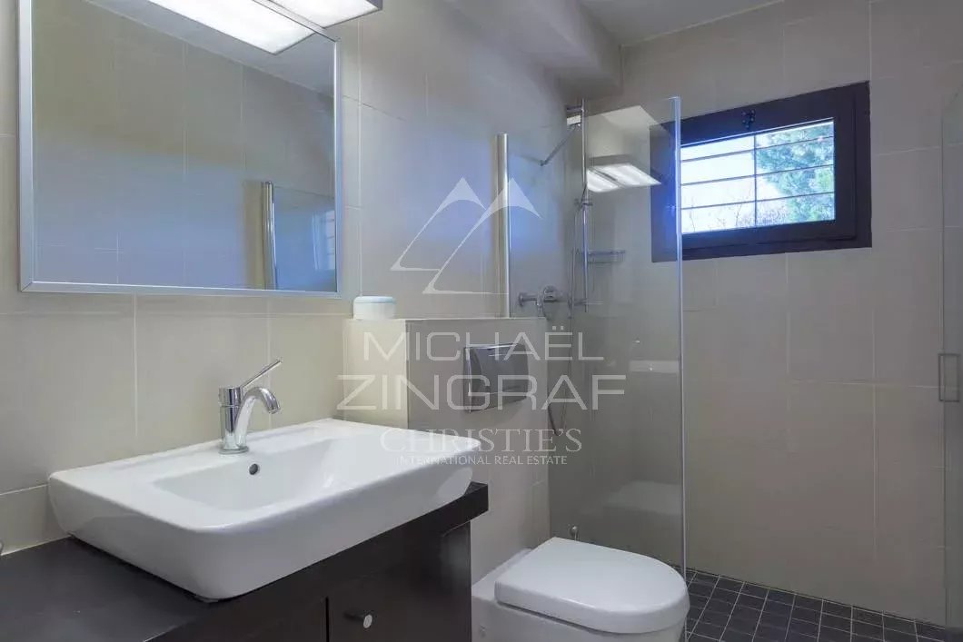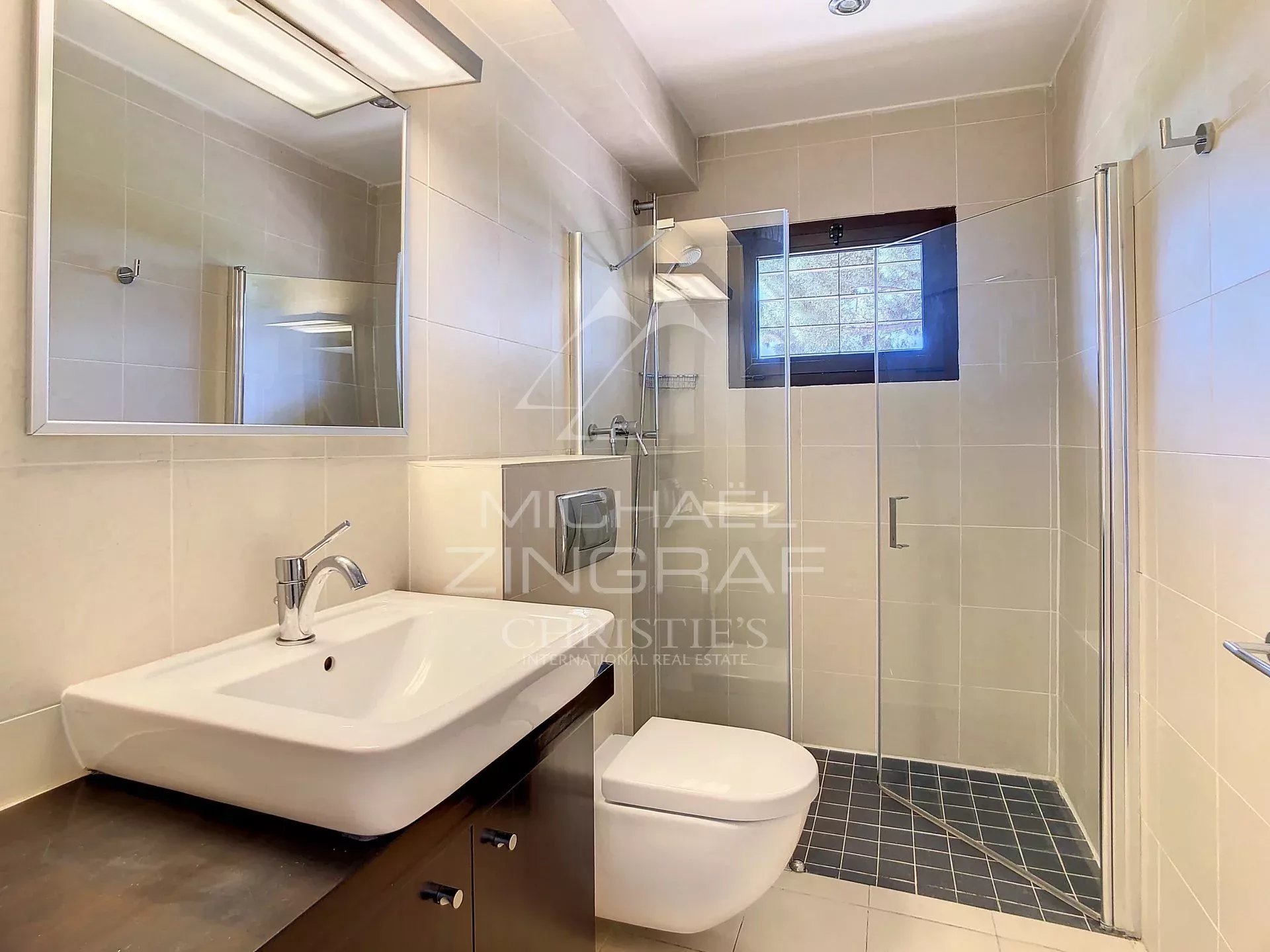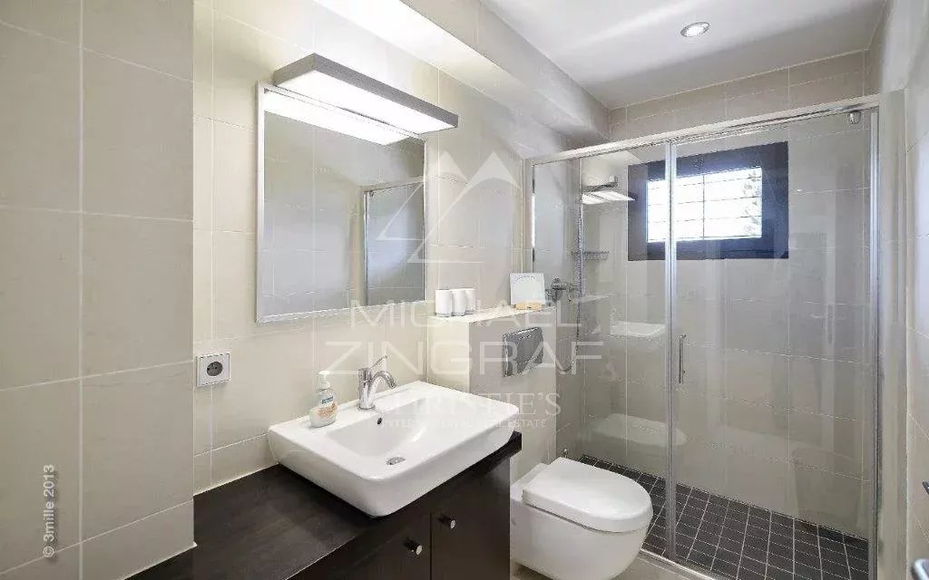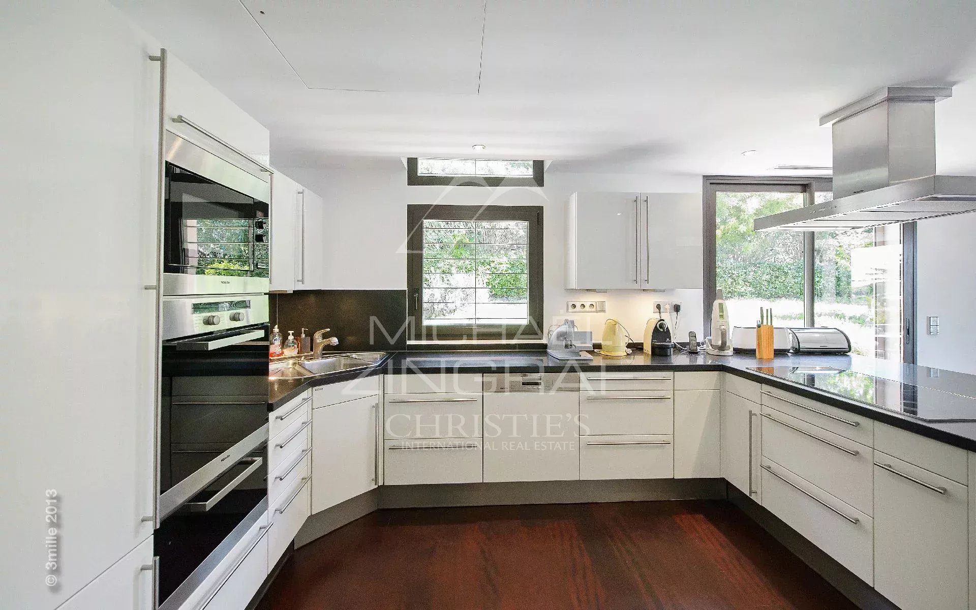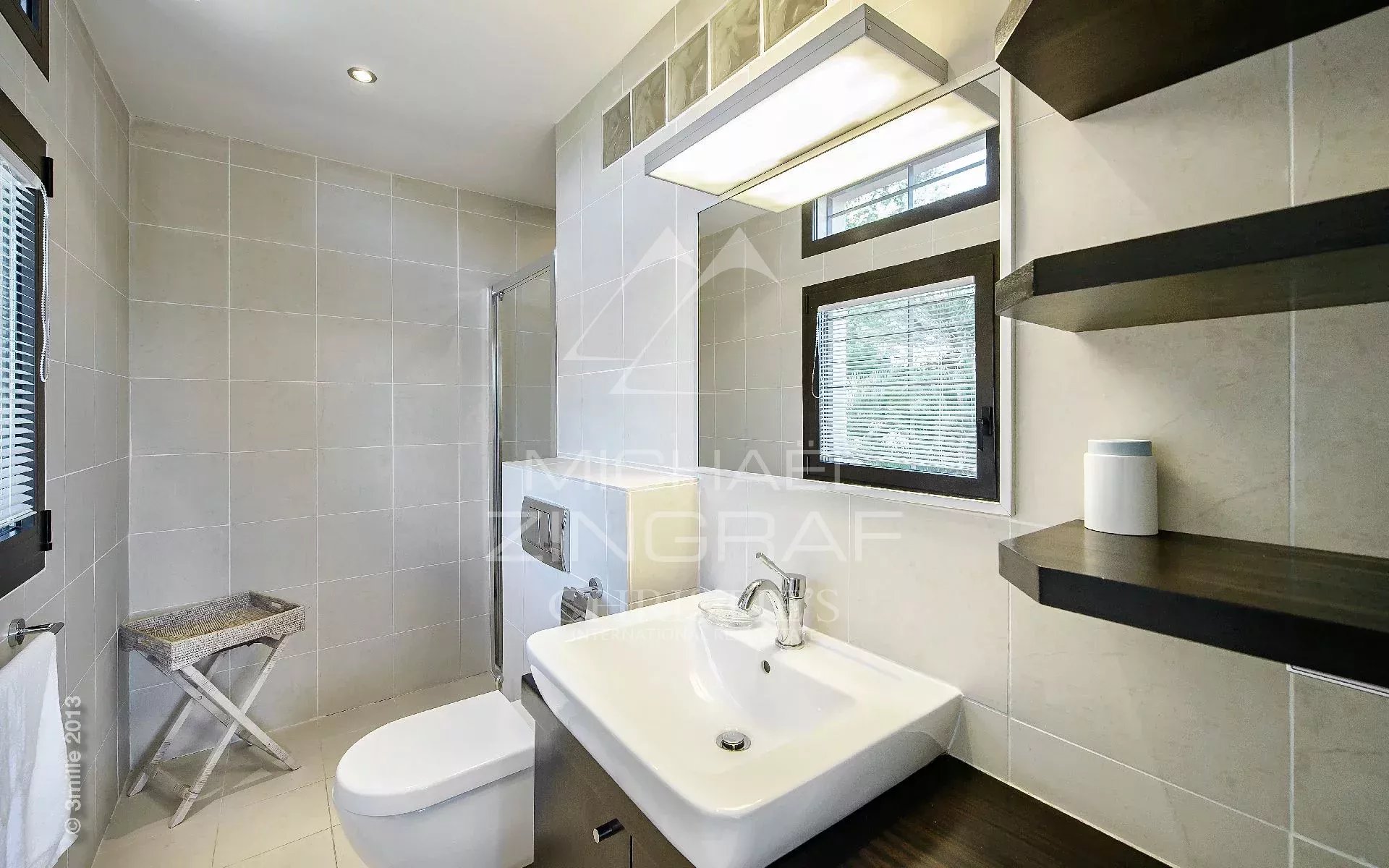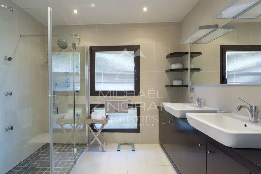 Contemporary villa of approximately 350 sq m, comprising a living room, a dining room, an open kitchen, and an en-suite bedroom. Upstairs, there is a master bedroom and an en-suite bedroom with bathroom. Two additional bedrooms are located on the garden level. Laundry room, and a caretaker couple are on site in the outbuilding.