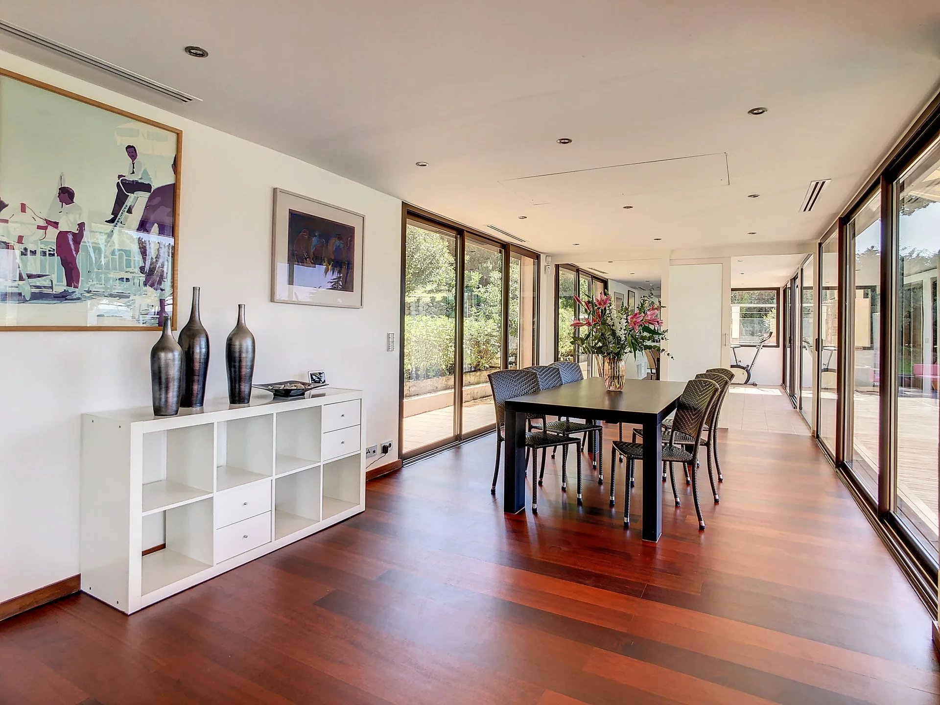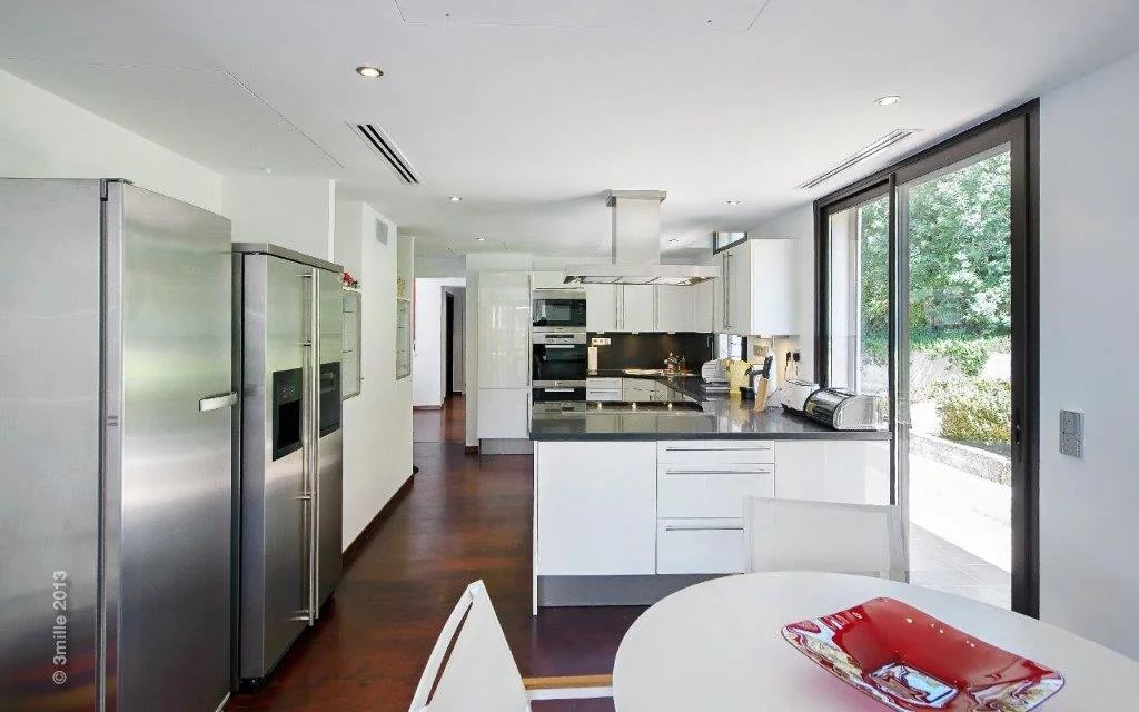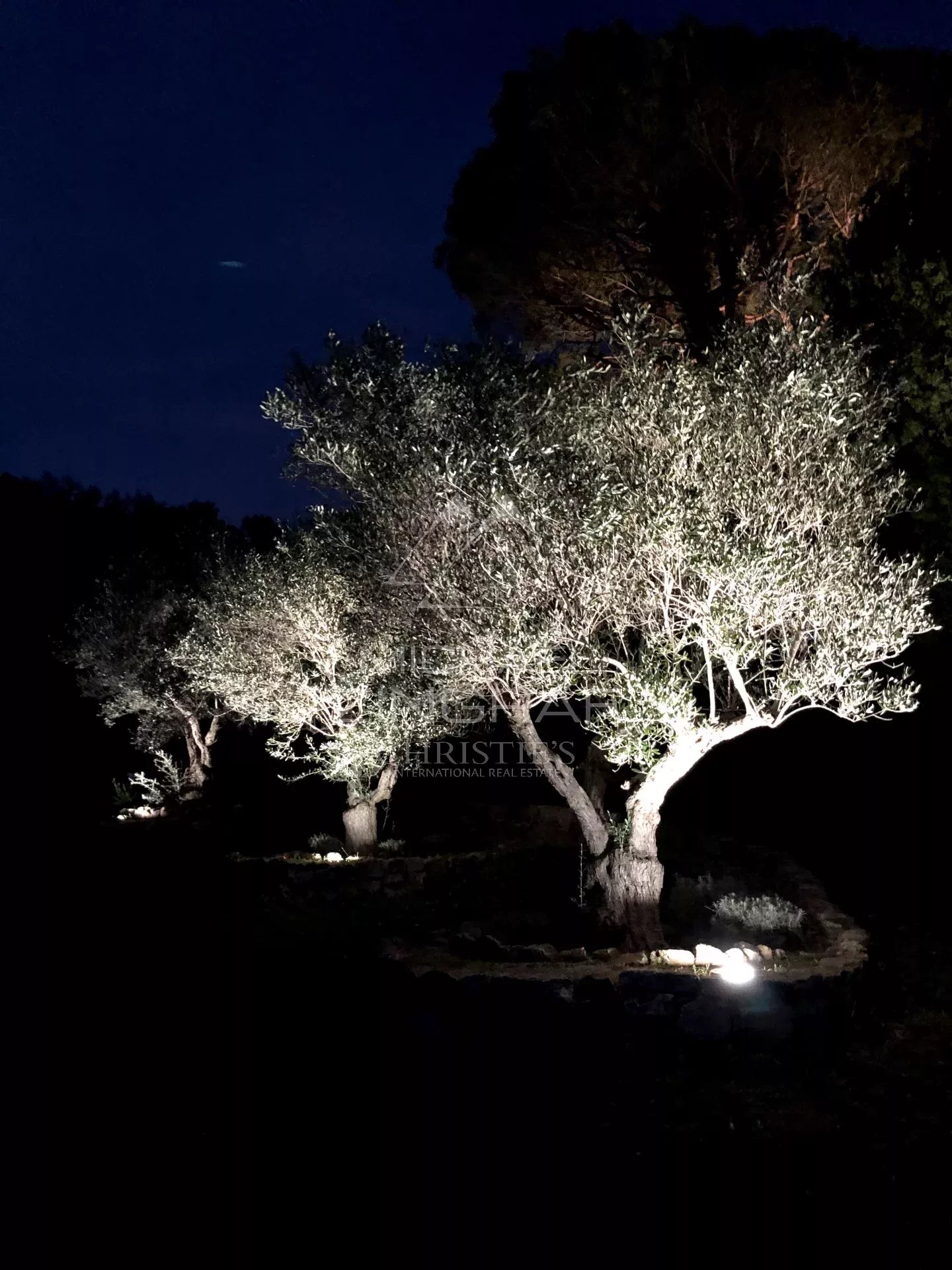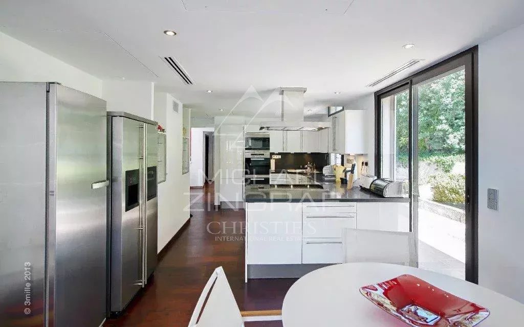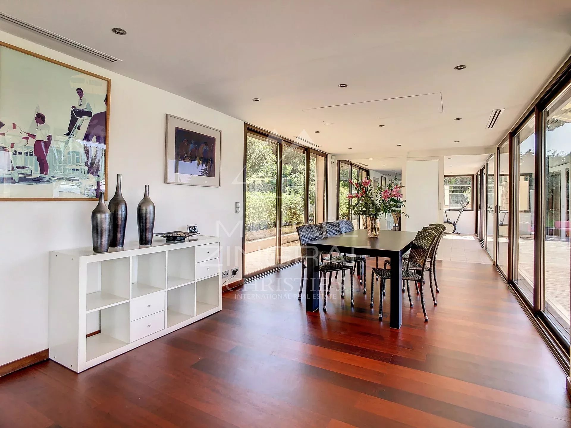 Contemporary villa of approximately 350 sq m, comprising a living room, a dining room, an open kitchen, and an en-suite bedroom. Upstairs, there is a master bedroom and an en-suite bedroom with bathroom. Two additional bedrooms are located on the garden level. Laundry room, and a caretaker couple are on site in the outbuilding.