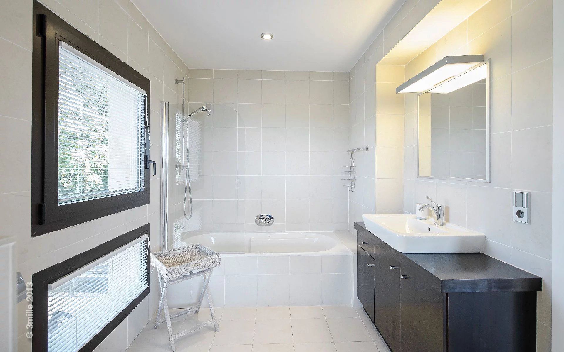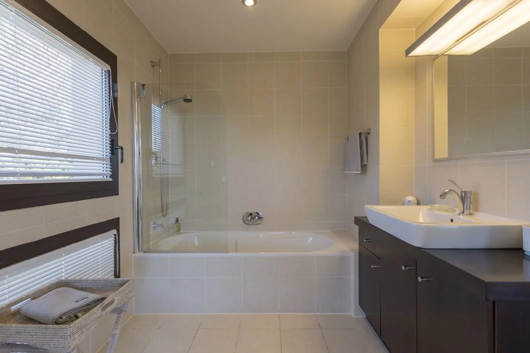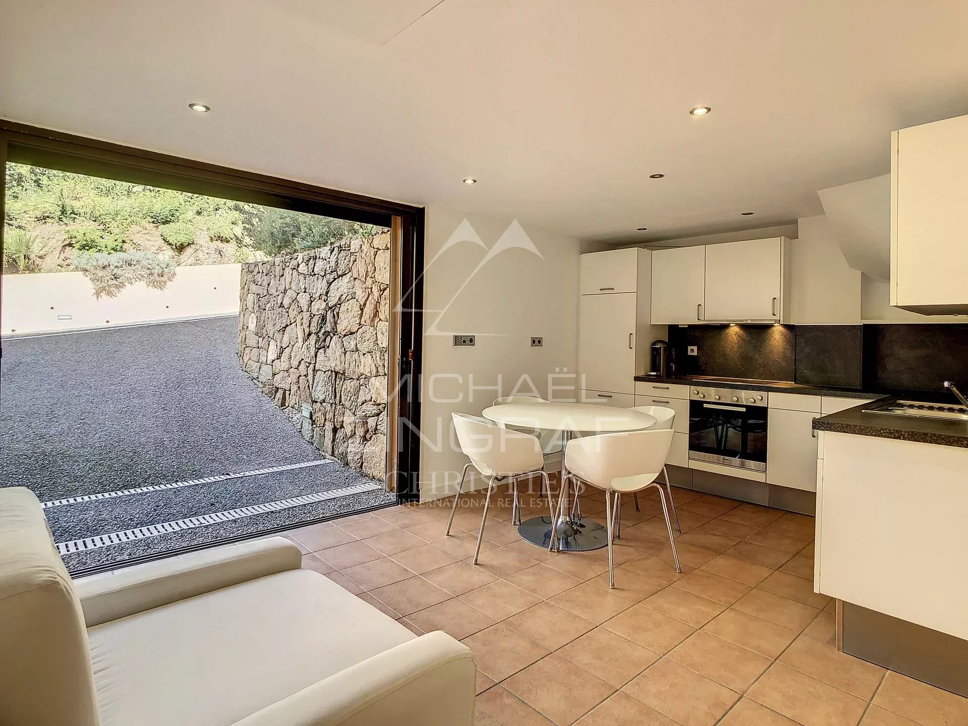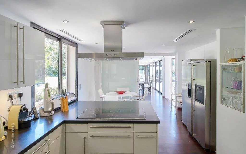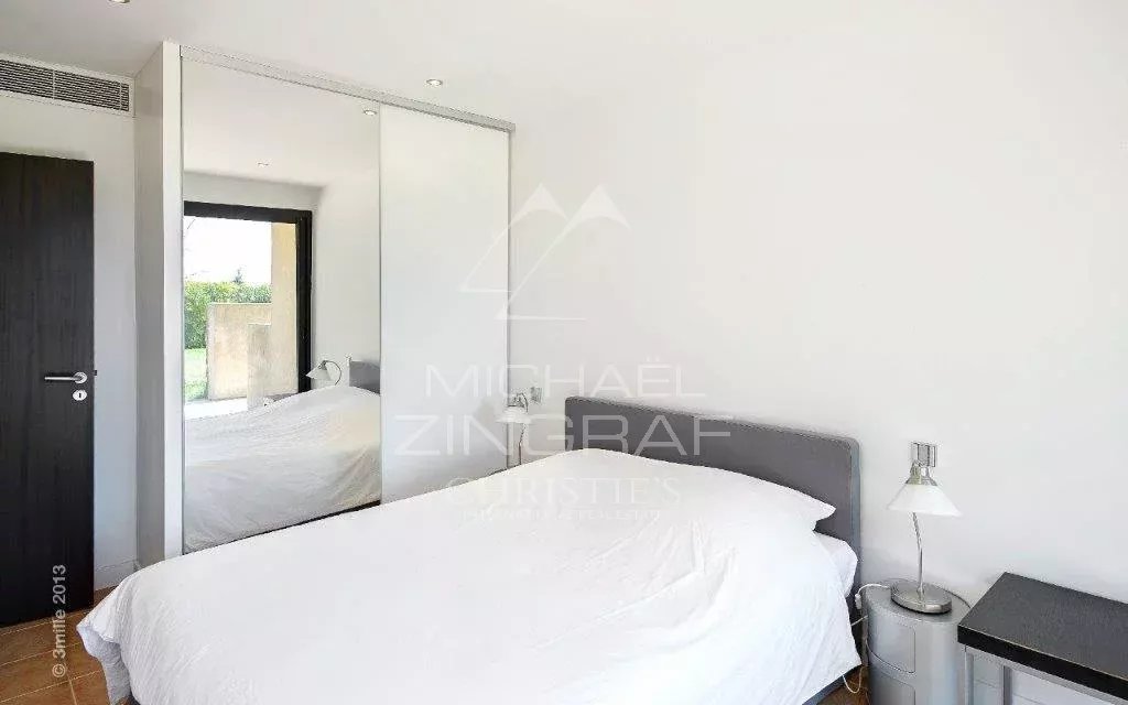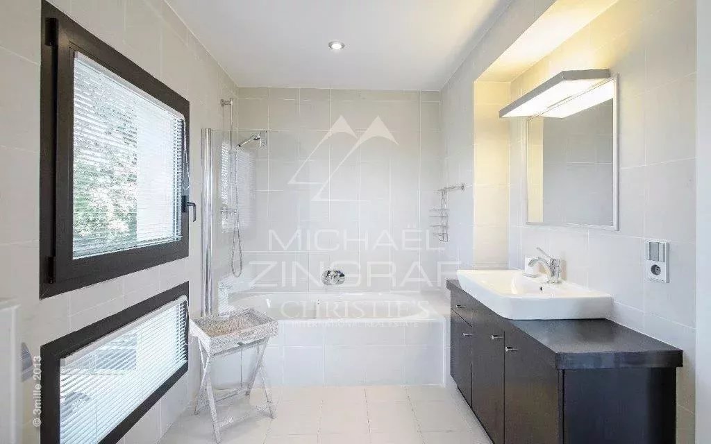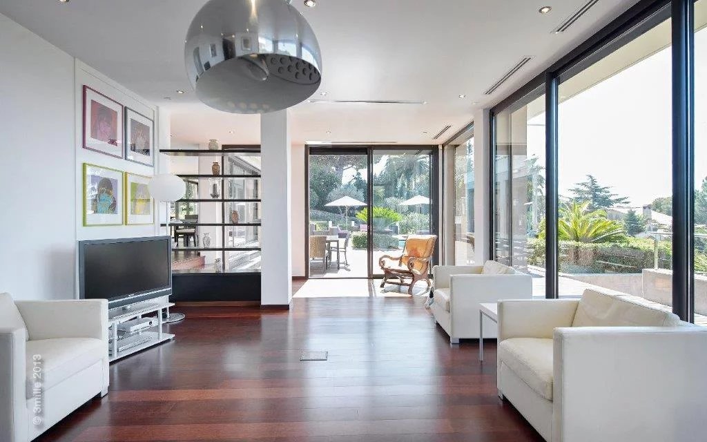 Contemporary villa of approximately 350 sq m, comprising a living room, a dining room, an open kitchen, and an en-suite bedroom. Upstairs, there is a master bedroom and an en-suite bedroom with bathroom. Two additional bedrooms are located on the garden level. Laundry room, and a caretaker couple are on site in the outbuilding.