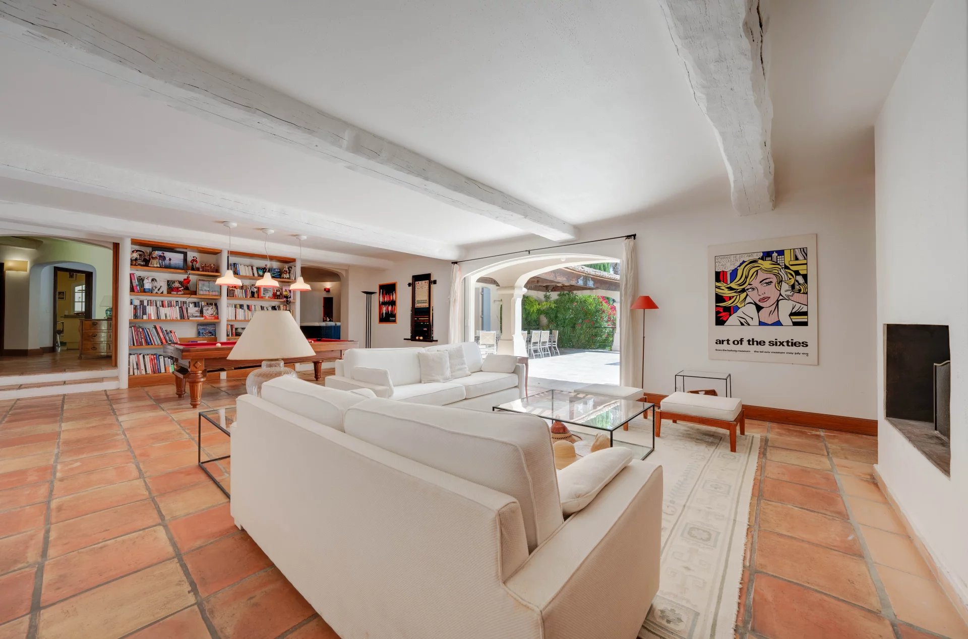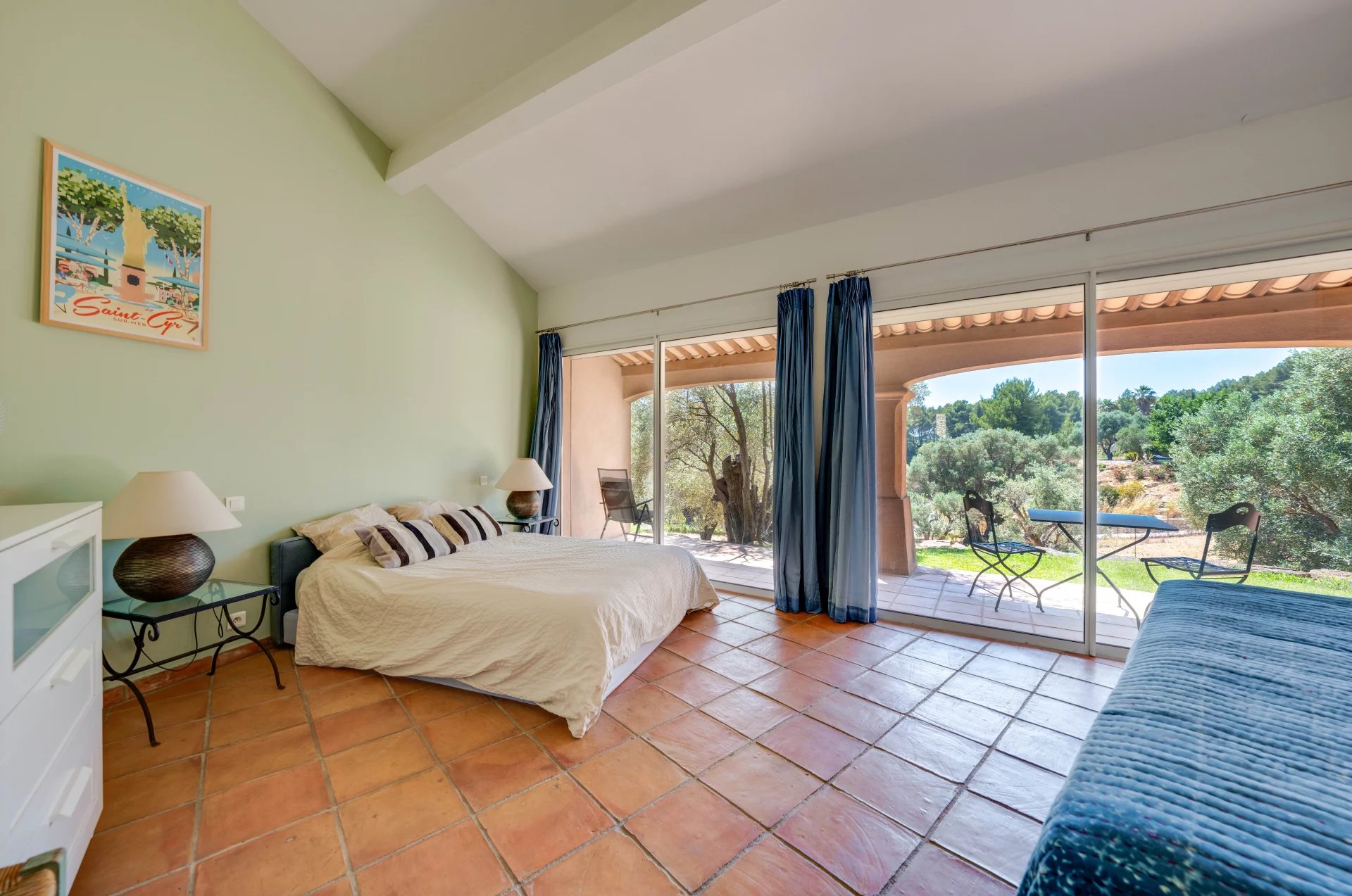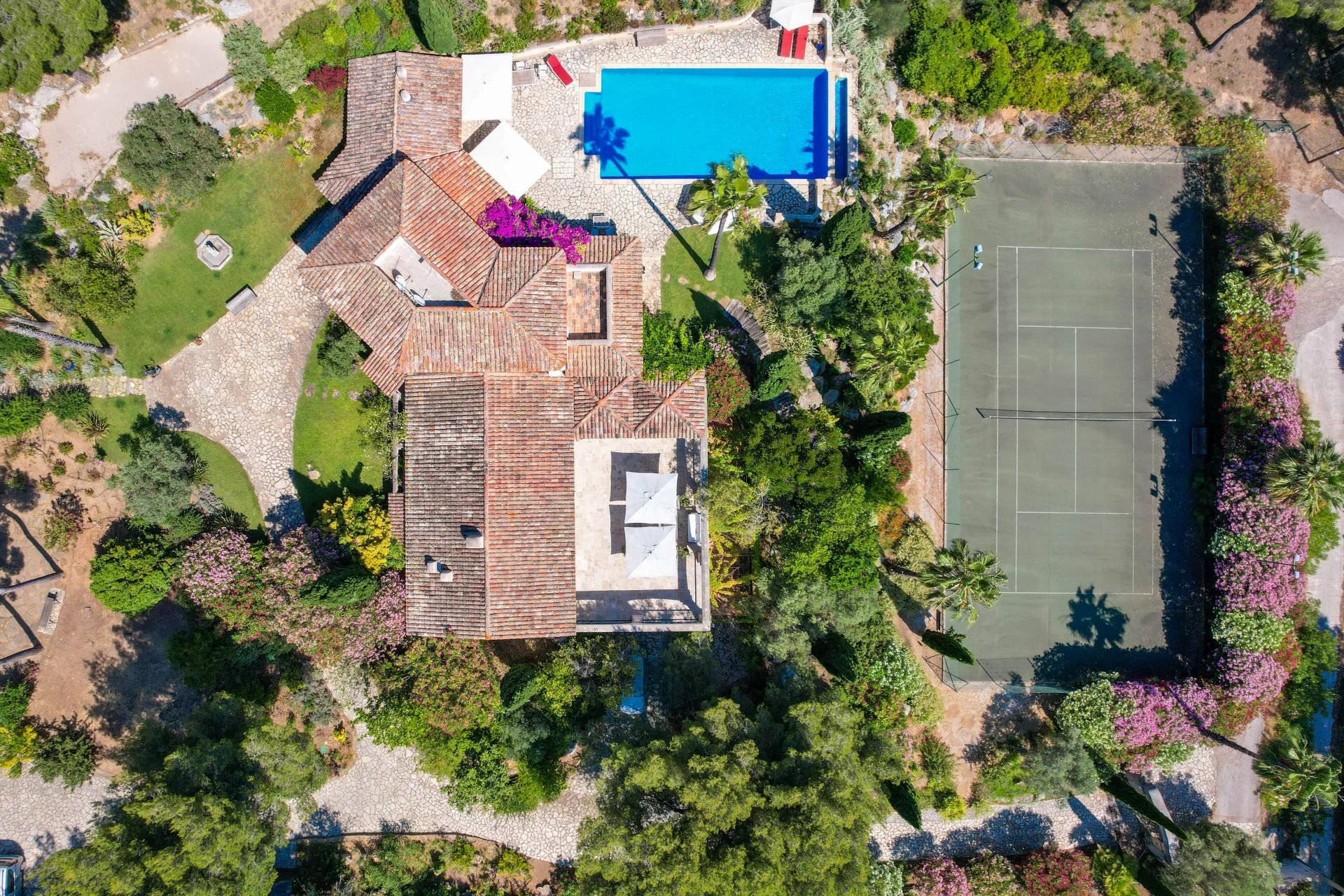 The main house, approximately 380 m² on three levels, is refined and bright. It offers generous reception areas with a vast living room, a welcoming dining room, an intimate lounge, and a fully equipped kitchen. The sleeping area features five bedrooms with their own bathrooms and toilets, accessed by beautiful terraces with views of the surrounding countryside. Outside, an infinity pool, a summer kitchen area, a private tennis court, and vast shaded terraces extend this outdoor lifestyle.