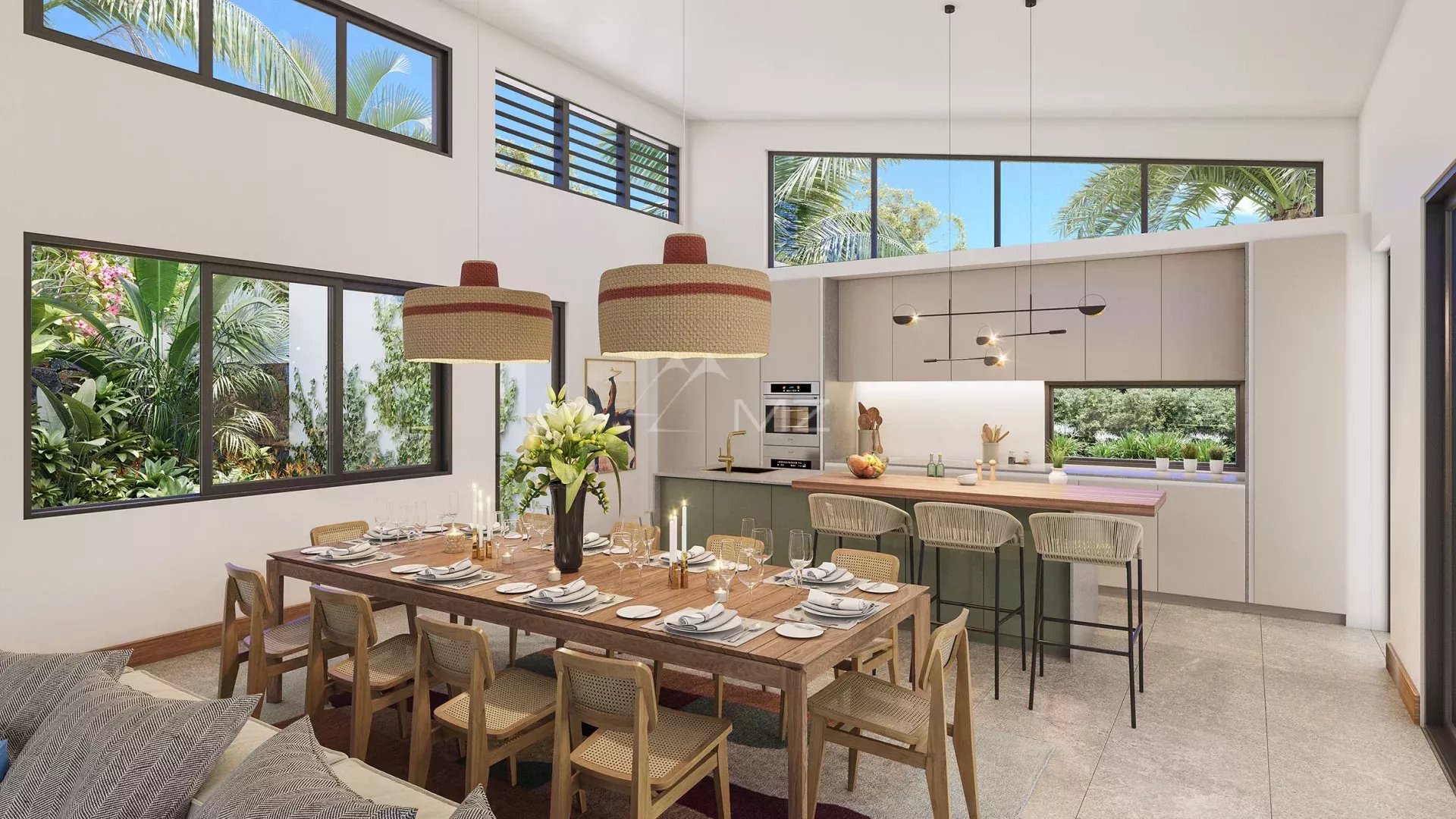 Each single-storey villa has its own private swimming pool and large landscaped garden. Taking care of design as much as comfort, these intimate villas are all enveloped in lush vegetation illustrated by tropical gardens bathed in sunlight, giving pride of place to daylight and sunsets. The design based on raw material contributes to a feeling of fullness in harmony with nature.