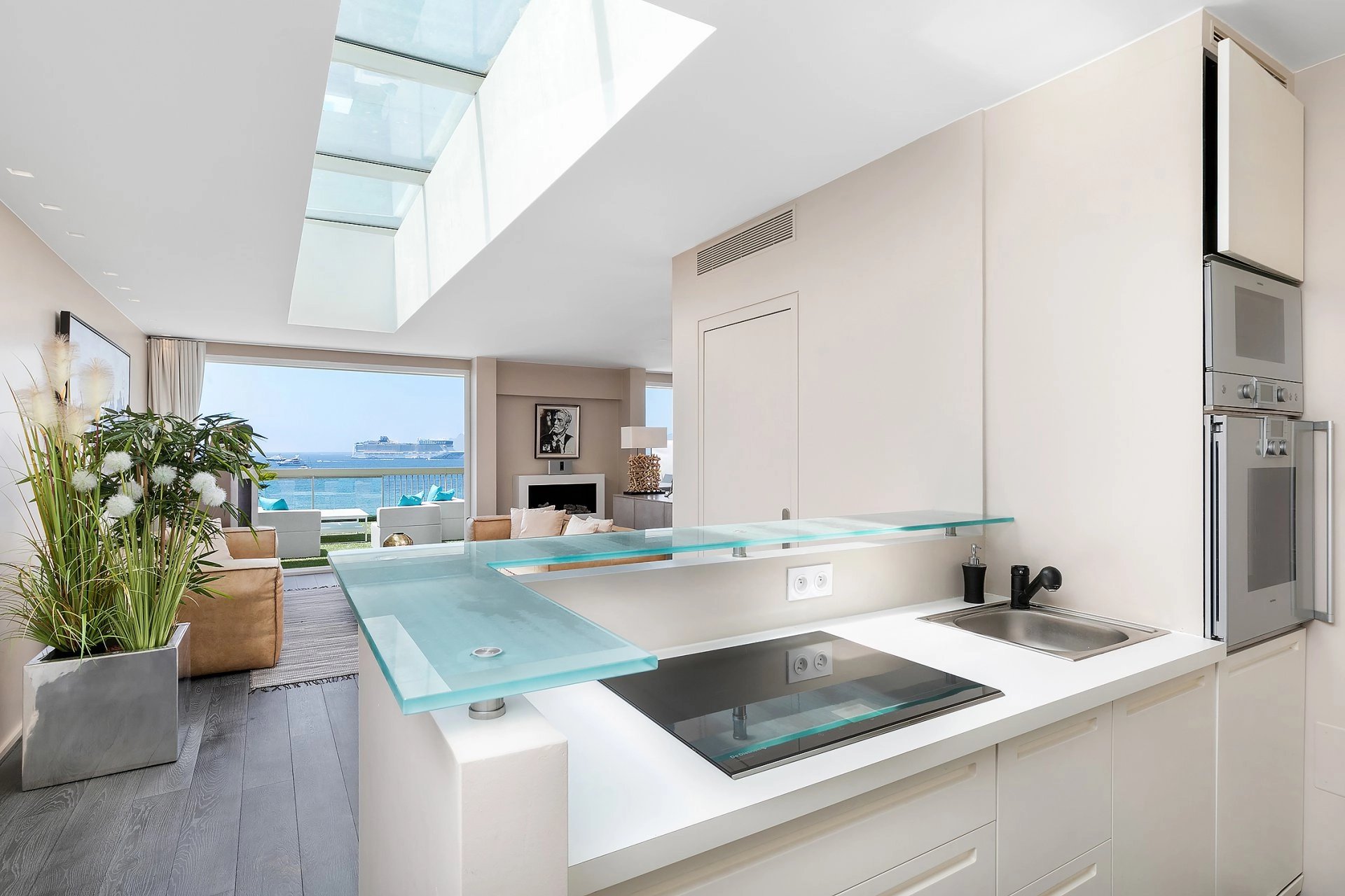 Ideally located on the Croisette, this luxurious 89m2 flat benefits from a large 44m2 terrace and panoramic sea views across the bay. Spacious entrance hall, living room with fully-equipped open-plan...