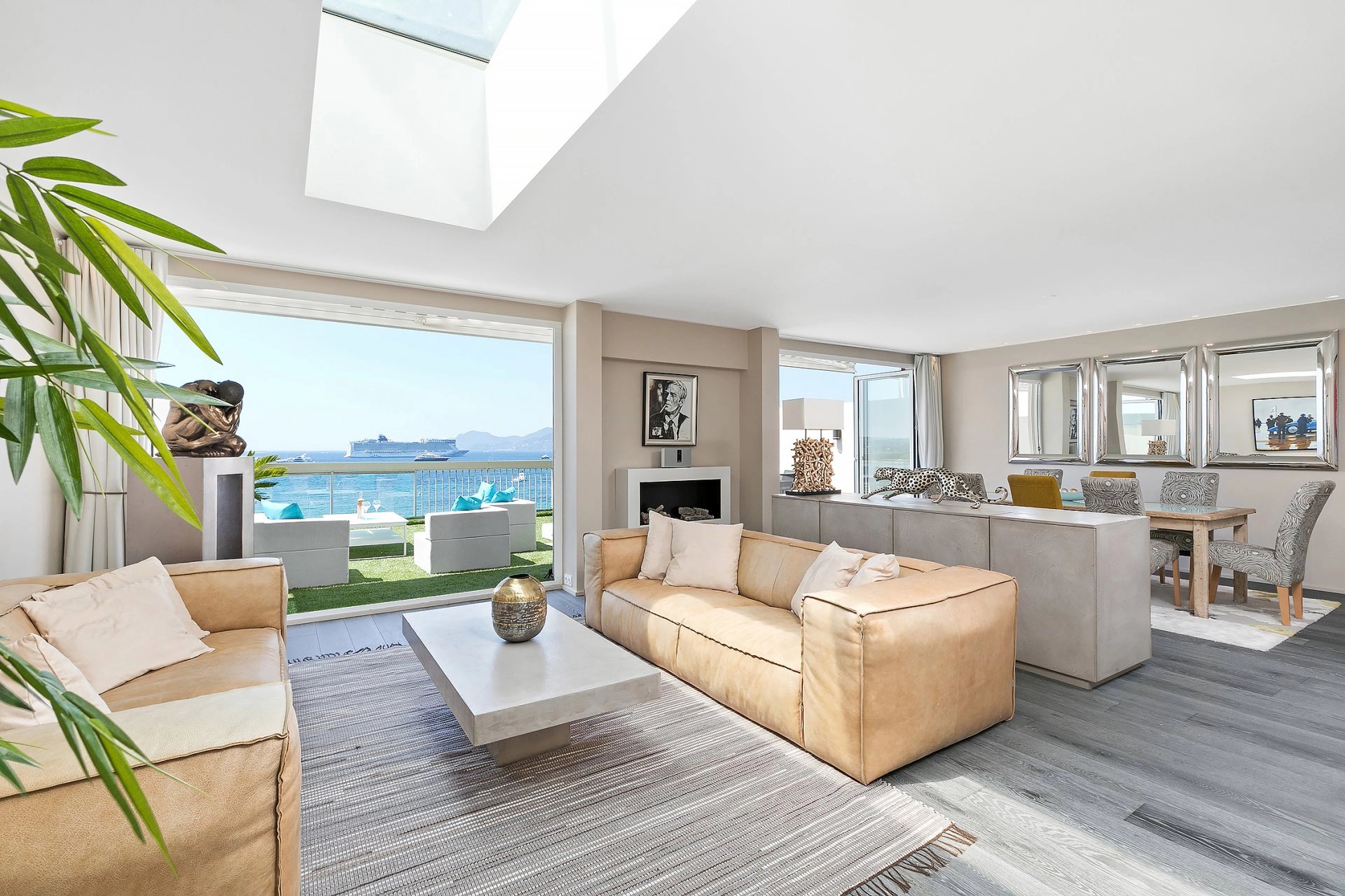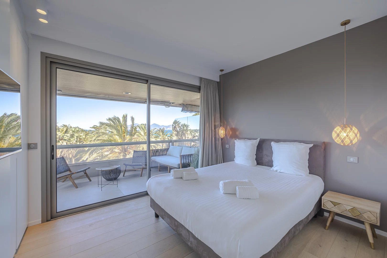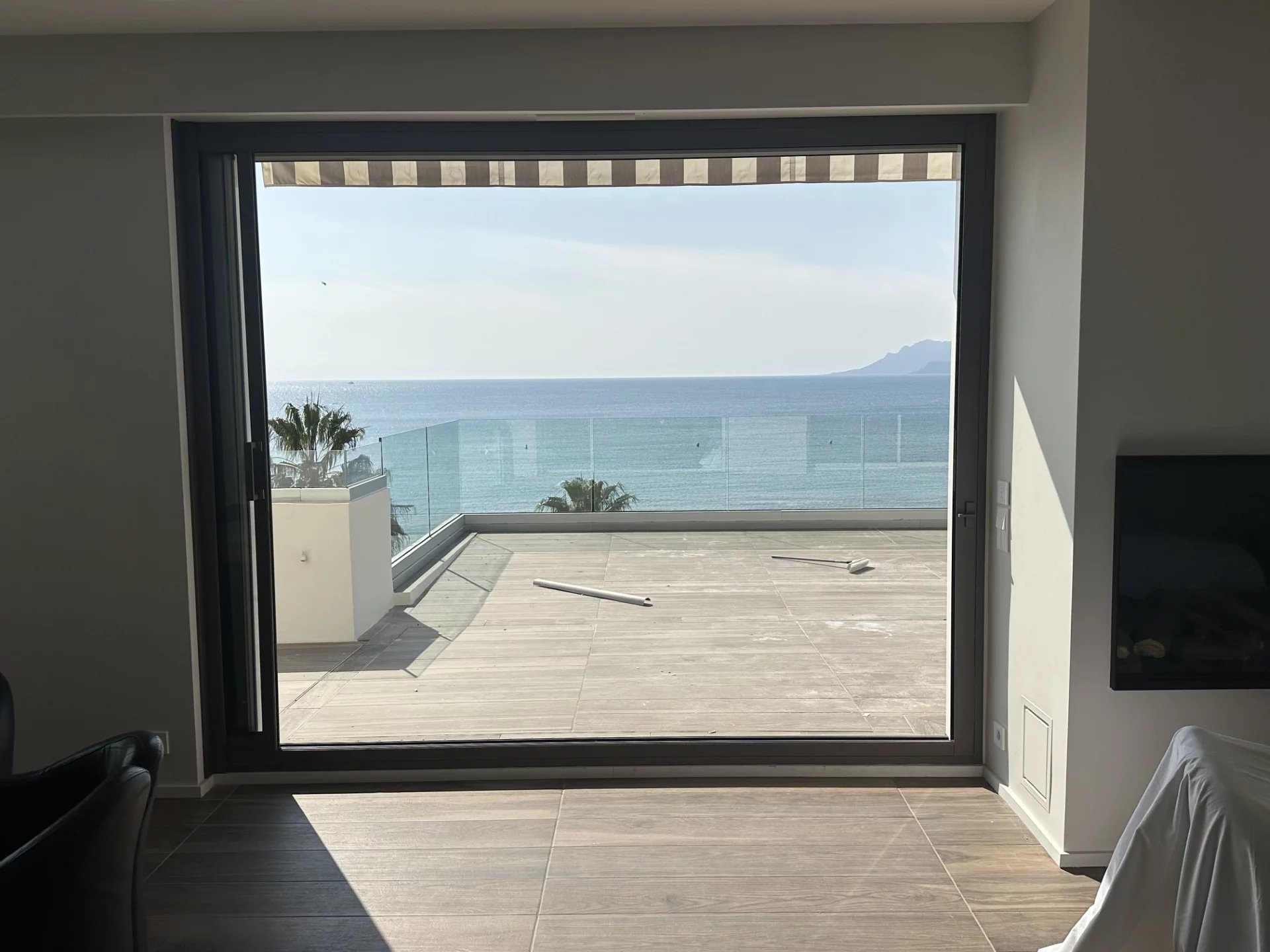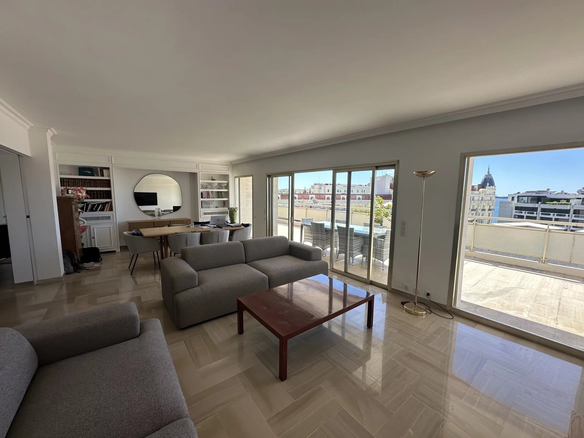 Completely renovated, this 90m² apartment offers a beautiful 27m² terrace with sea view and is located a few minutes walk from the Palais des Festivals. It includes: a living room...