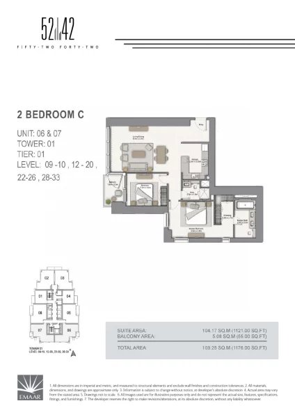 - Size - Suite area 1,121 Sq.ft. & Balcony 55 Sq.ft. Total area - 1,176 Sq.ft ( 109.2 Sqm )
