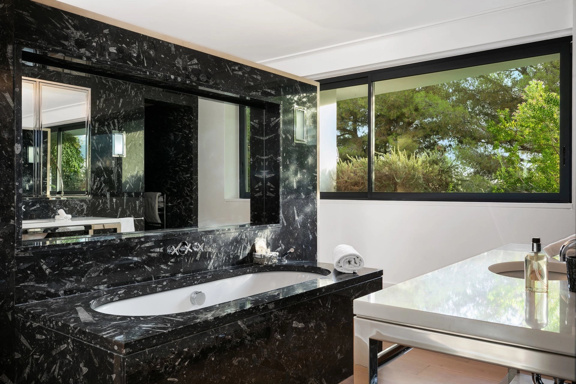 With 1,250 m² of living space, the main villa features five exquisite suites, each with its own en-suite bathroom, designed for ultimate comfort and privacy. The expansive living areas open onto sun-drenched terraces, providing stunning sea views.