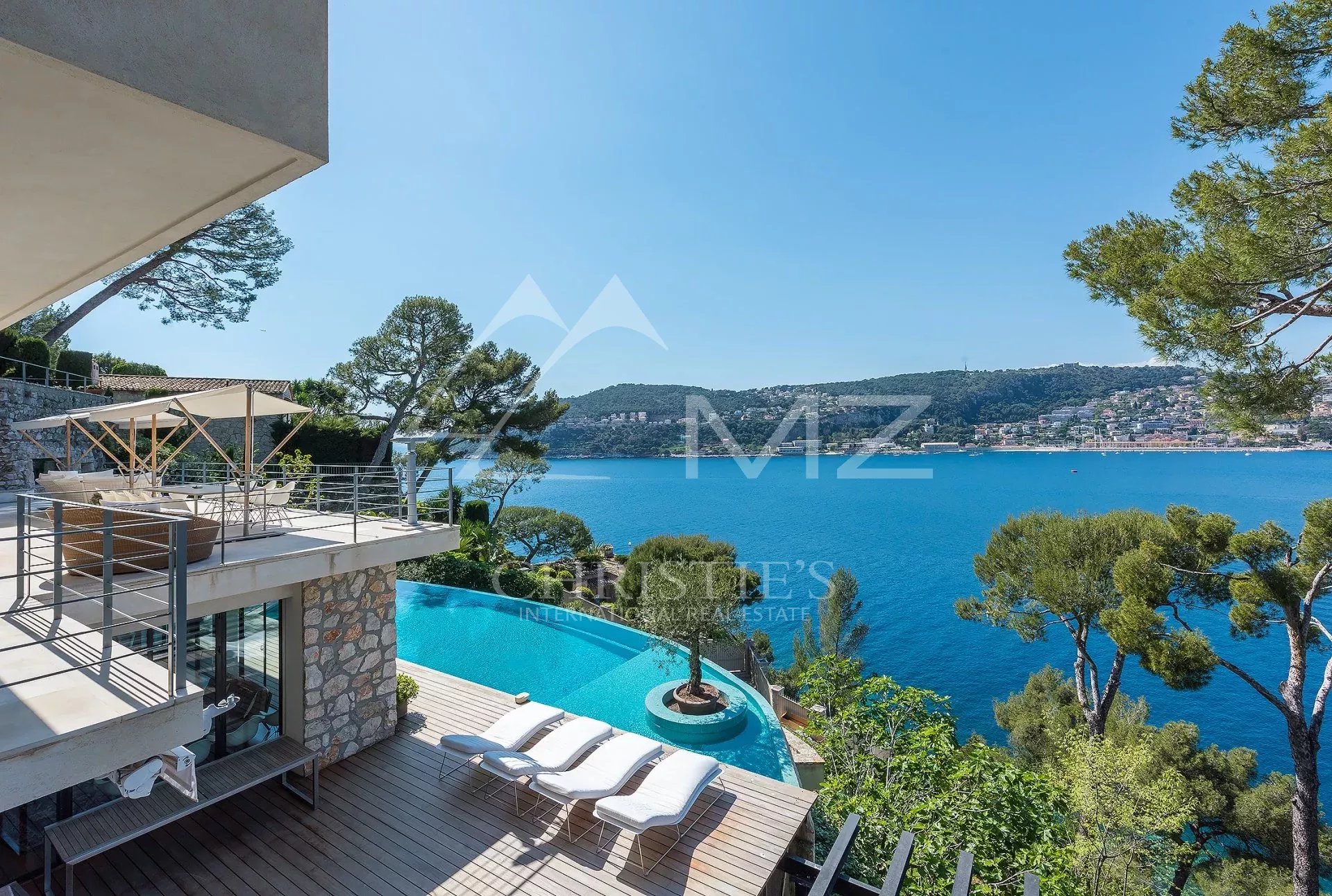 Located in a calm area on the West side of the Cap Ferrat peninsula, superb contemporary villa with stunning sea view. Only few steps from the beaches and with direct access to the sea by pedestrian path, this property is composed of a large living/dining room, open fitted kitchen, opening onto large terrace with exterior dining area for 12 people. 4 bedrooms with en-suite bath or shower rooms, 2 studio with independent entrance, cinema and gym. High quality appointments. Garden of approx. 1400 sqm with large teak beach and infinity pool. 4 parkings.