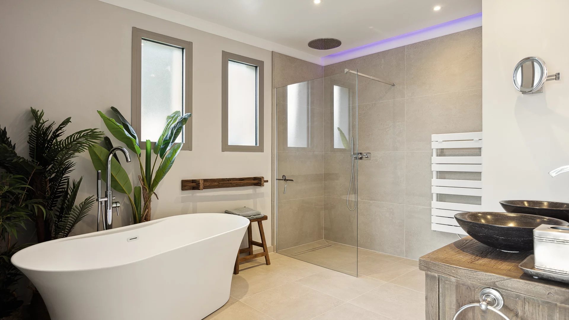 With its south-west exposure and optimal sunshine, its garden, mirror pool and terrace invite you to relax. It features 2 bedrooms with storage cupboards, each with private access to the outside, a 3rd en-suite bedroom with shower and toilet, and a beautiful master bedroom with en-suite bathroom, shower and bathtub, opened by a large bay window.