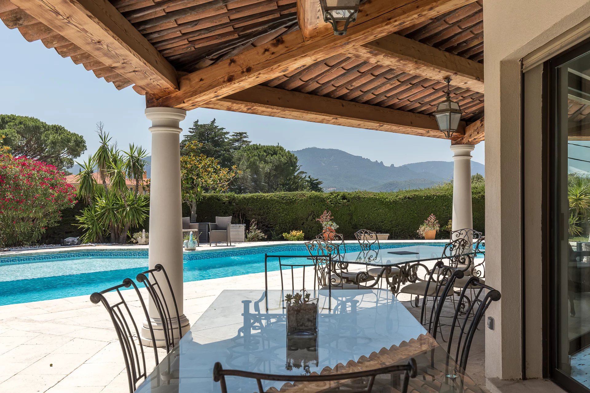 Extraordinary panoramic views for this south facing villa located just 15 minutes from the beaches of Mandelieu la Napoule and 30 minutes from Cannes Croisette. Large living room with semi-open...